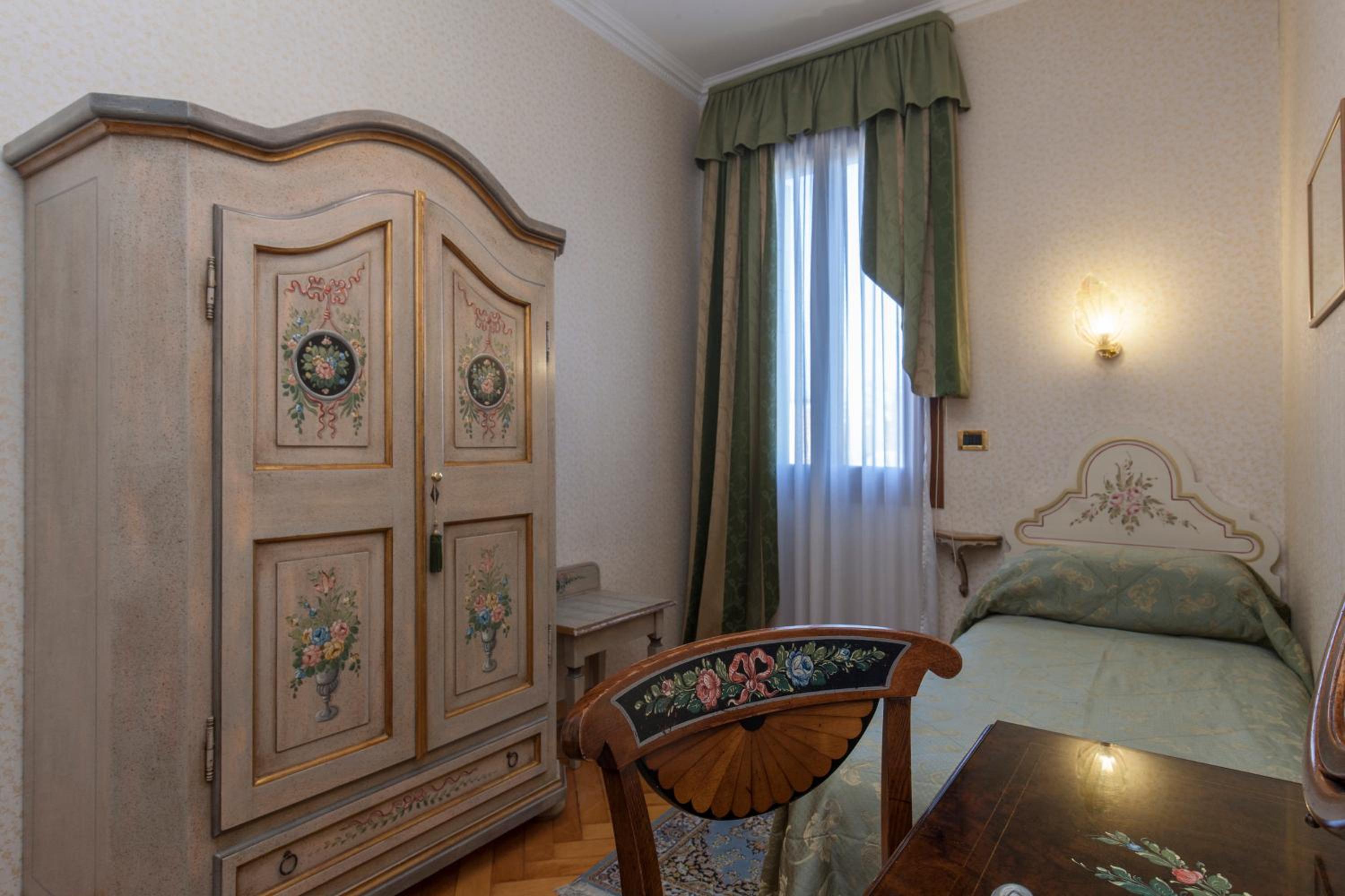 When I booked the room, I booked a single. Beside the option for a single room there were photos of this room. Wooden floors, a window on the lagoon and a single bed. What I got was a wall to wall carpeted room (which for a super-allergic person like me is a nightmare), a double bed and a window that opened to a dark inner Cortile (Well the window wouldn't even open and it looked so awful that it had shutters to hide the horrendous sight),