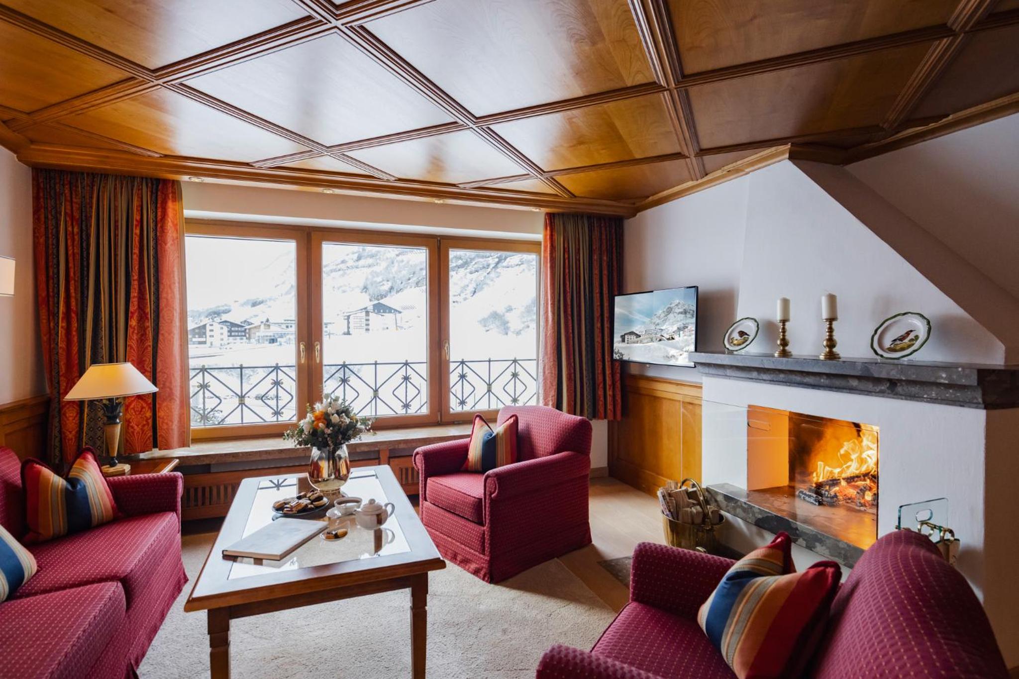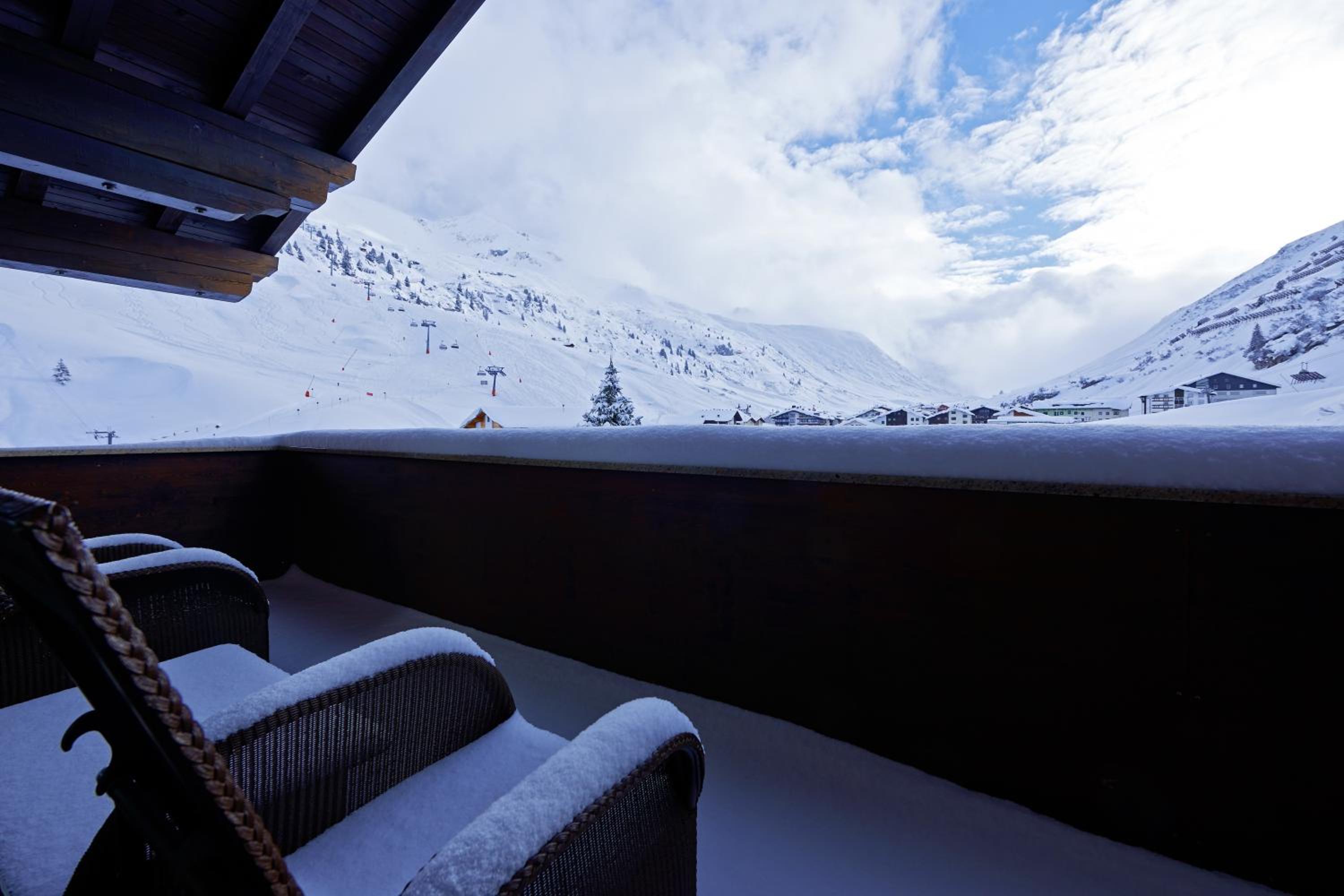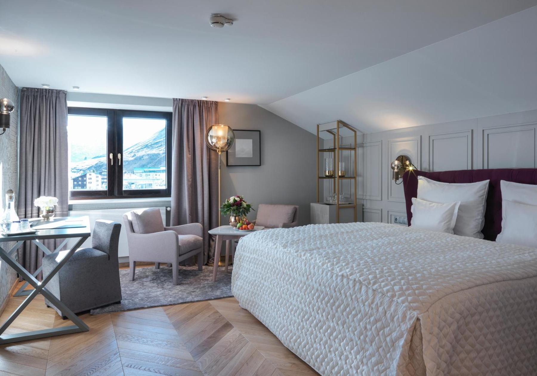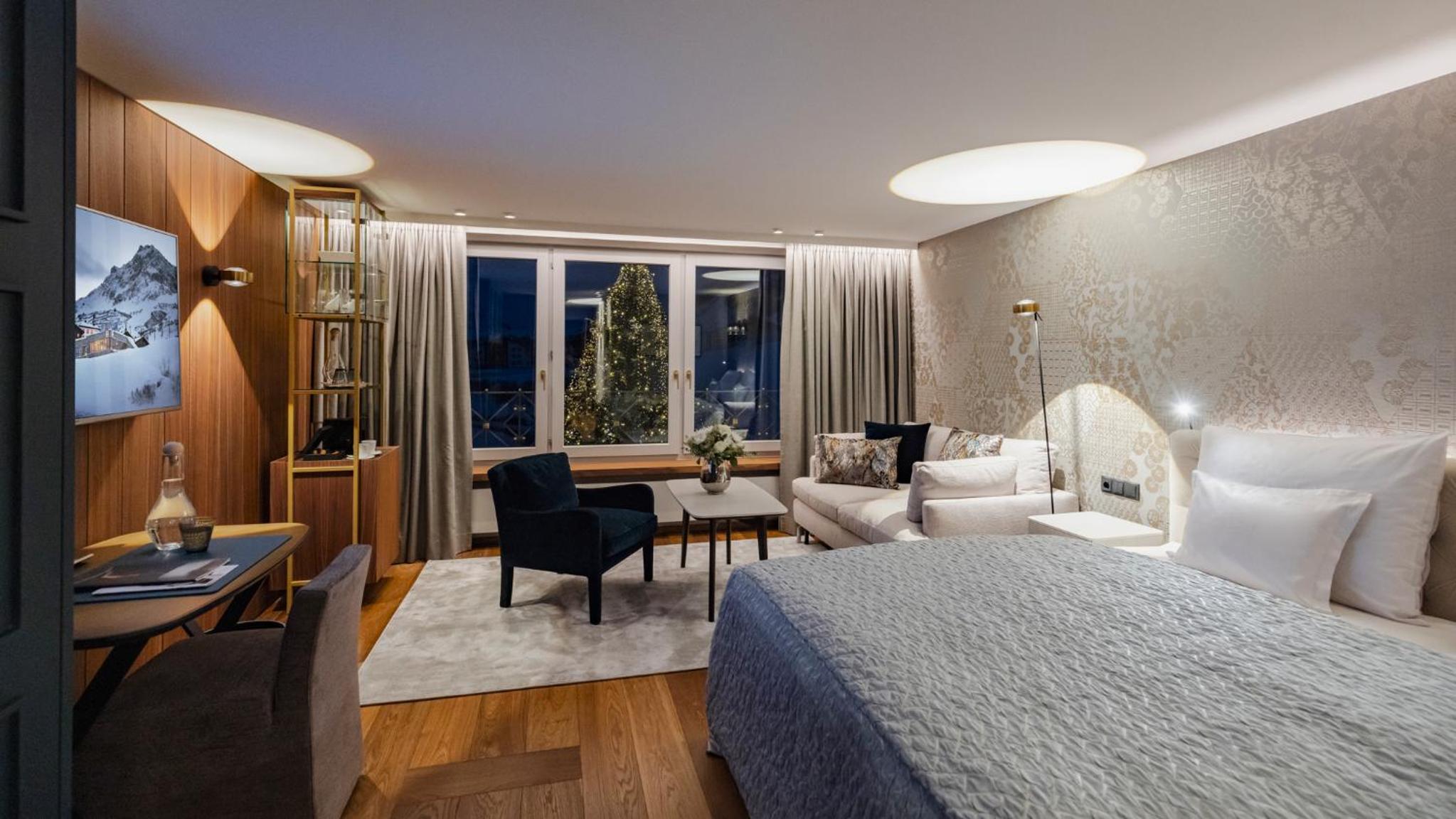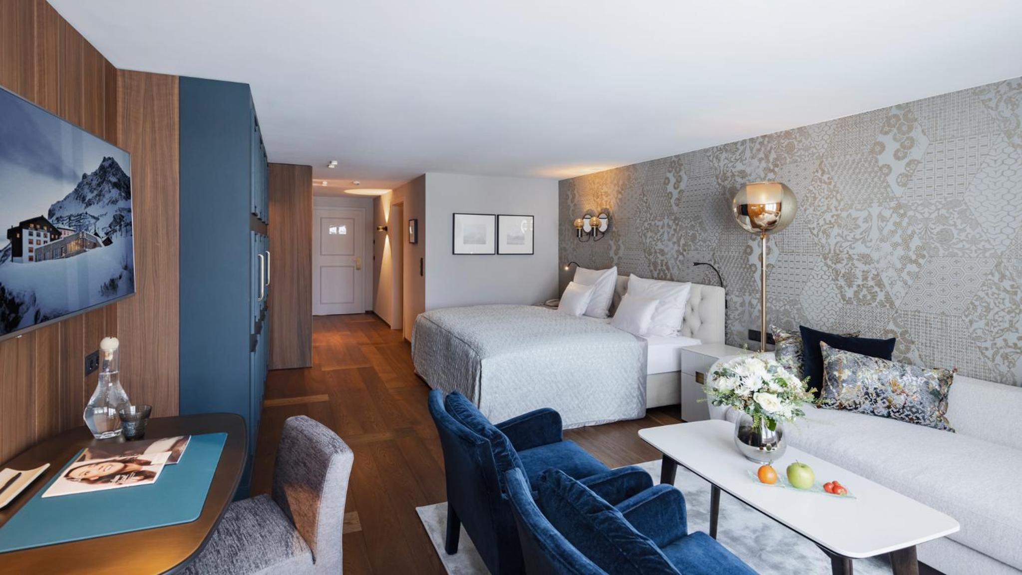 The Zürserhof, a 5-star superior hotel in Zürs, offers elegantly furnished rooms with breathtaking mountain views. Each room is equipped with modern amenities for a comfortable stay, including a flat-screen TV, minibar, and plush bathrobes.