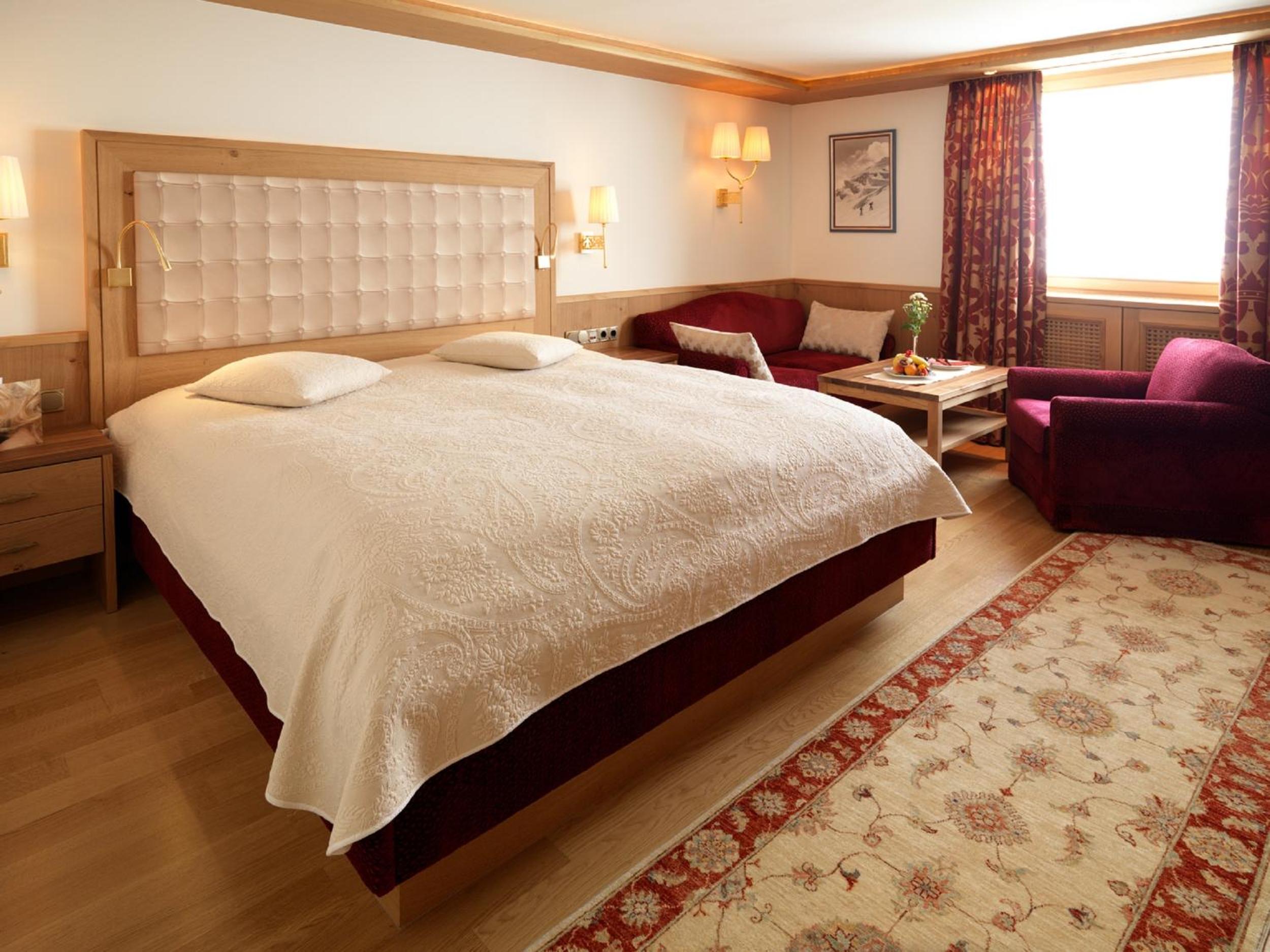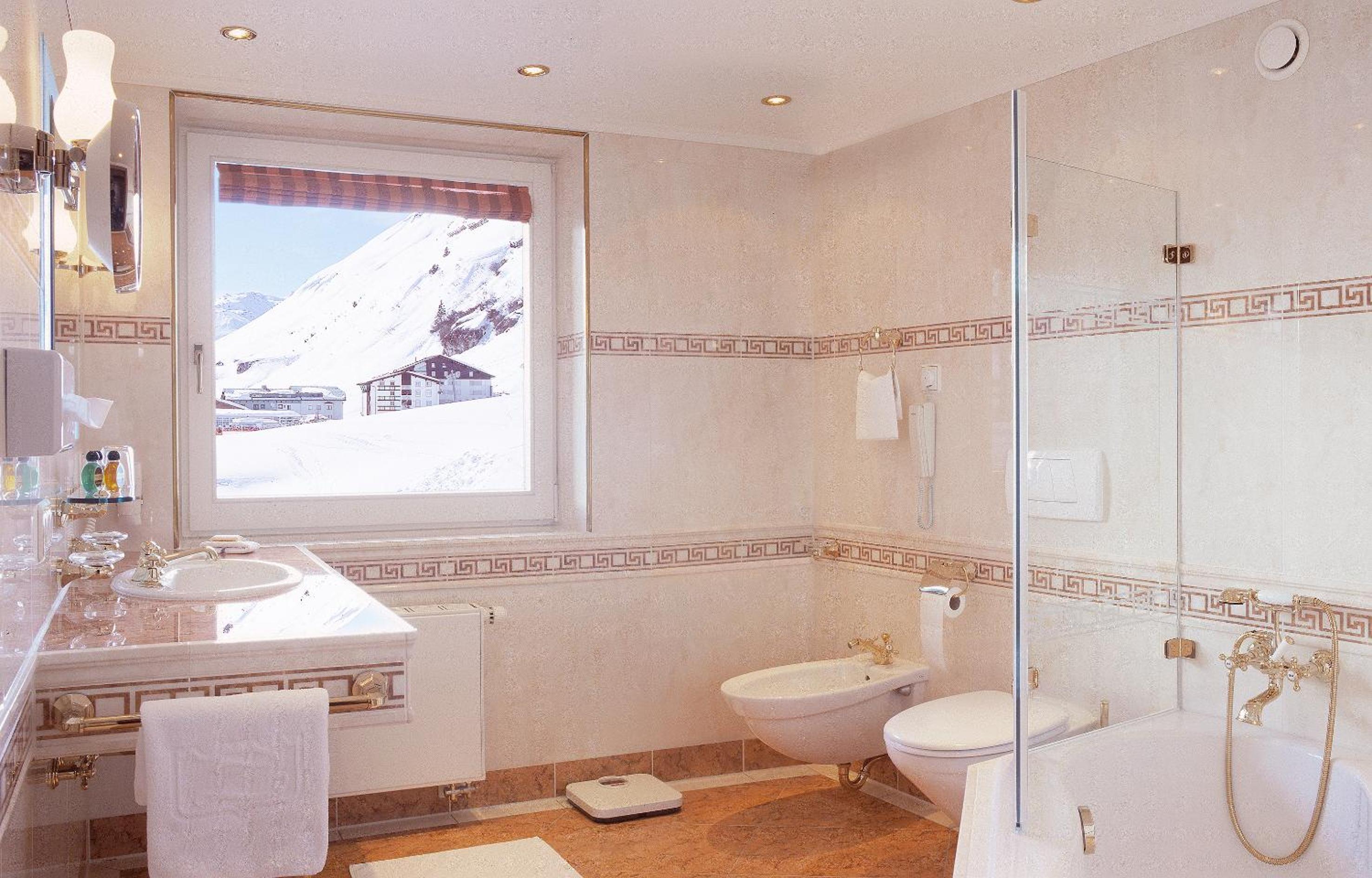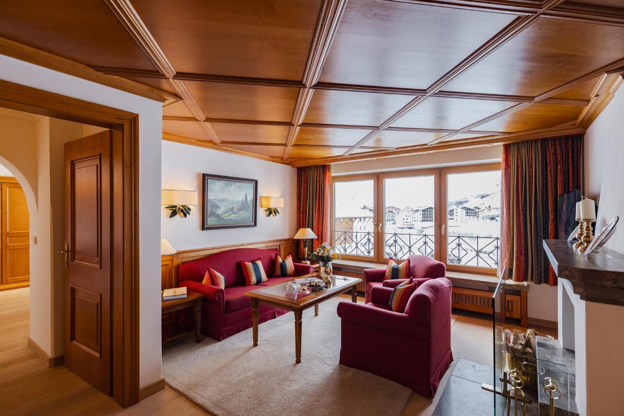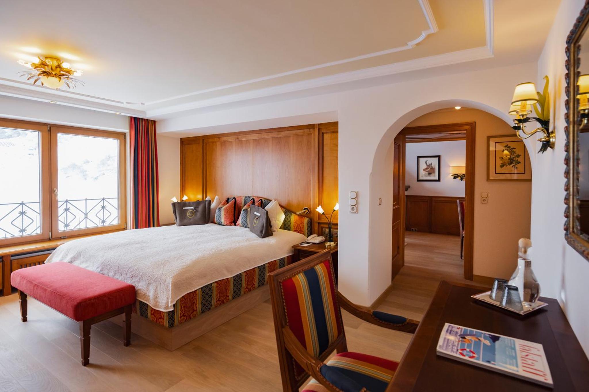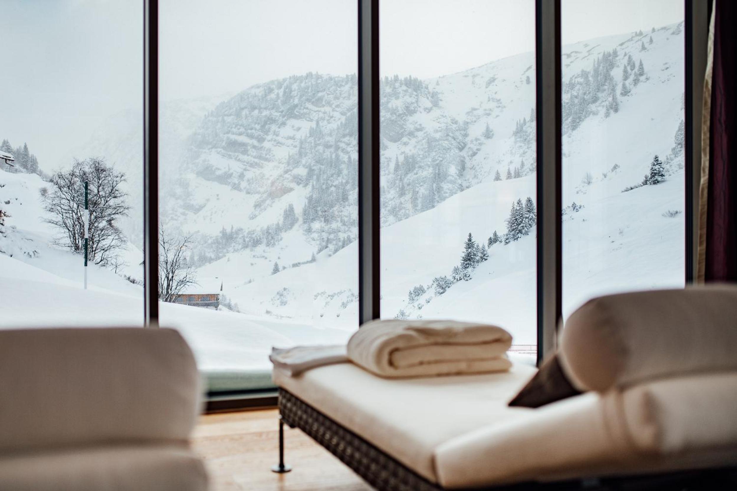 The Zürserhof, a 5-star superior hotel in Zürs, offers elegantly furnished rooms with breathtaking mountain views. Each room is equipped with modern amenities for a comfortable stay, including a flat-screen TV, minibar, and plush bathrobes.