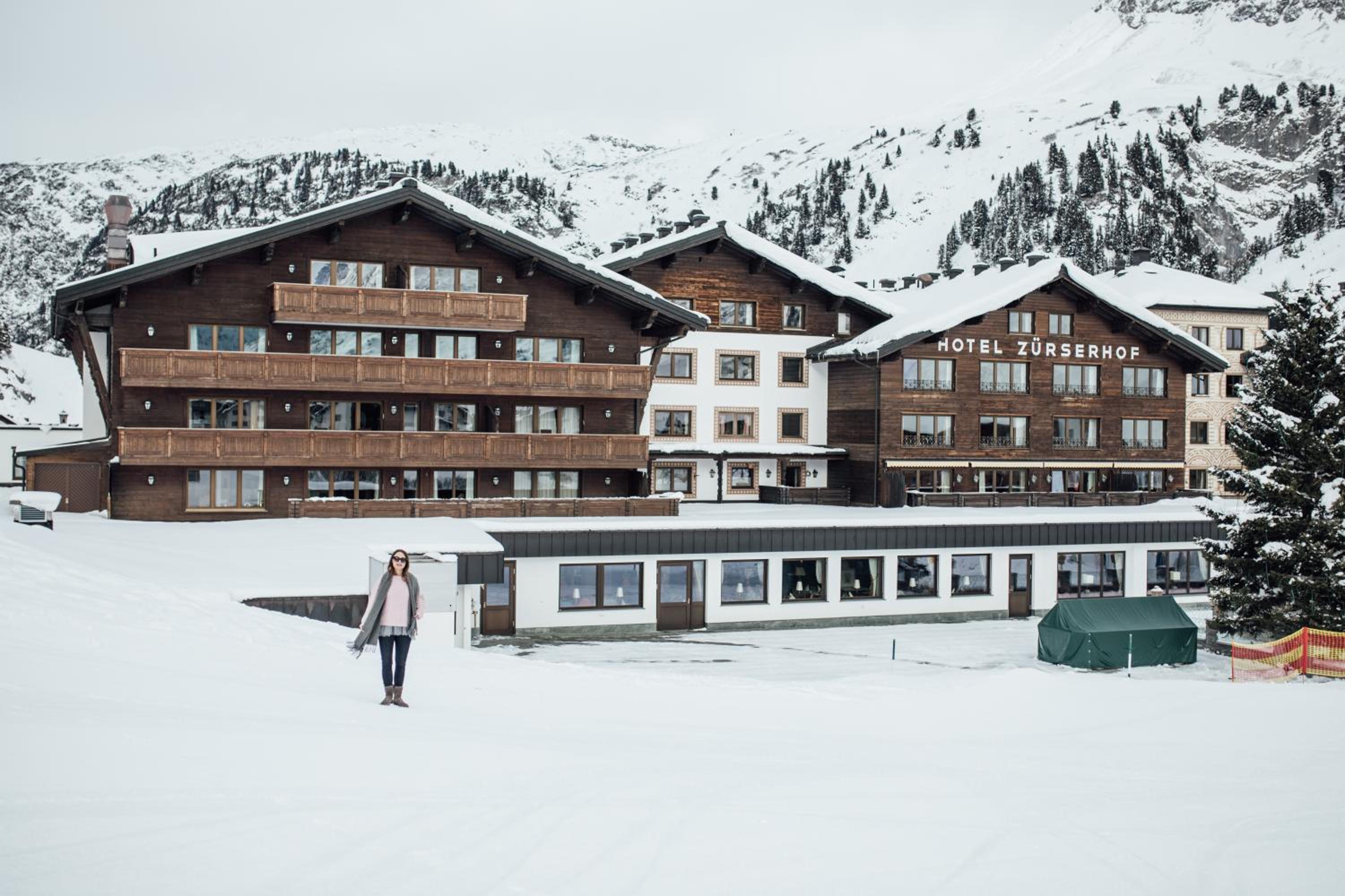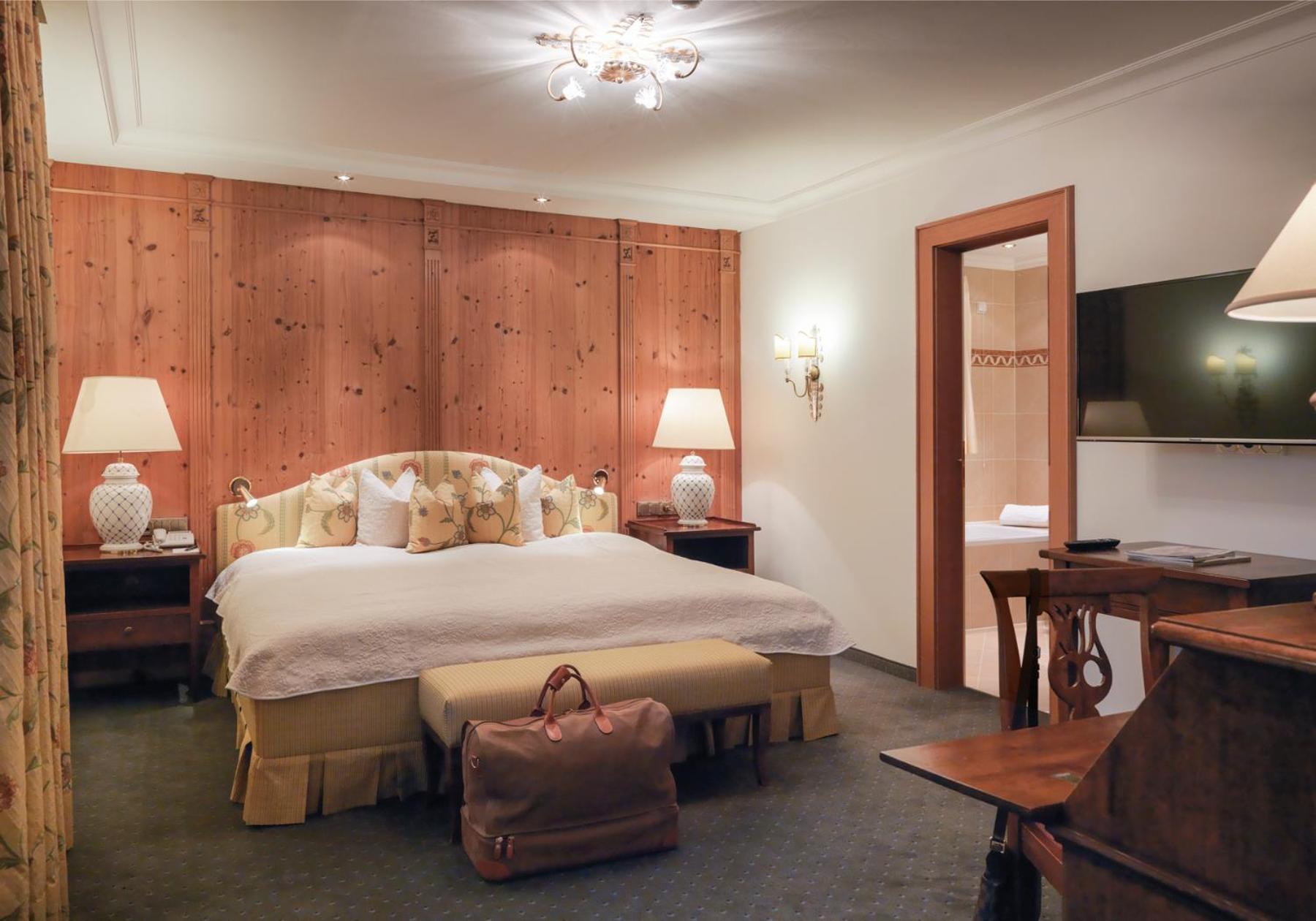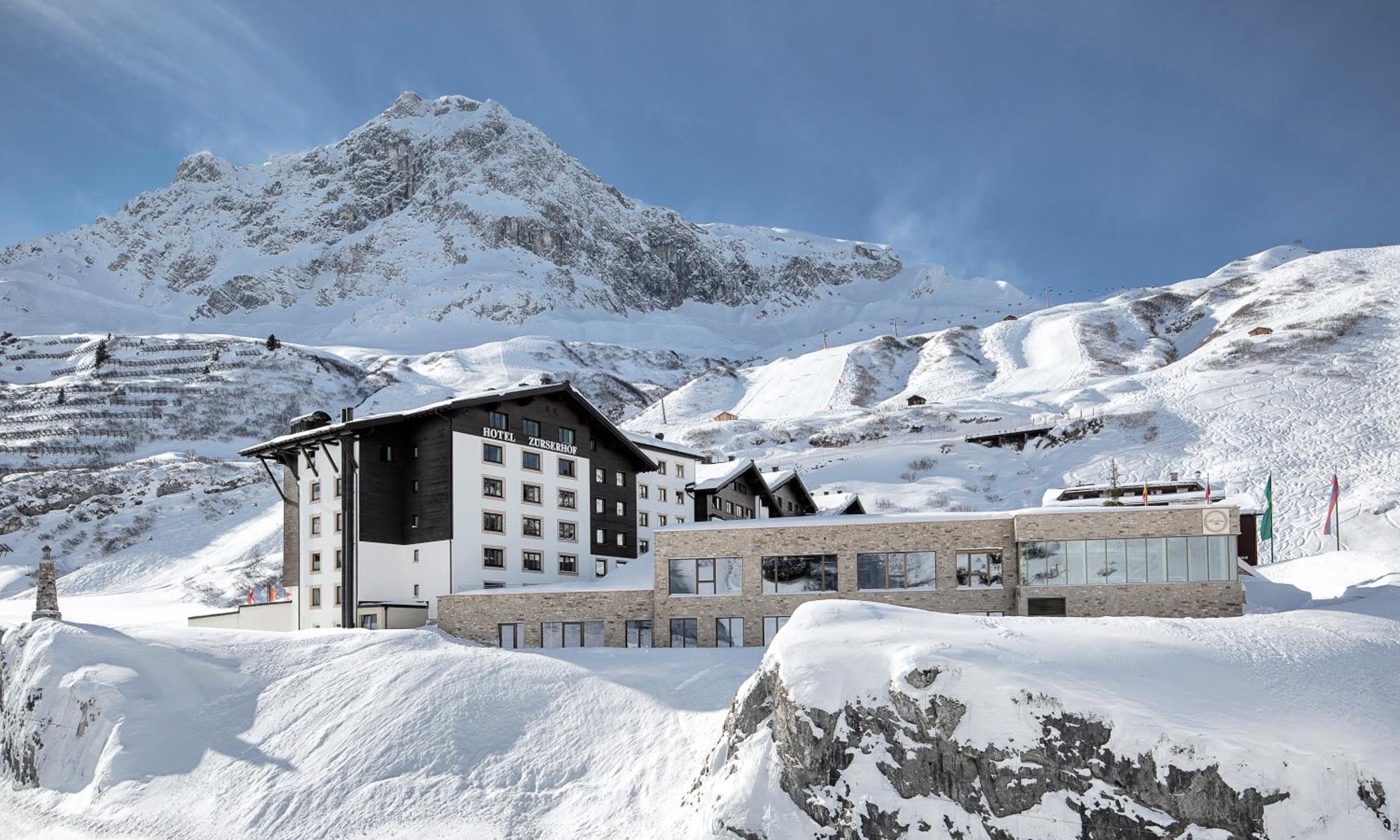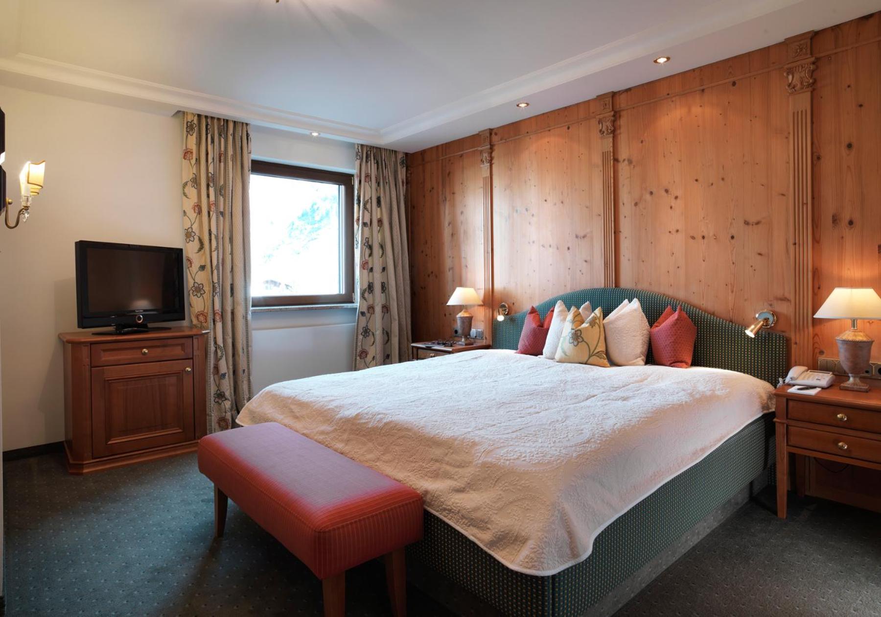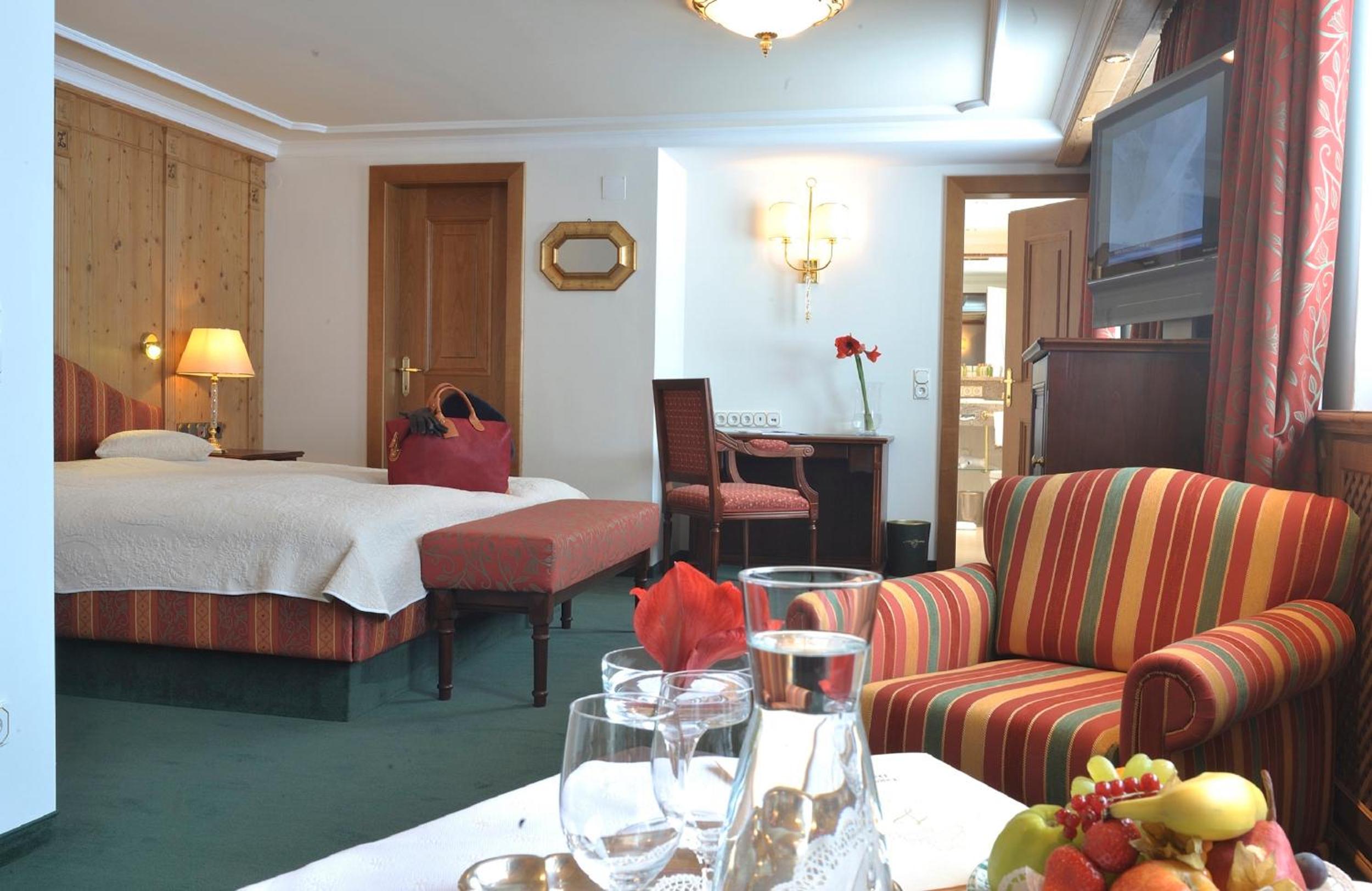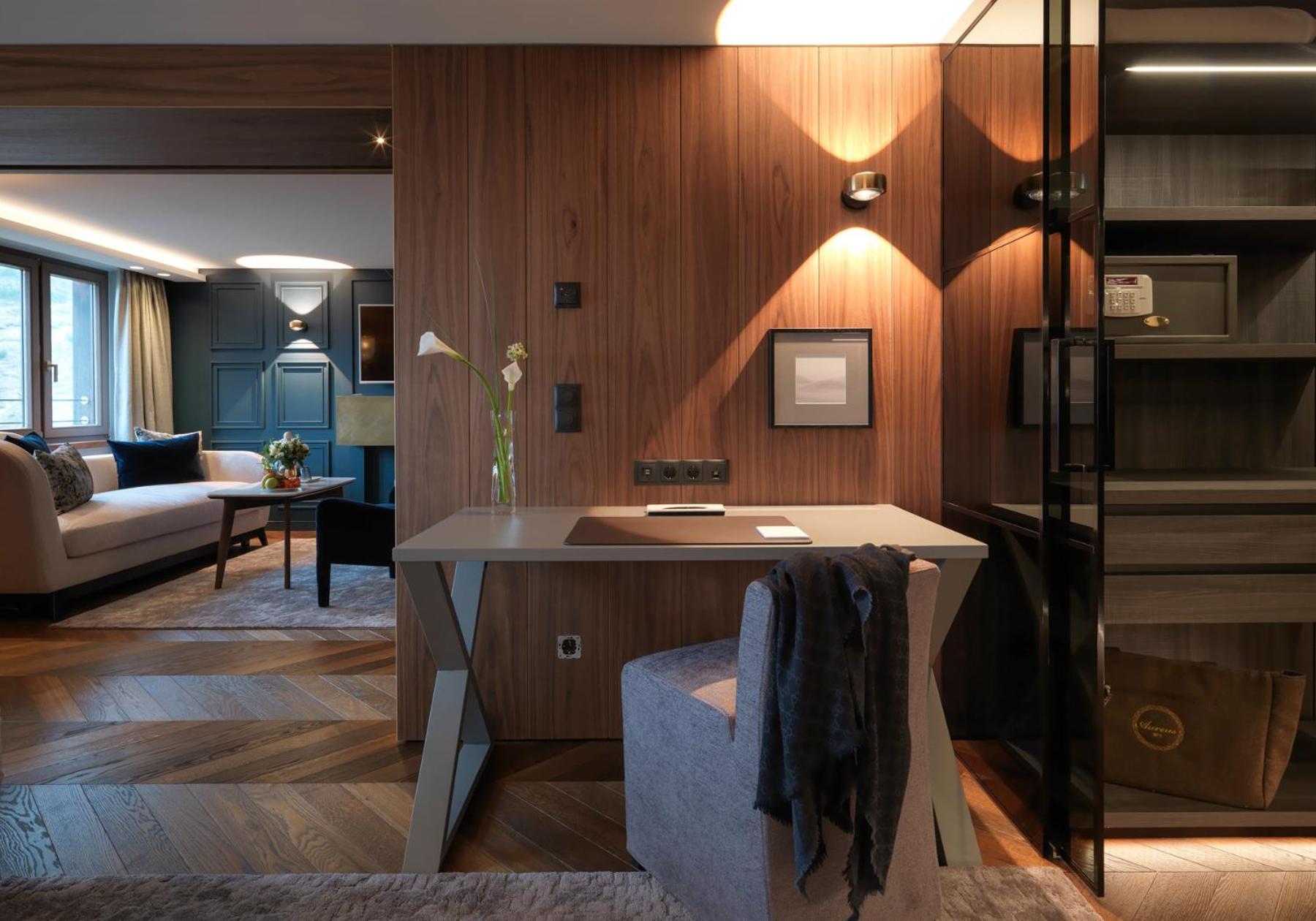 The Zürserhof, a 5-star superior hotel in Zürs, offers elegantly furnished rooms with breathtaking mountain views. Each room is equipped with modern amenities for a comfortable stay, including a flat-screen TV, minibar, and plush bathrobes.