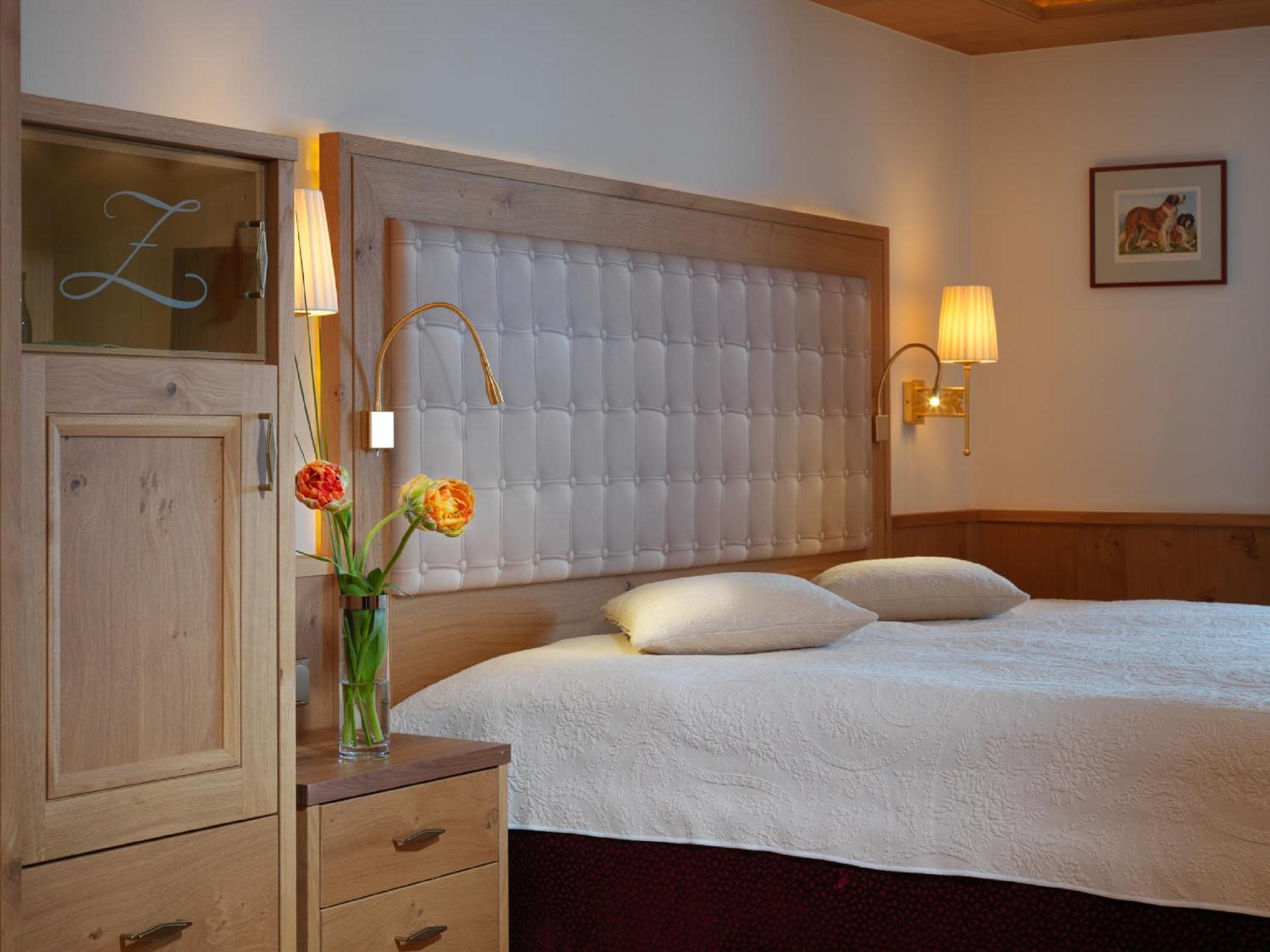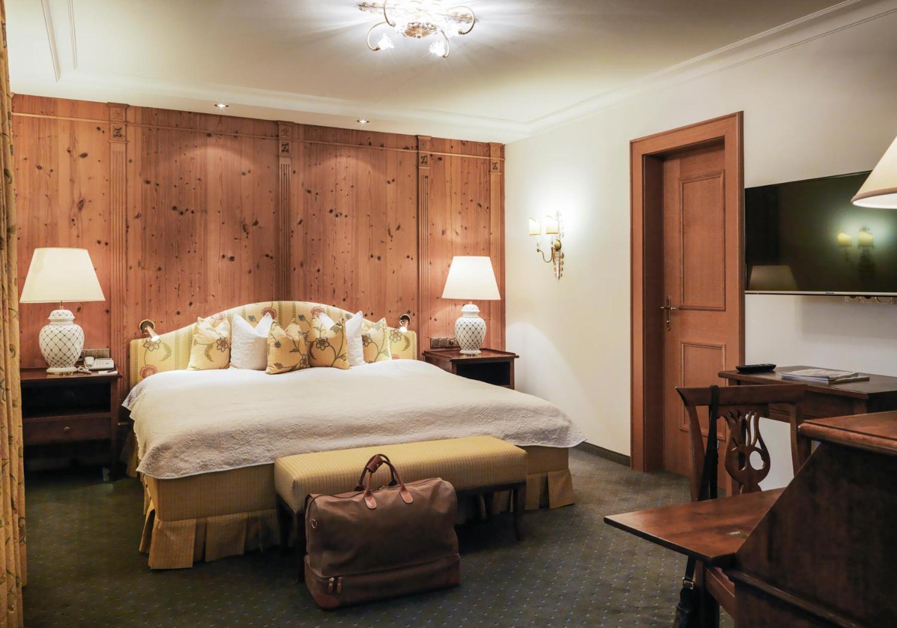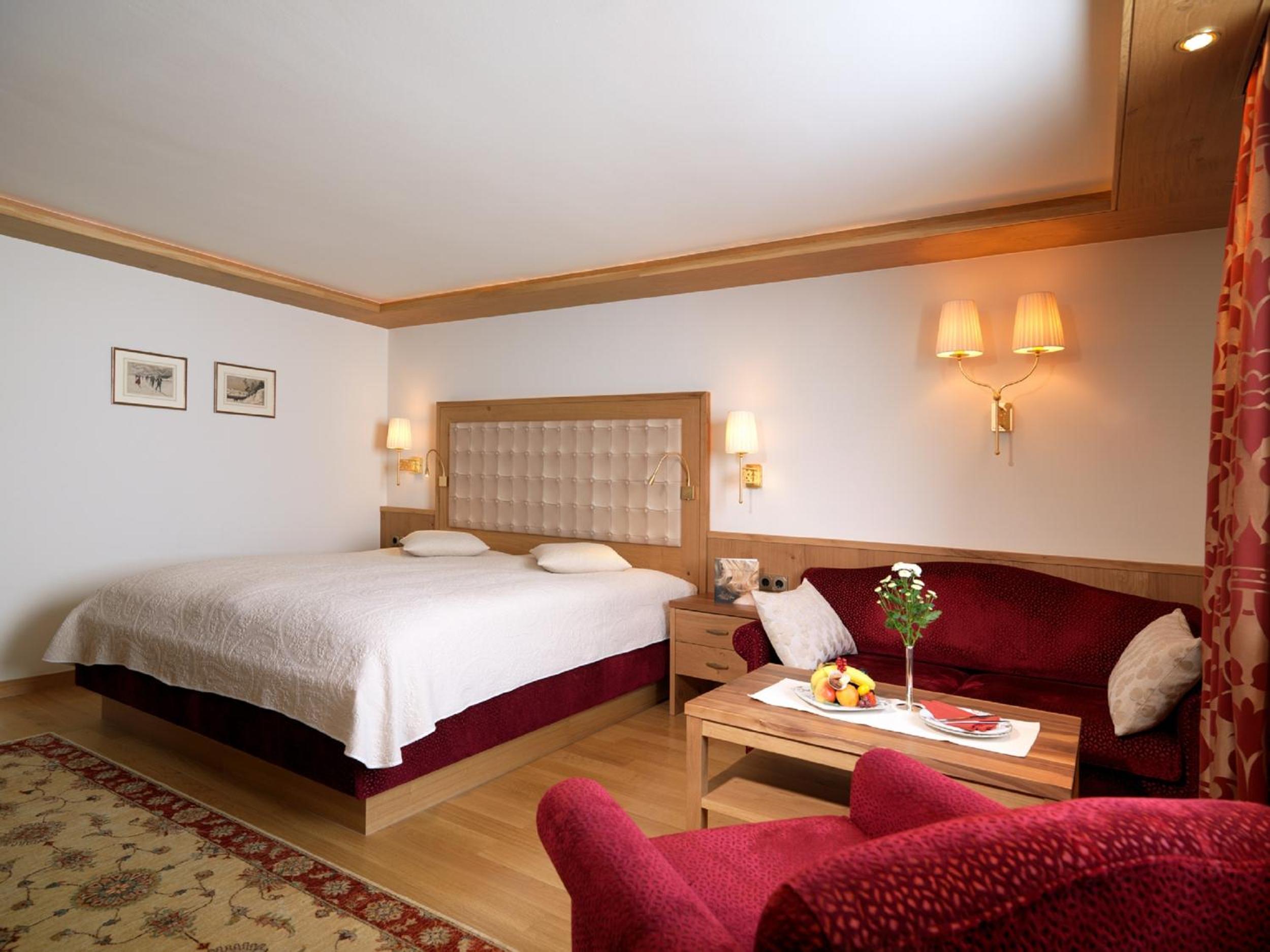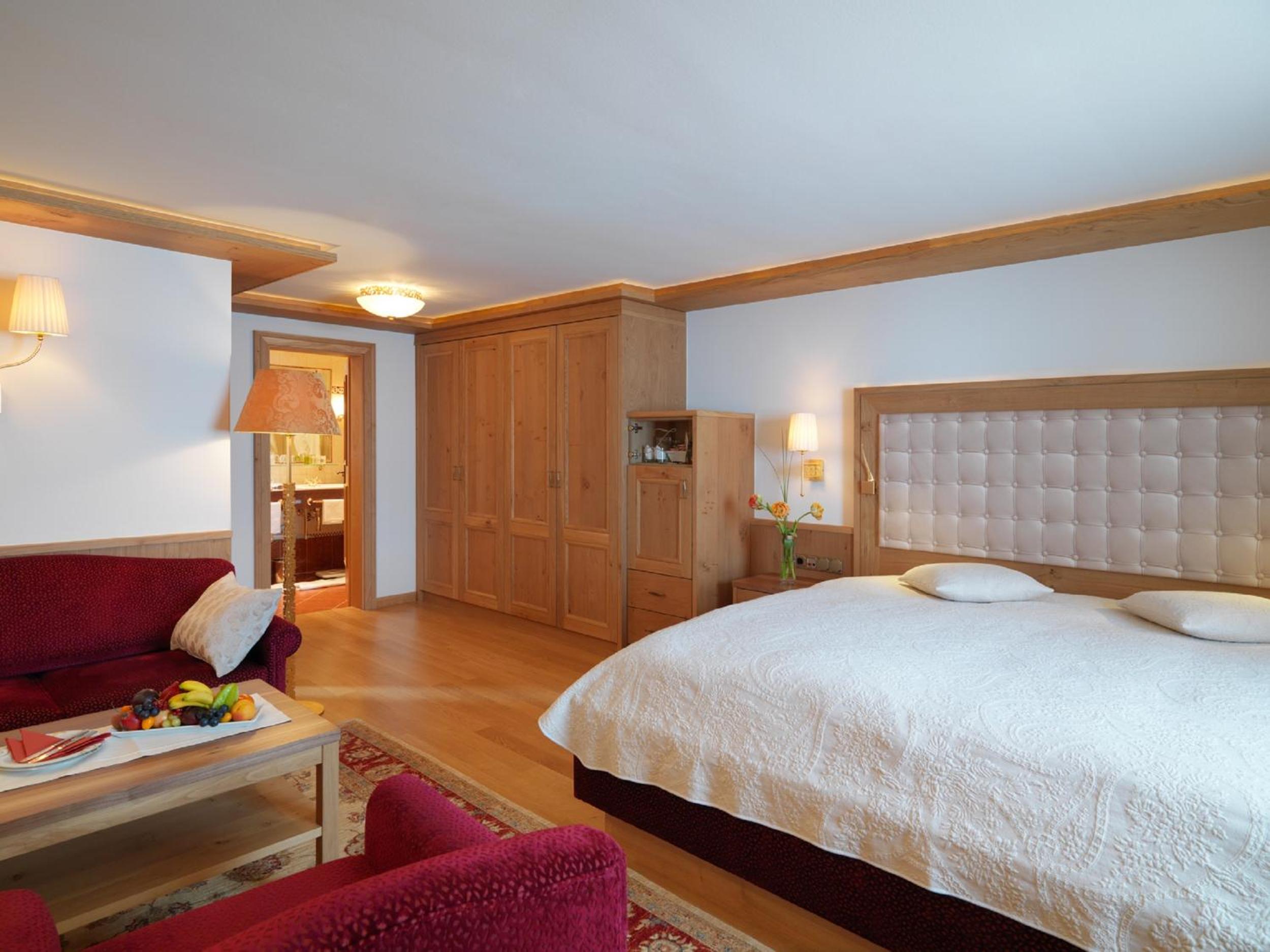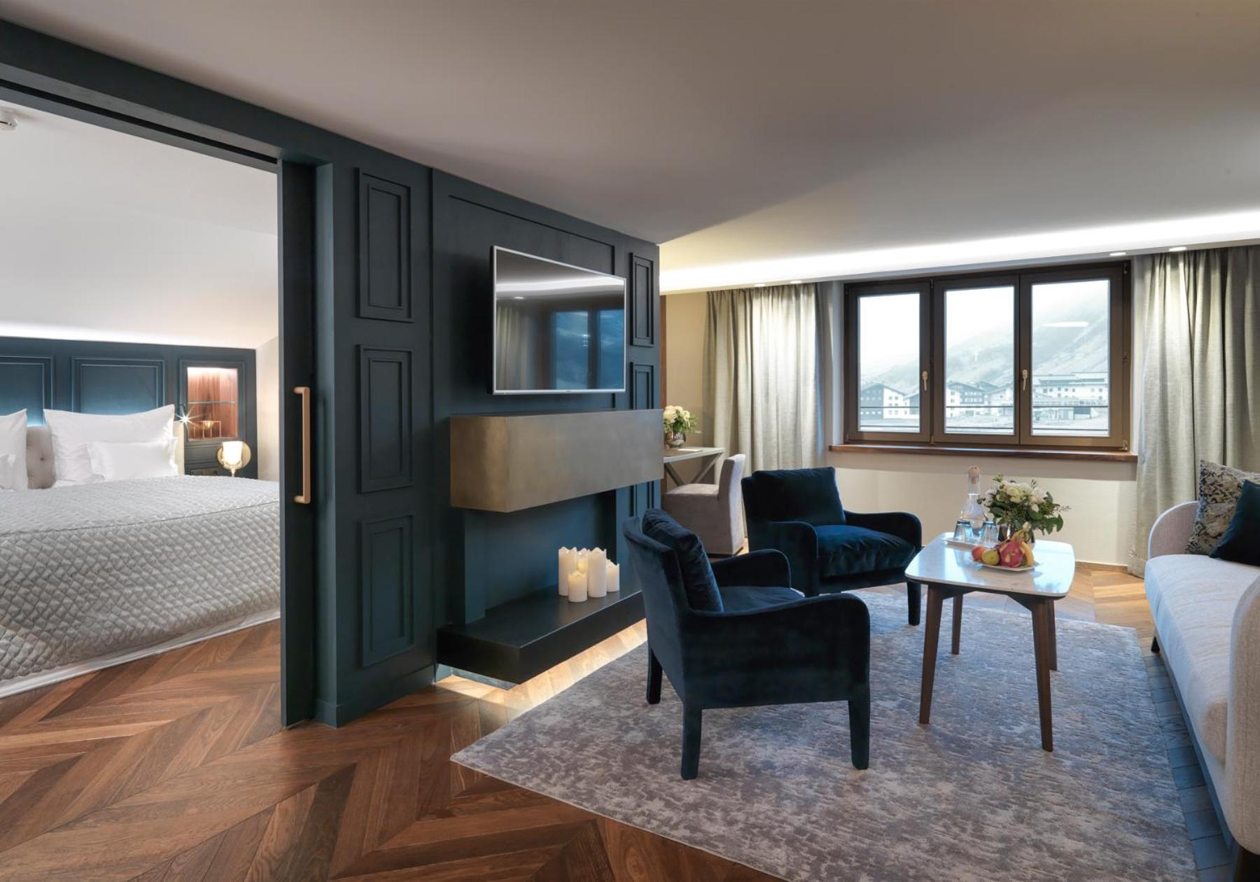 The Zürserhof, a 5-star superior hotel in Zürs, offers elegantly furnished rooms with breathtaking mountain views. Each room is equipped with modern amenities for a comfortable stay, including a flat-screen TV, minibar, and plush bathrobes.