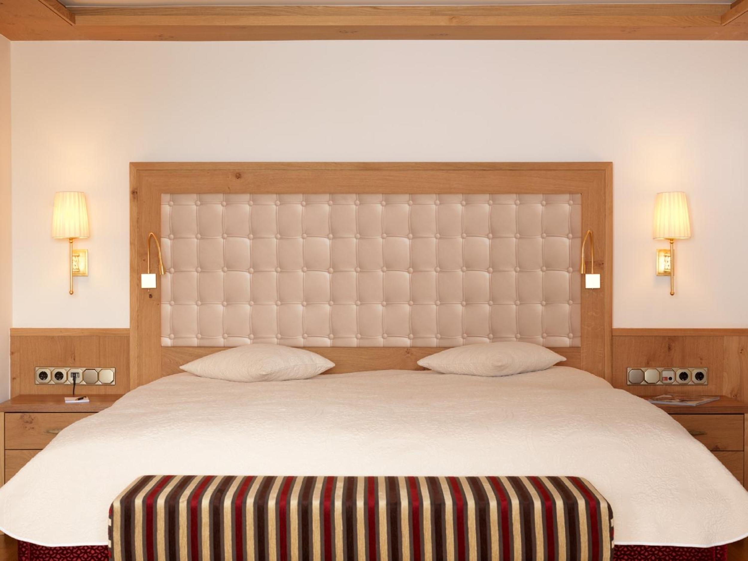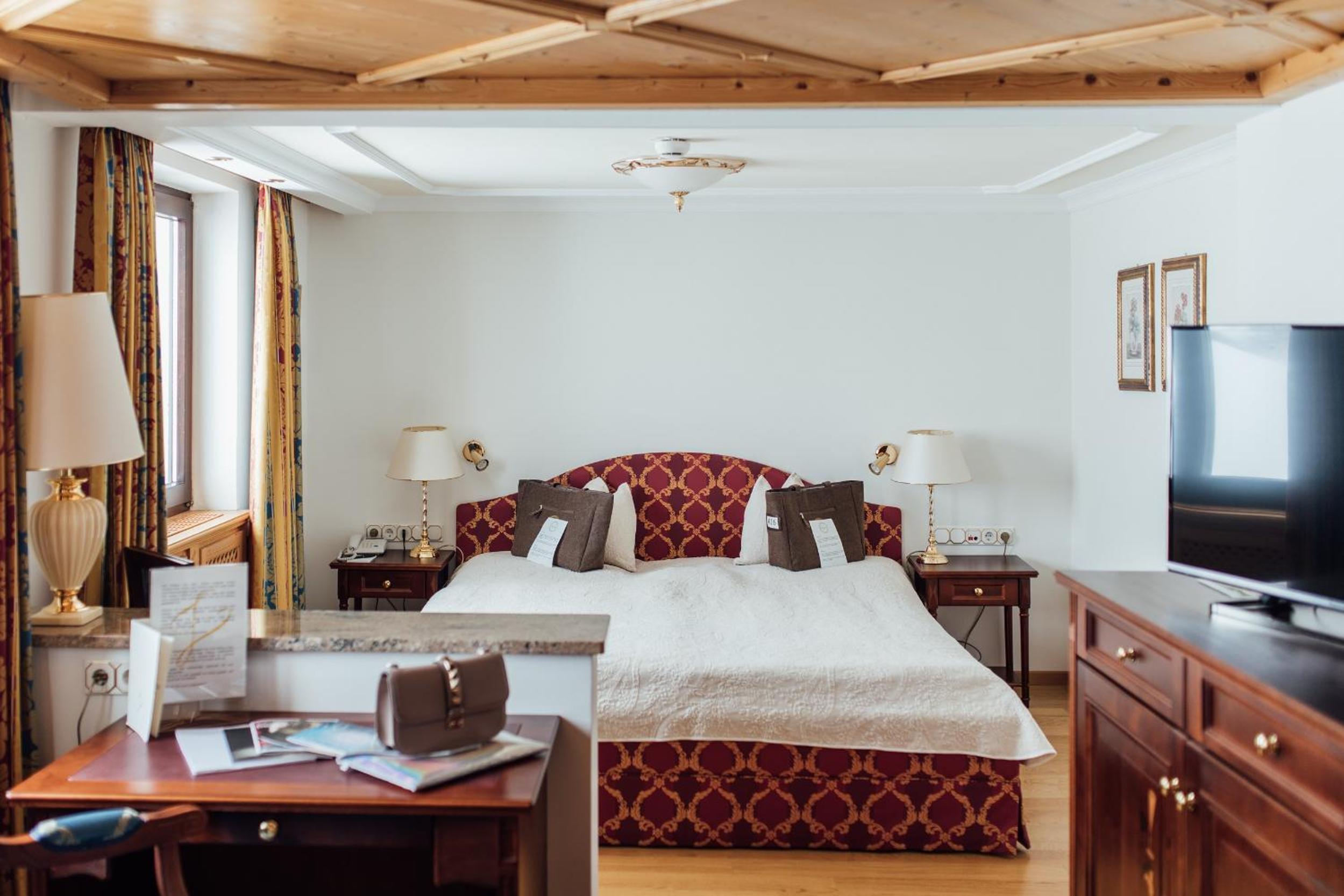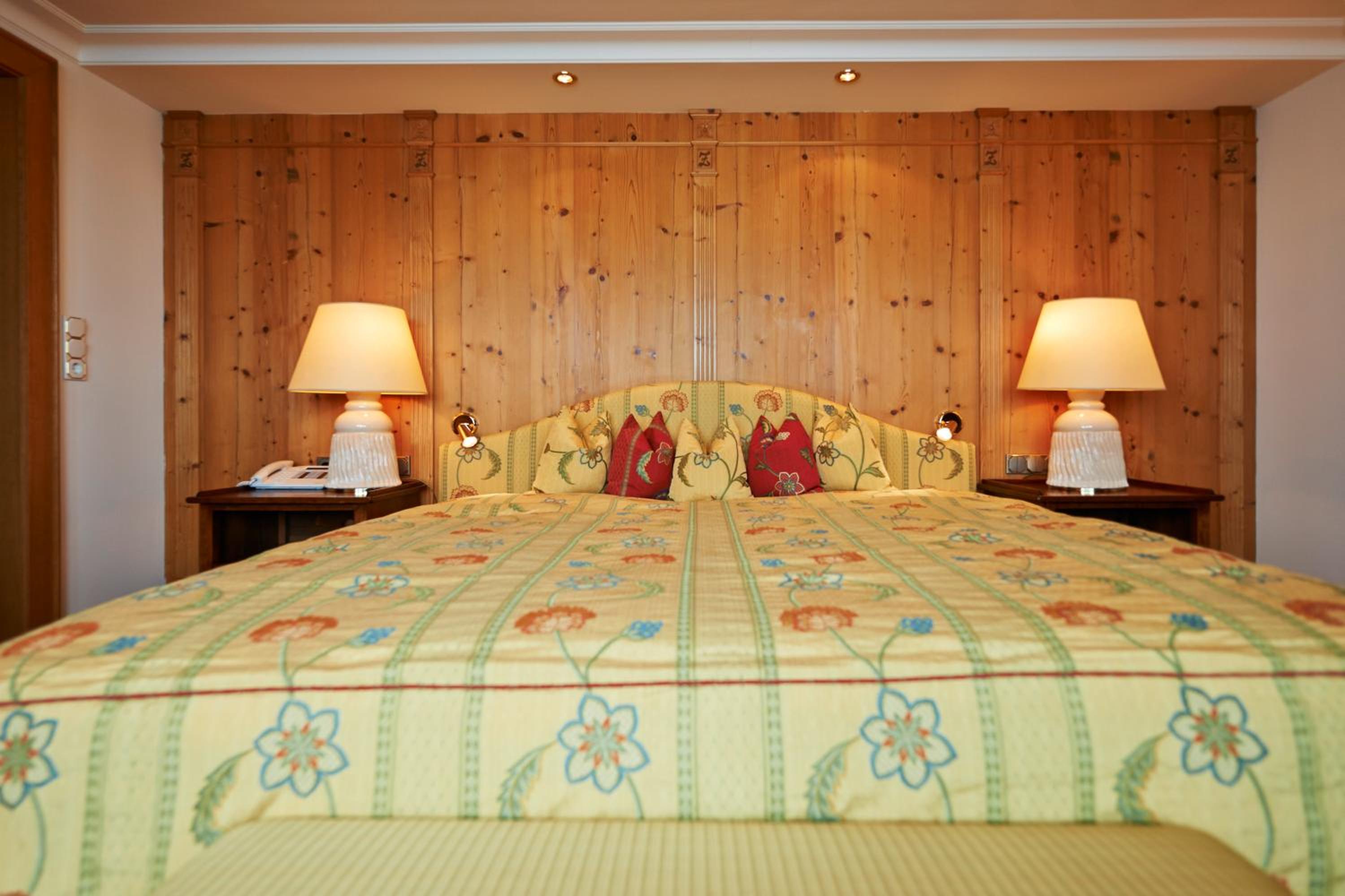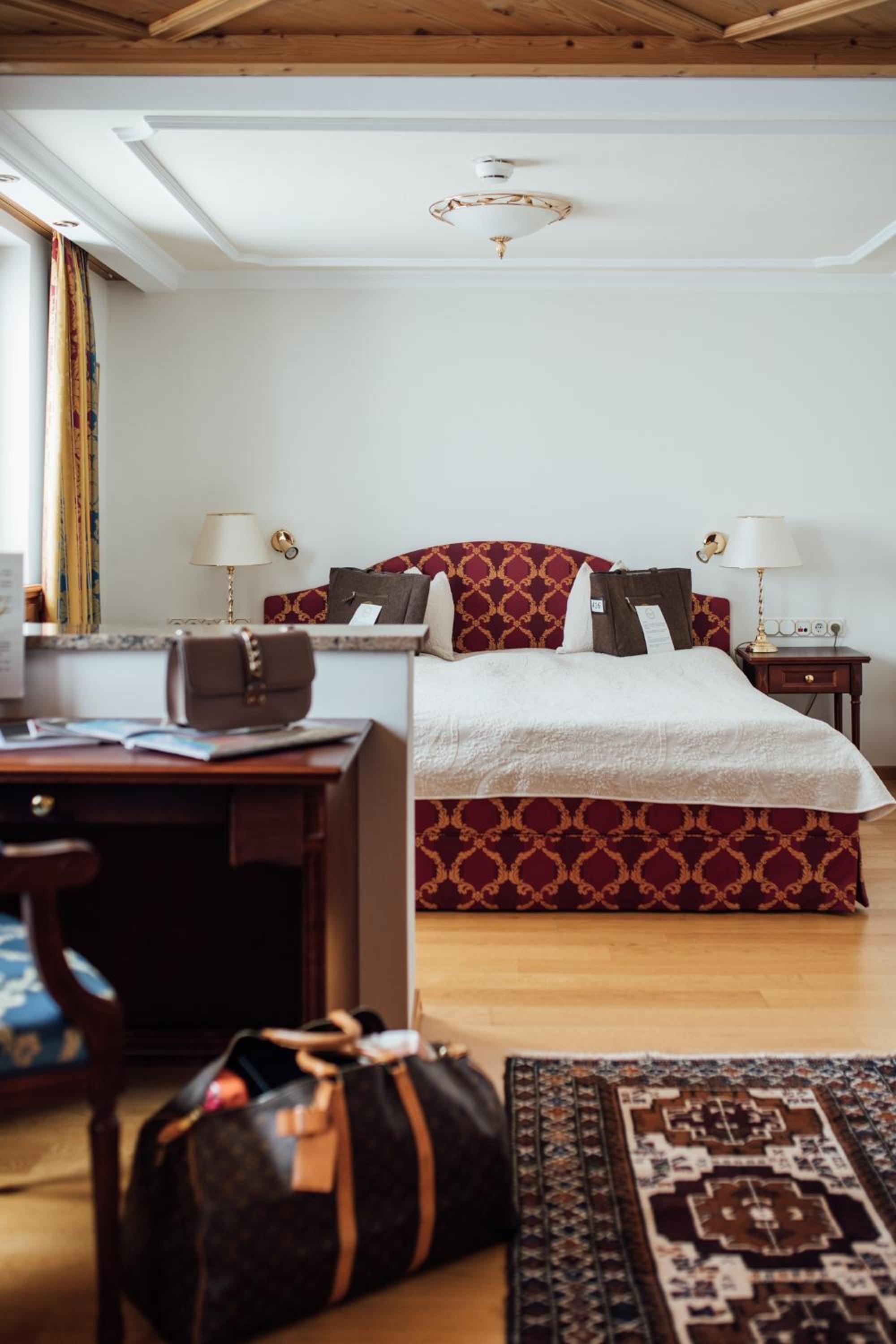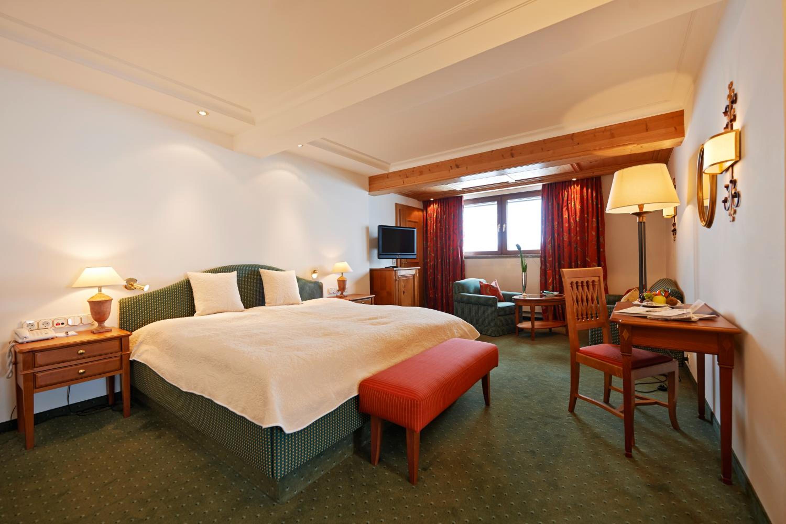 The Zürserhof, a 5-star superior hotel in Zürs, offers elegantly furnished rooms with breathtaking mountain views. Each room is equipped with modern amenities for a comfortable stay, including a flat-screen TV, minibar, and plush bathrobes.