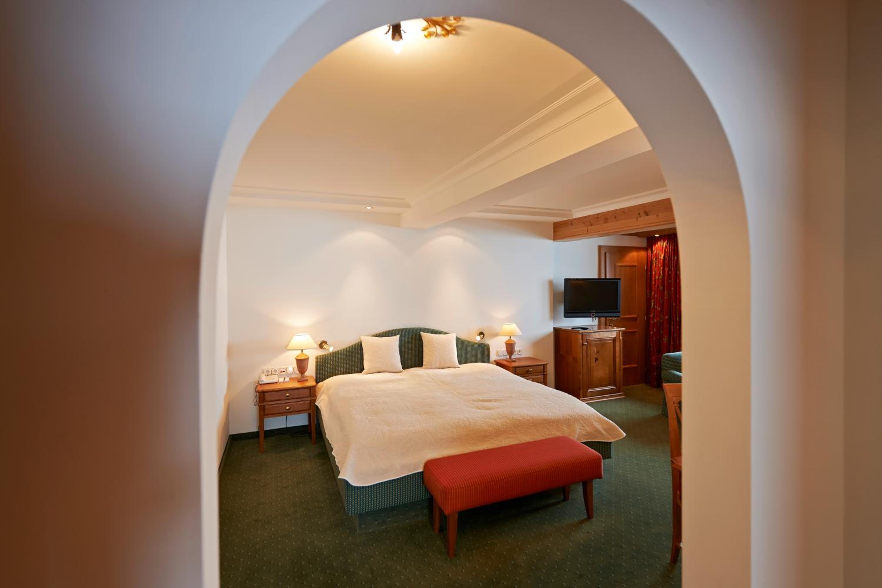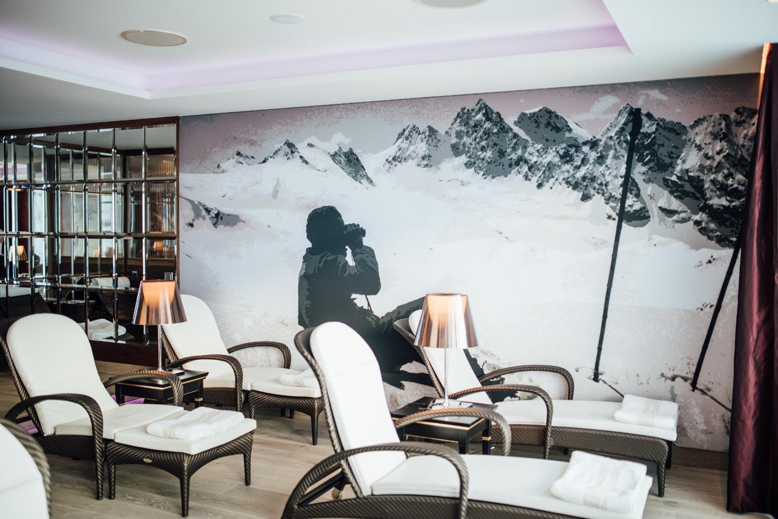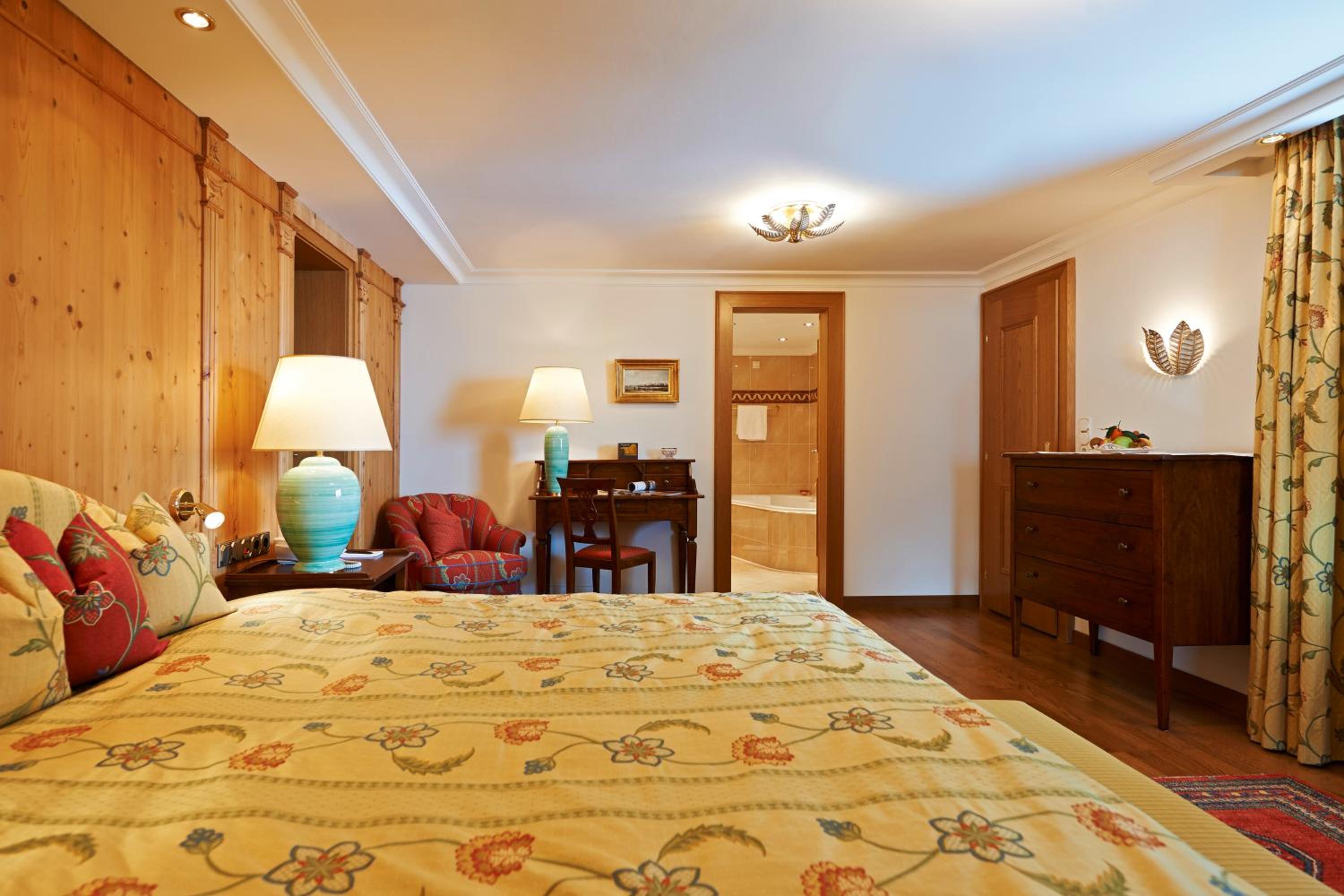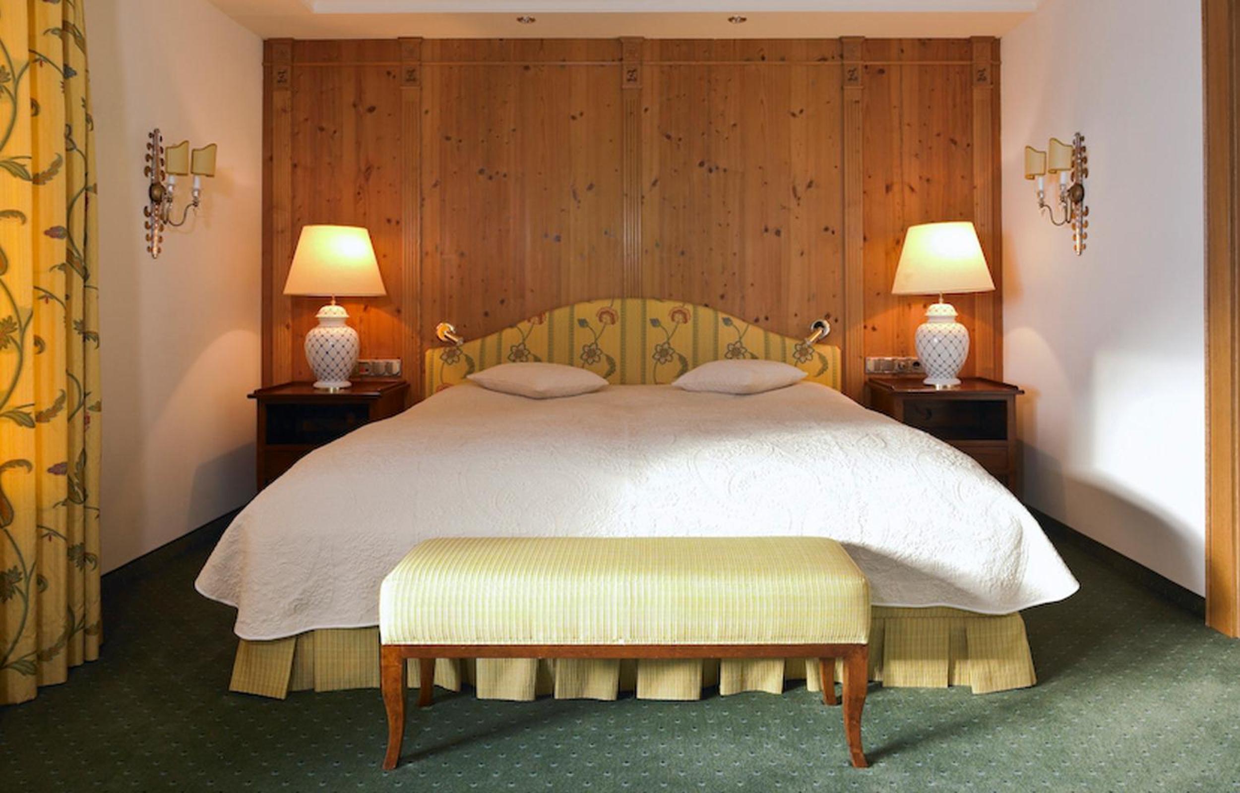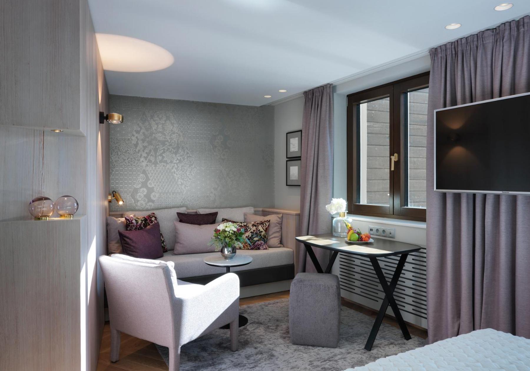The Zürserhof, a 5-star superior hotel in Zürs, offers elegantly furnished rooms with breathtaking mountain views. Each room is equipped with modern amenities for a comfortable stay, including a flat-screen TV, minibar, and plush bathrobes.
