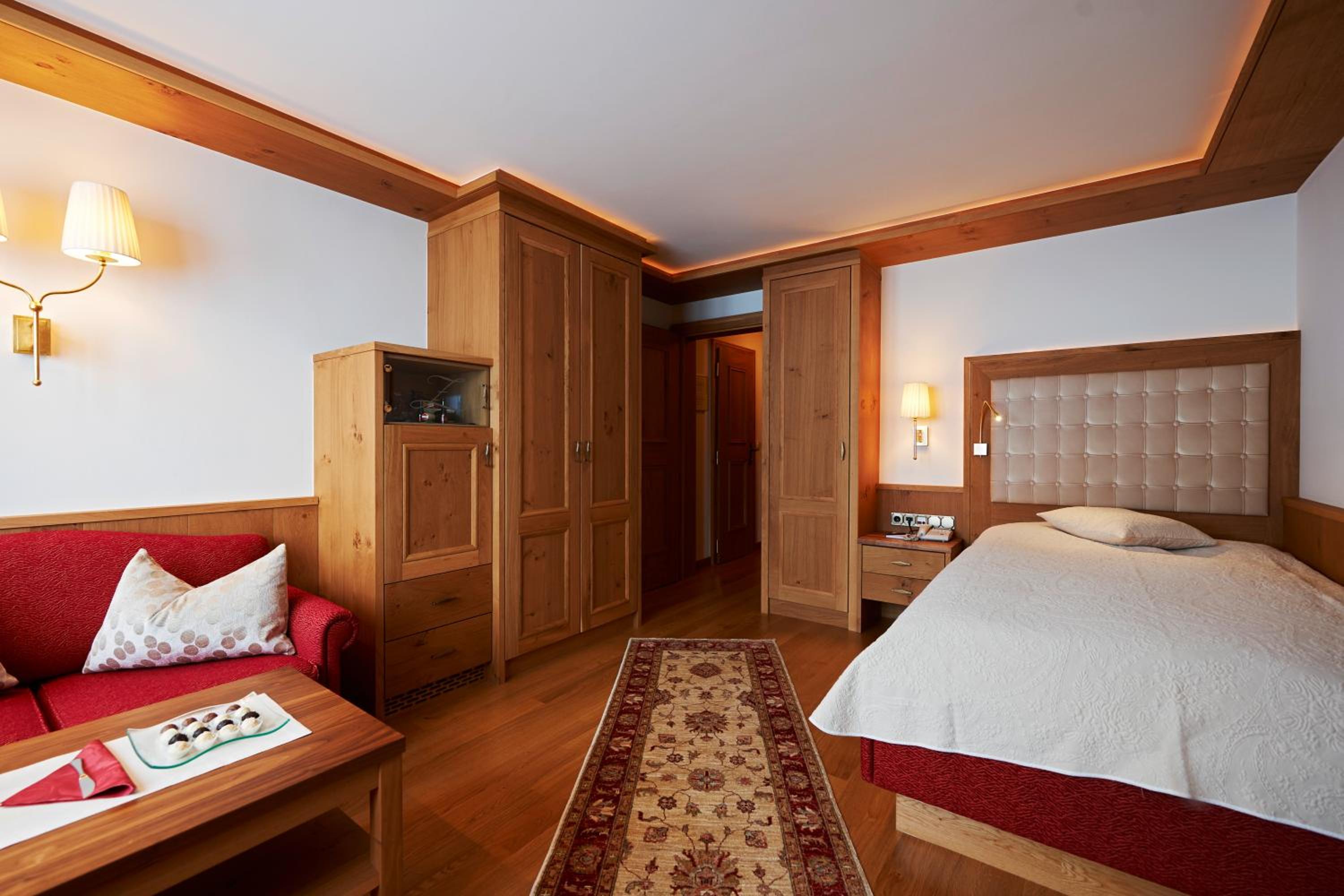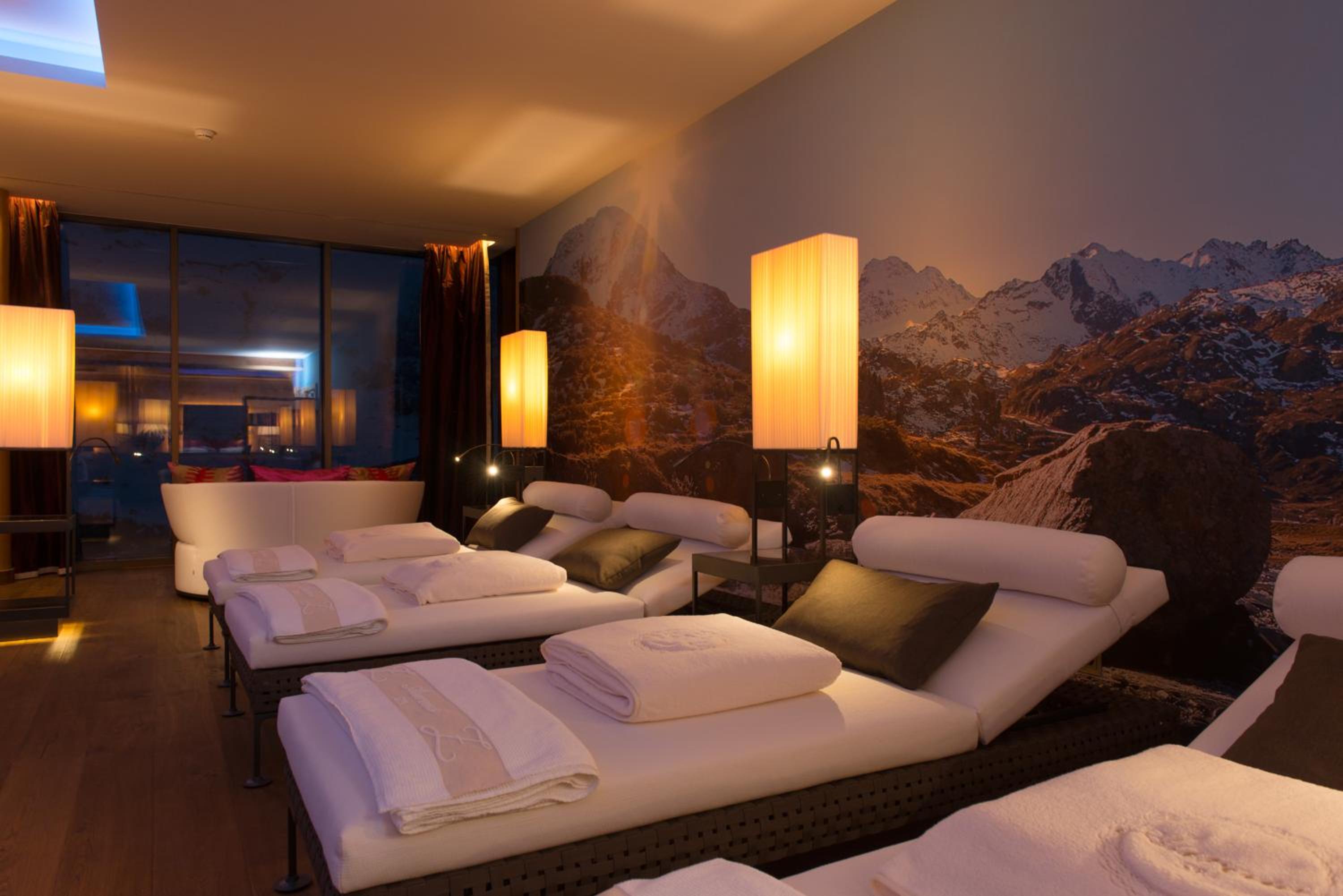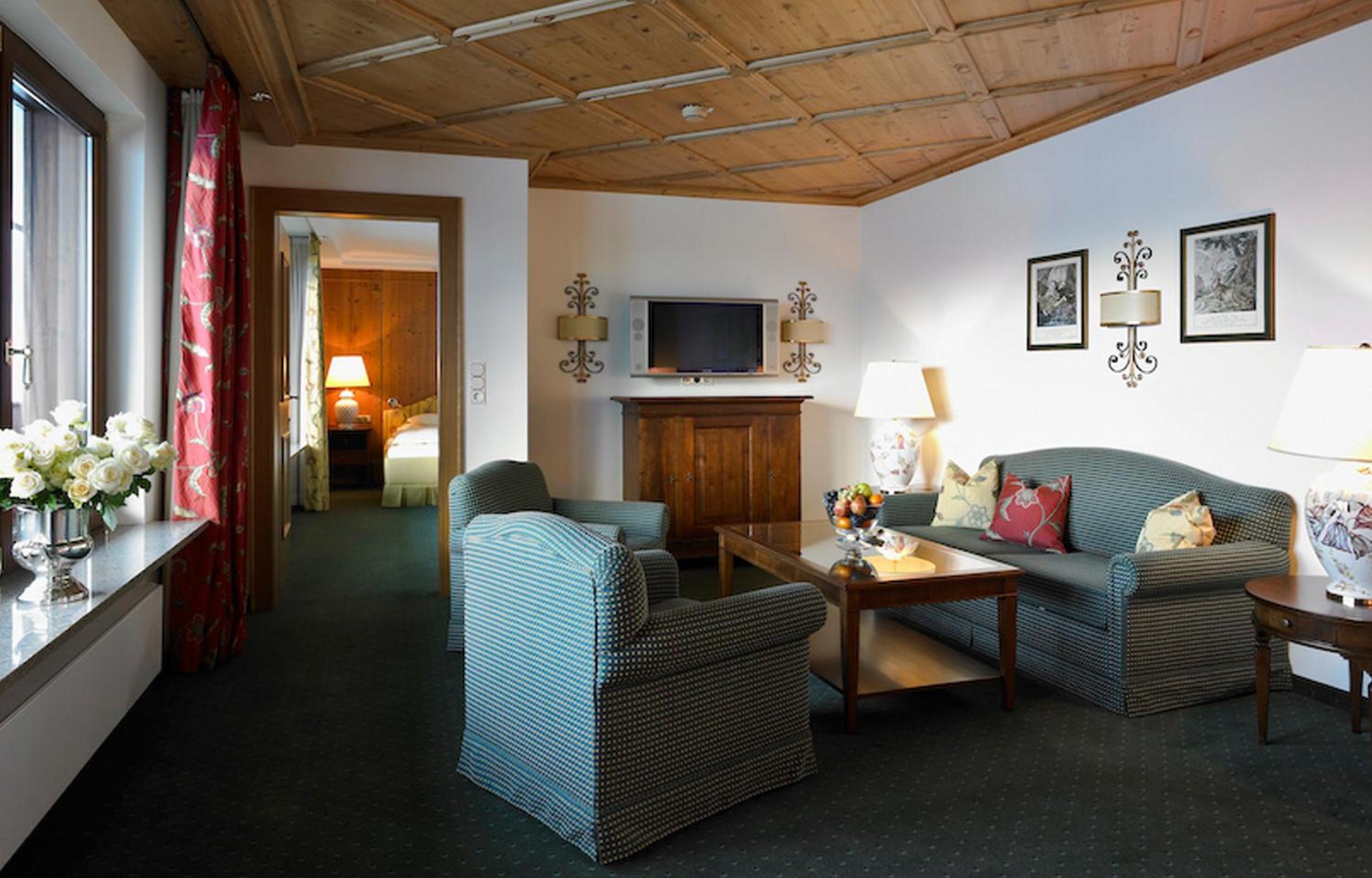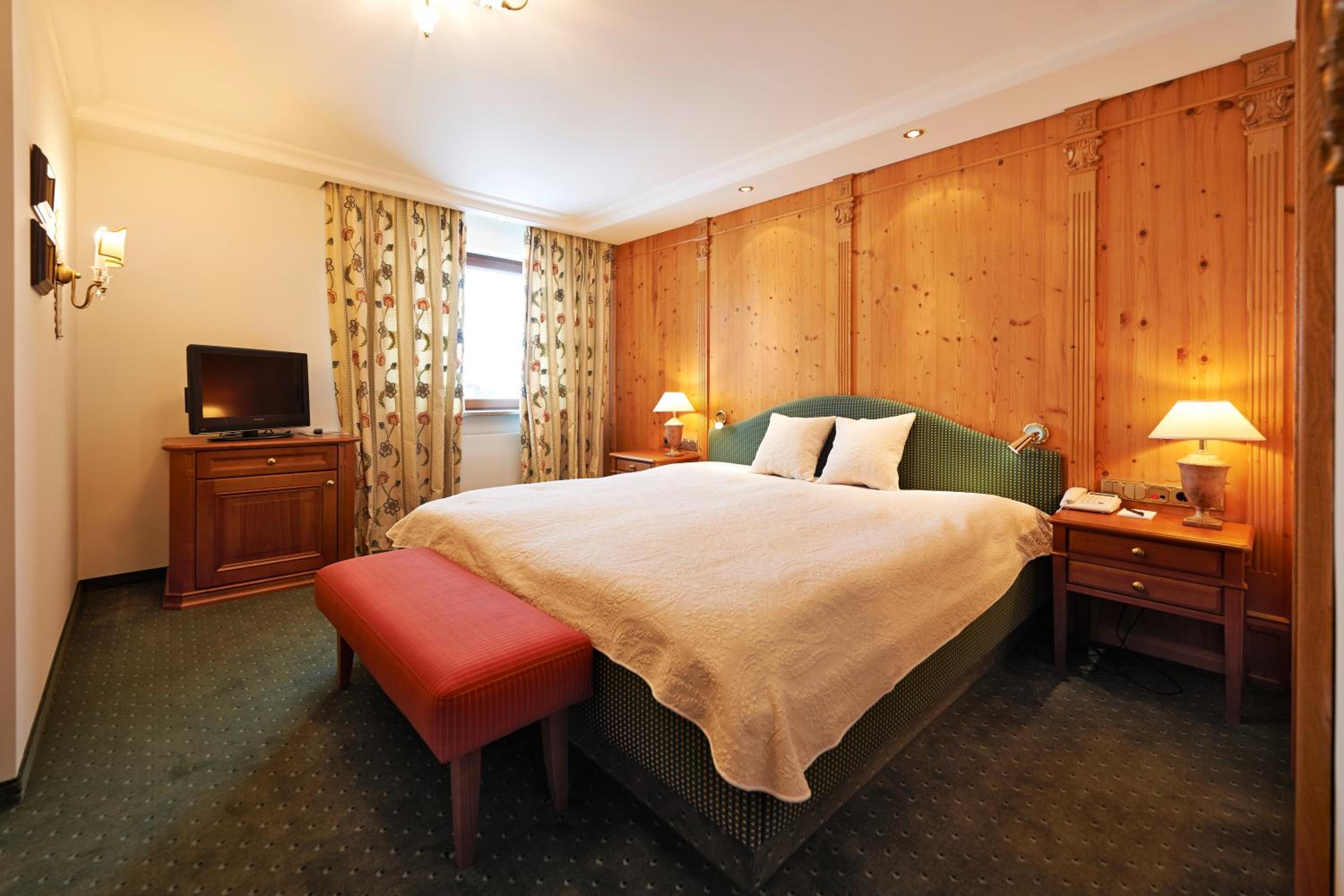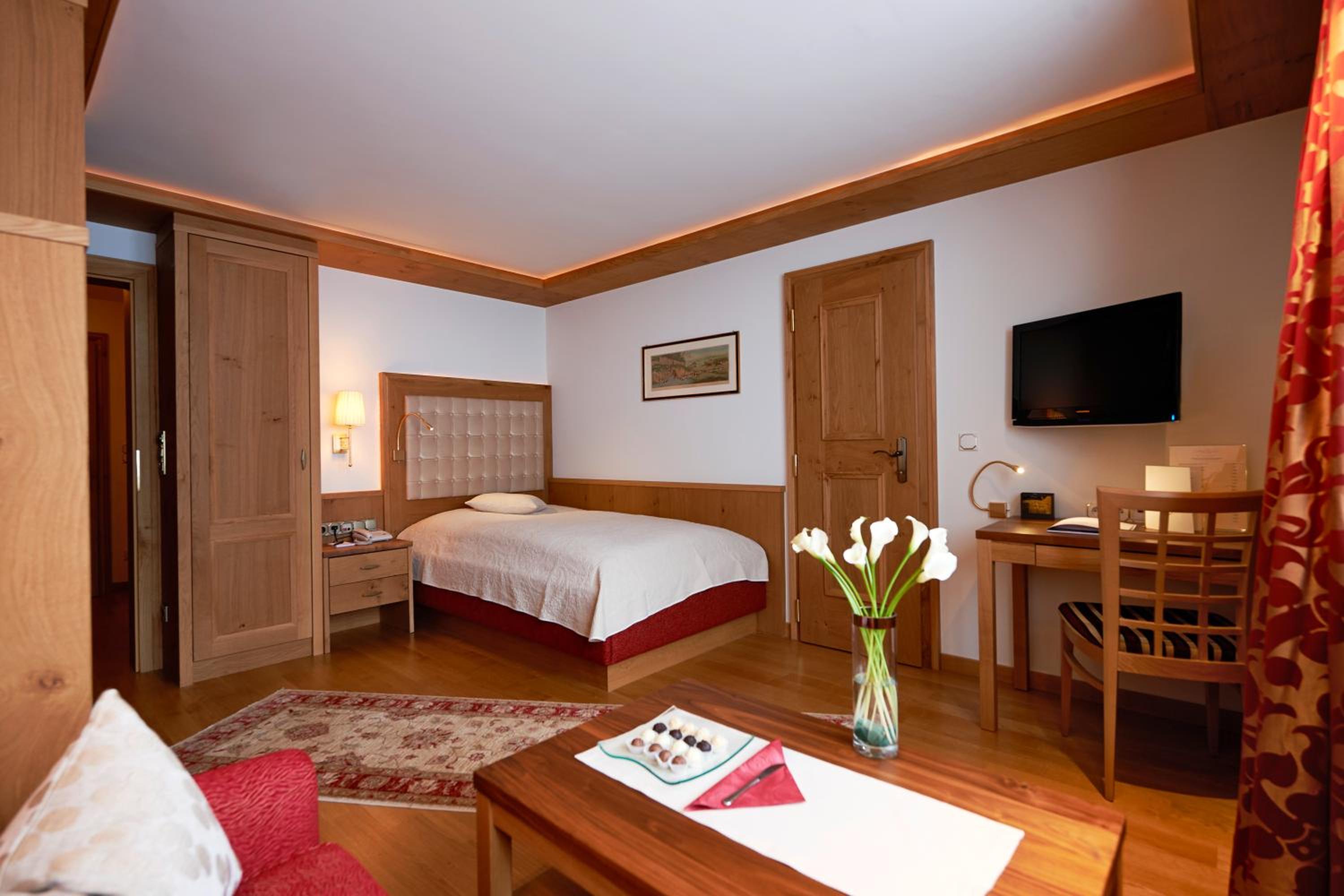 The Zürserhof, a 5-star superior hotel in Zürs, offers elegantly furnished rooms with breathtaking mountain views. Each room is equipped with modern amenities for a comfortable stay, including a flat-screen TV, minibar, and plush bathrobes.
