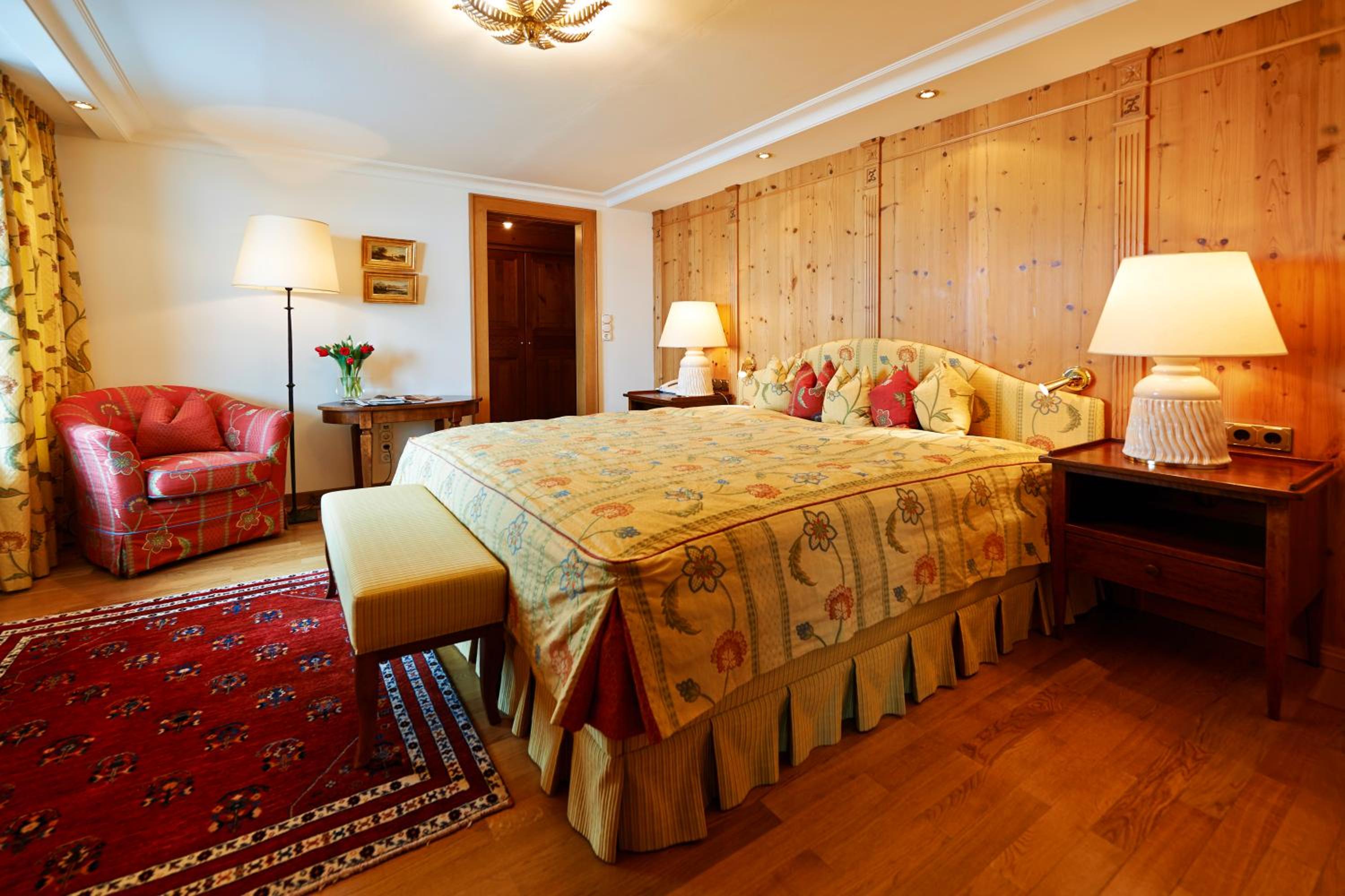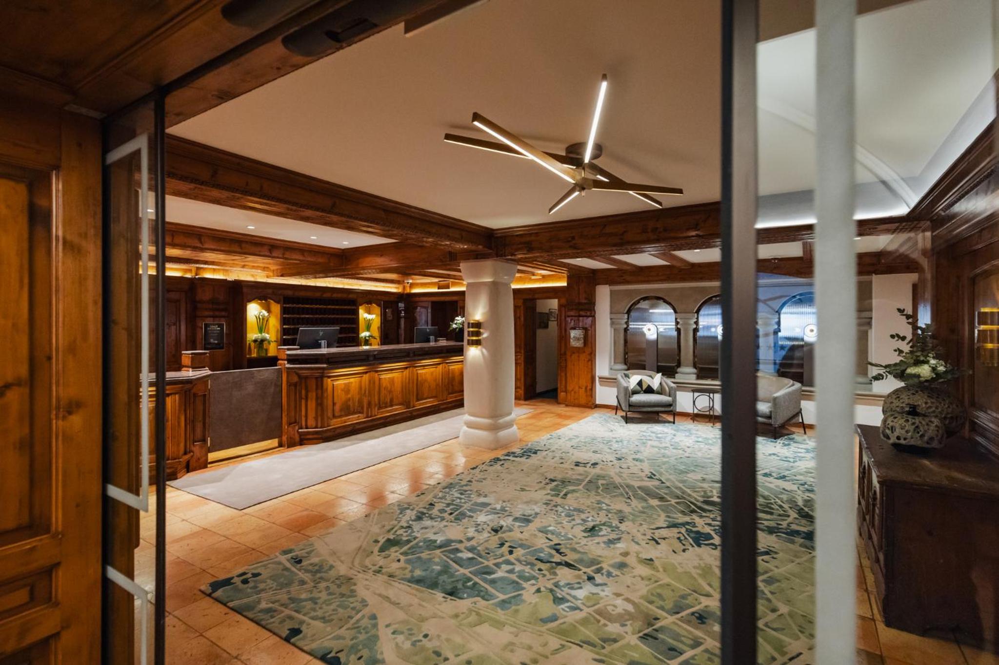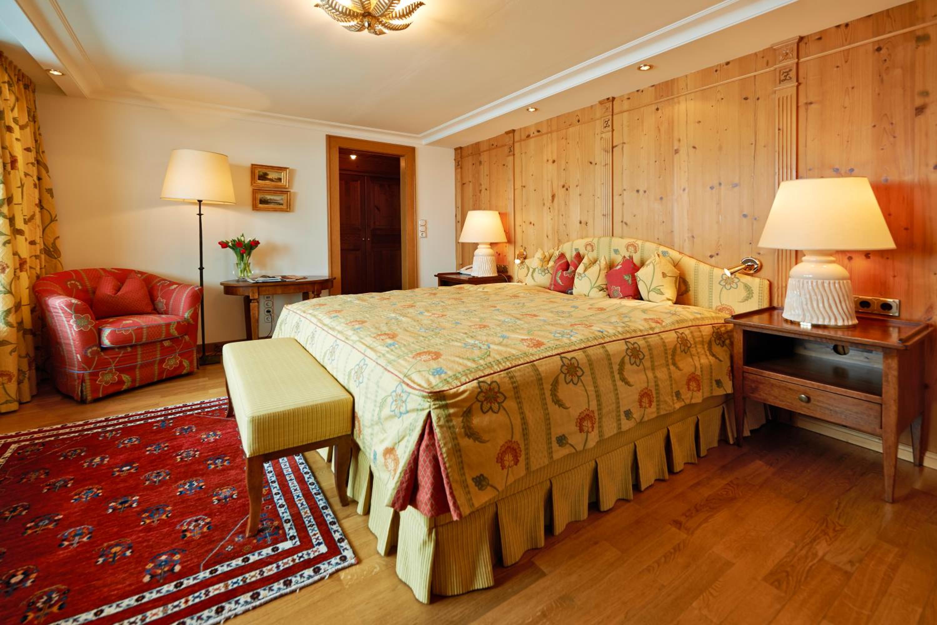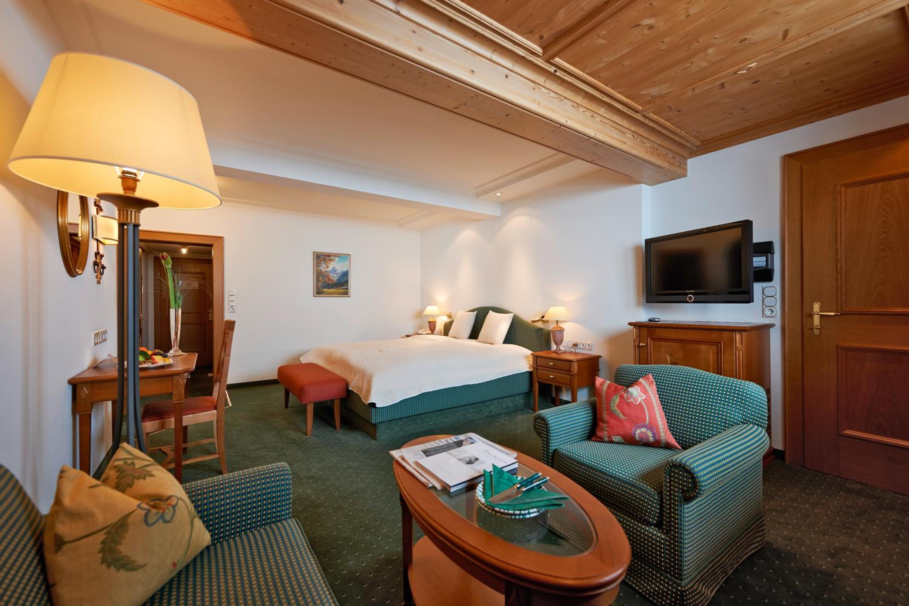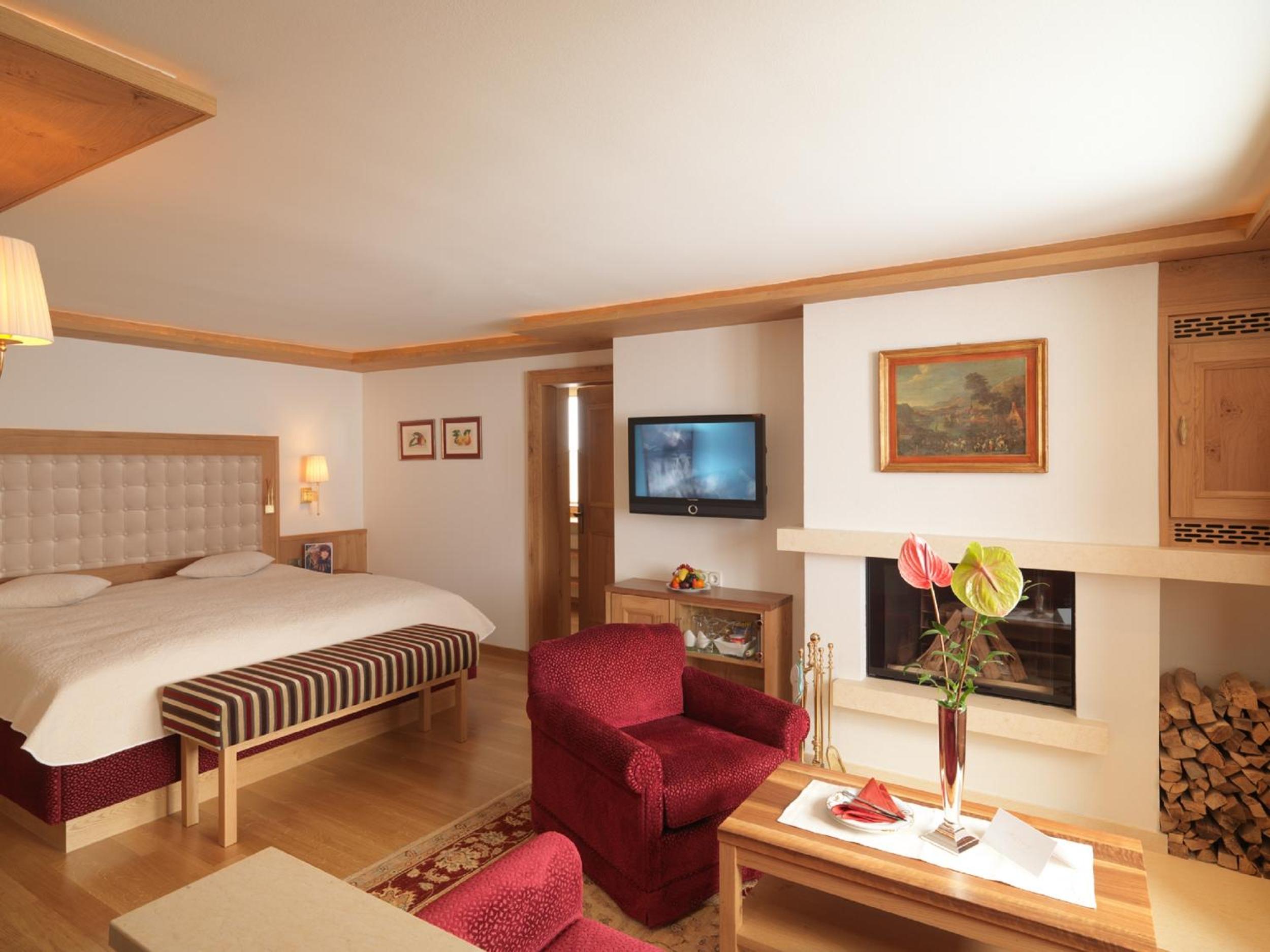 The Zürserhof, a 5-star superior hotel in Zürs, offers elegantly furnished rooms with breathtaking mountain views. Each room is equipped with modern amenities for a comfortable stay, including a flat-screen TV, minibar, and plush bathrobes.