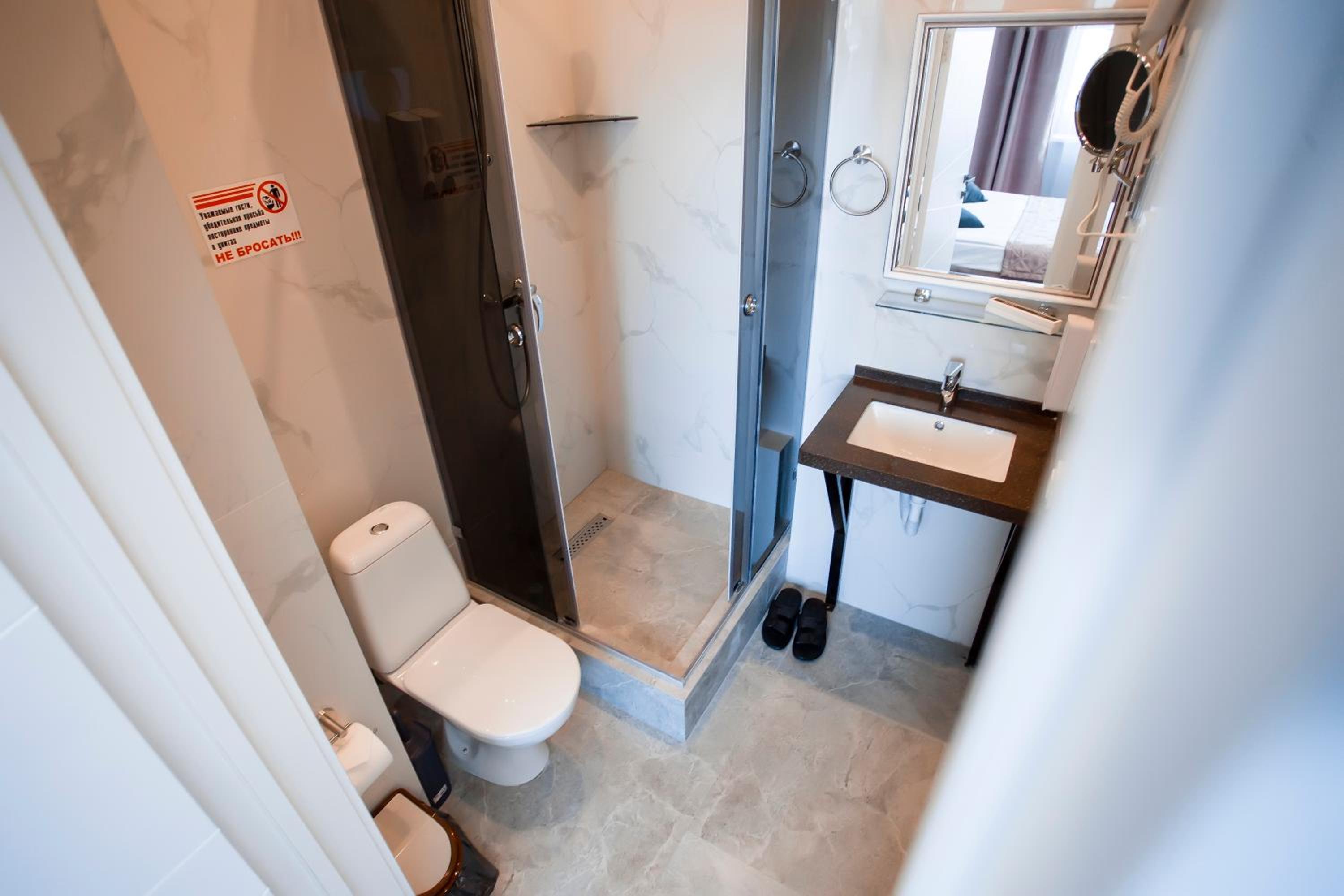 Нет холодильника, чайника, геля для душа и шампуня. В Душевой сломана дверца, повесили штору, которая ужасна ржавая, и все льется на пол, прокурено. Полотенца убогие, как с мусорки, грязные, рваные. Резиновые шлепки вместо тапочек, маленькие халаты как на детей. Шумоизоляции 0, слышно все четко кто зашел, кто о чем говорит с соседнего номера и сверху. За что 25 тыс не понятно. Это хостел за 5тыс.