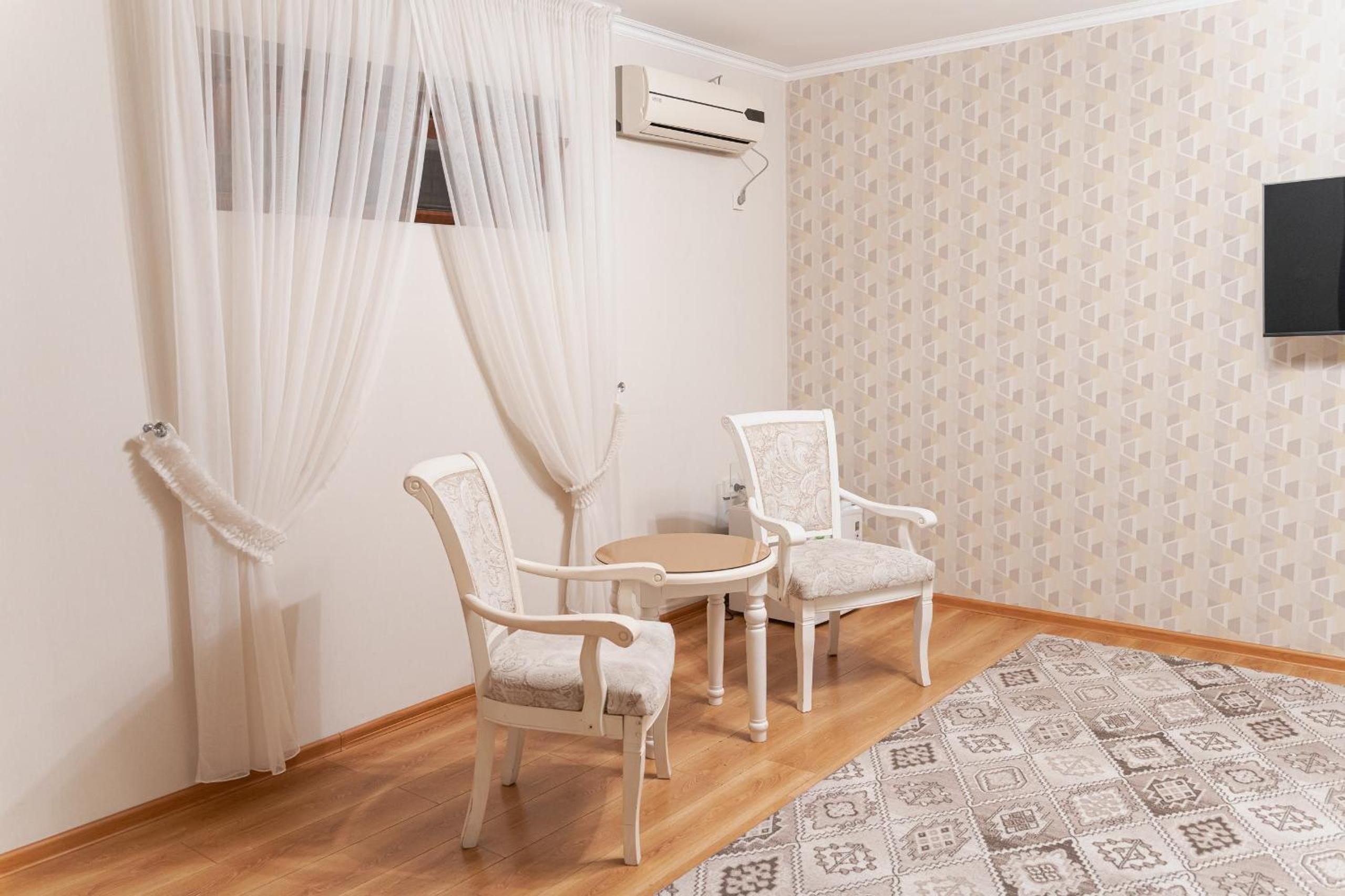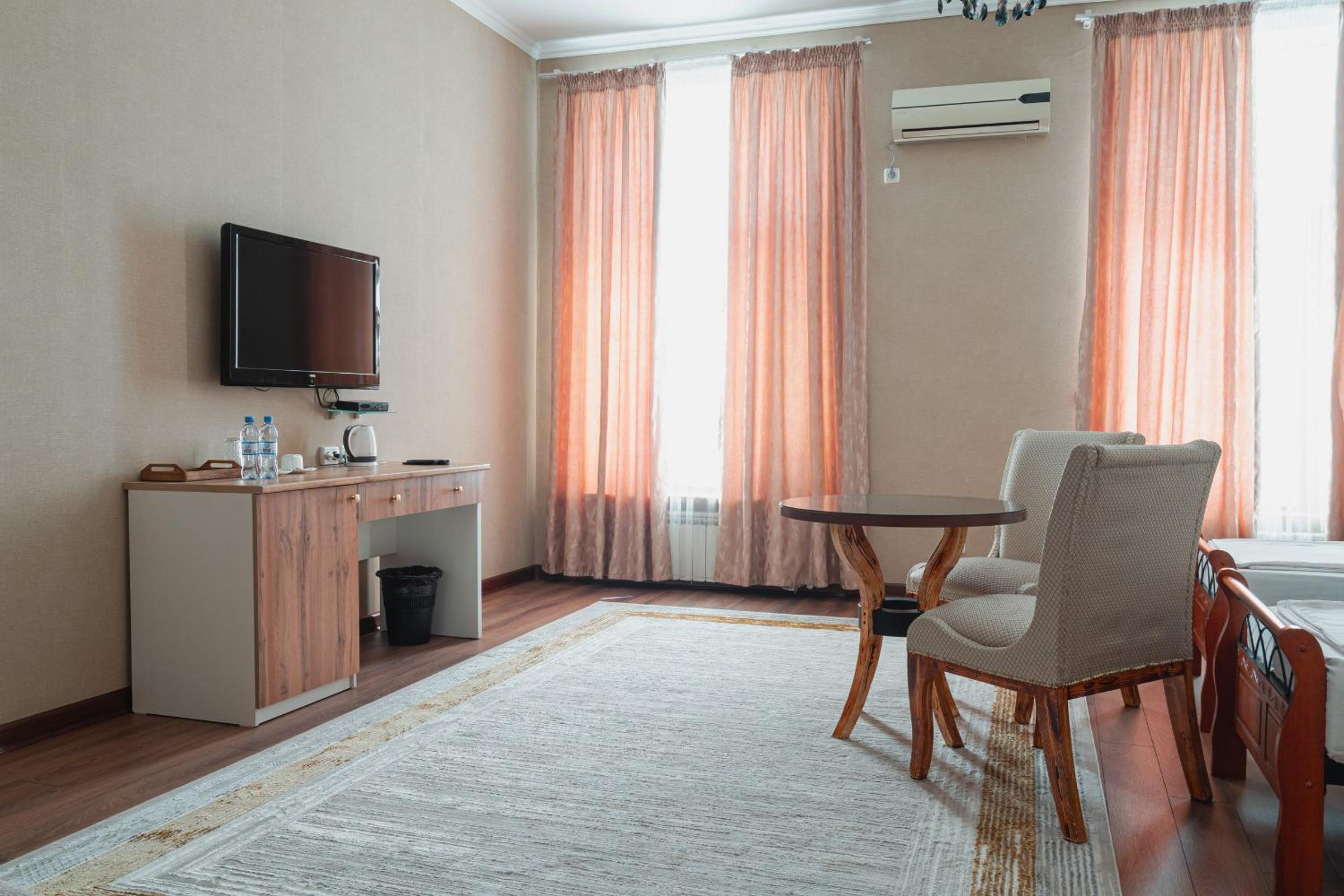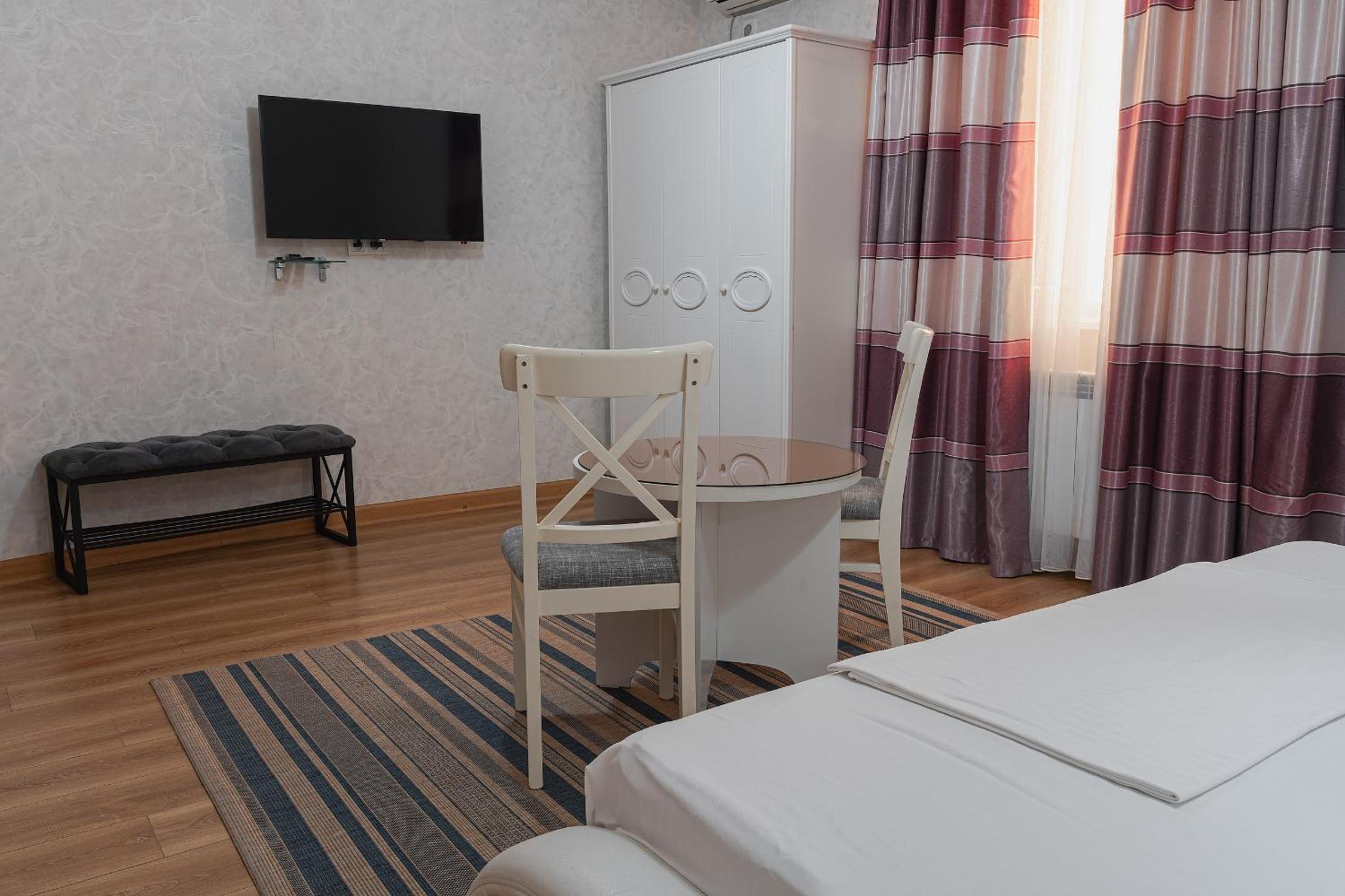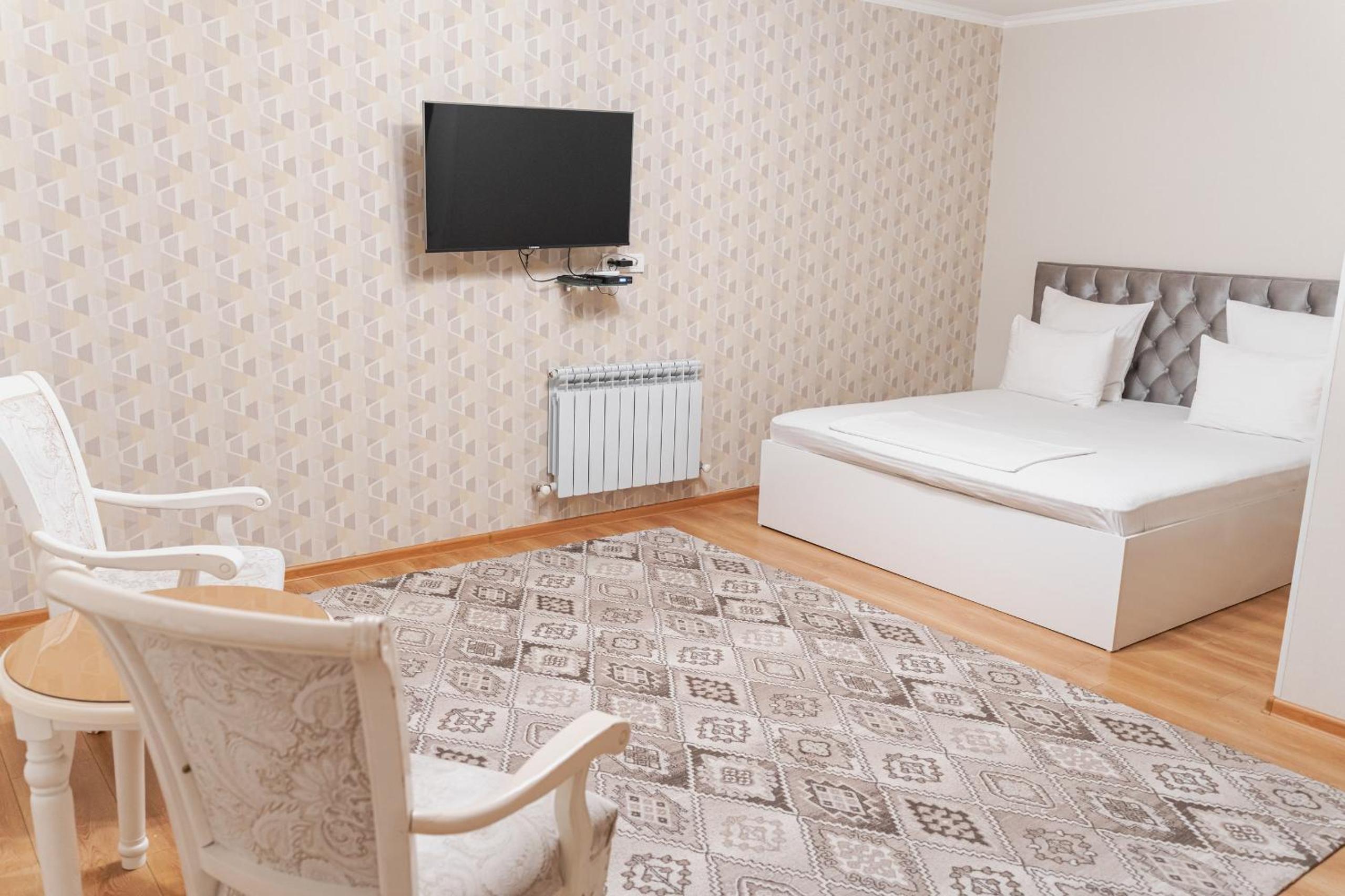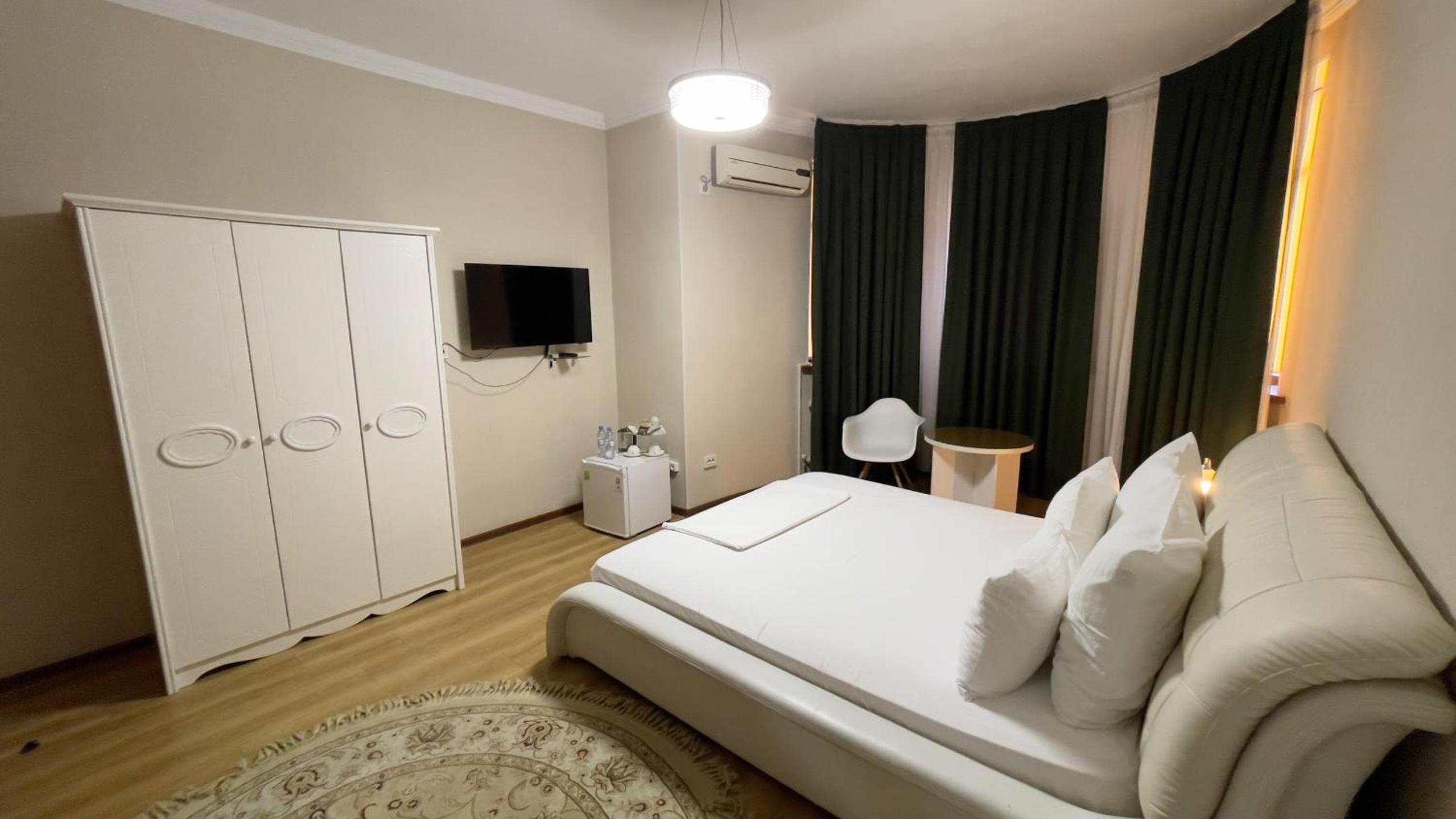 Altair Hotel, located just a 5-minute walk from Shymkent's central square, offers modern rooms with free WiFi access. The vibrant rooms and suites feature flat-screen TVs, minibars, and comfortable bedding options, including round beds in some rooms. The en suite bathrooms are equipped with complimentary toiletries, slippers, and hairdryers for guests' convenience.
