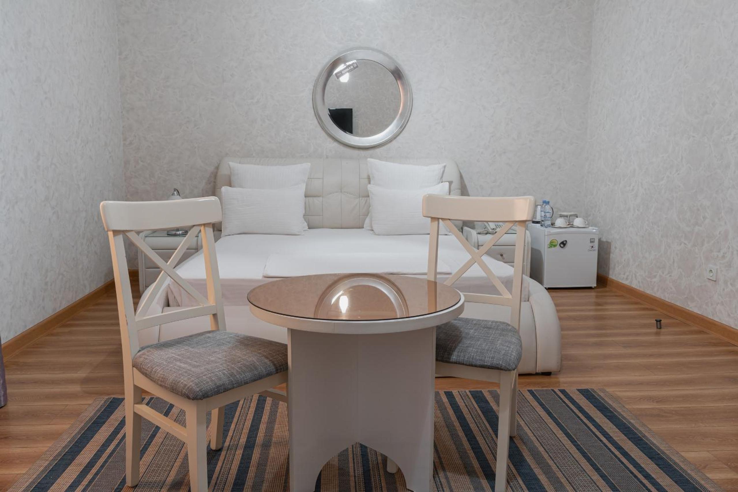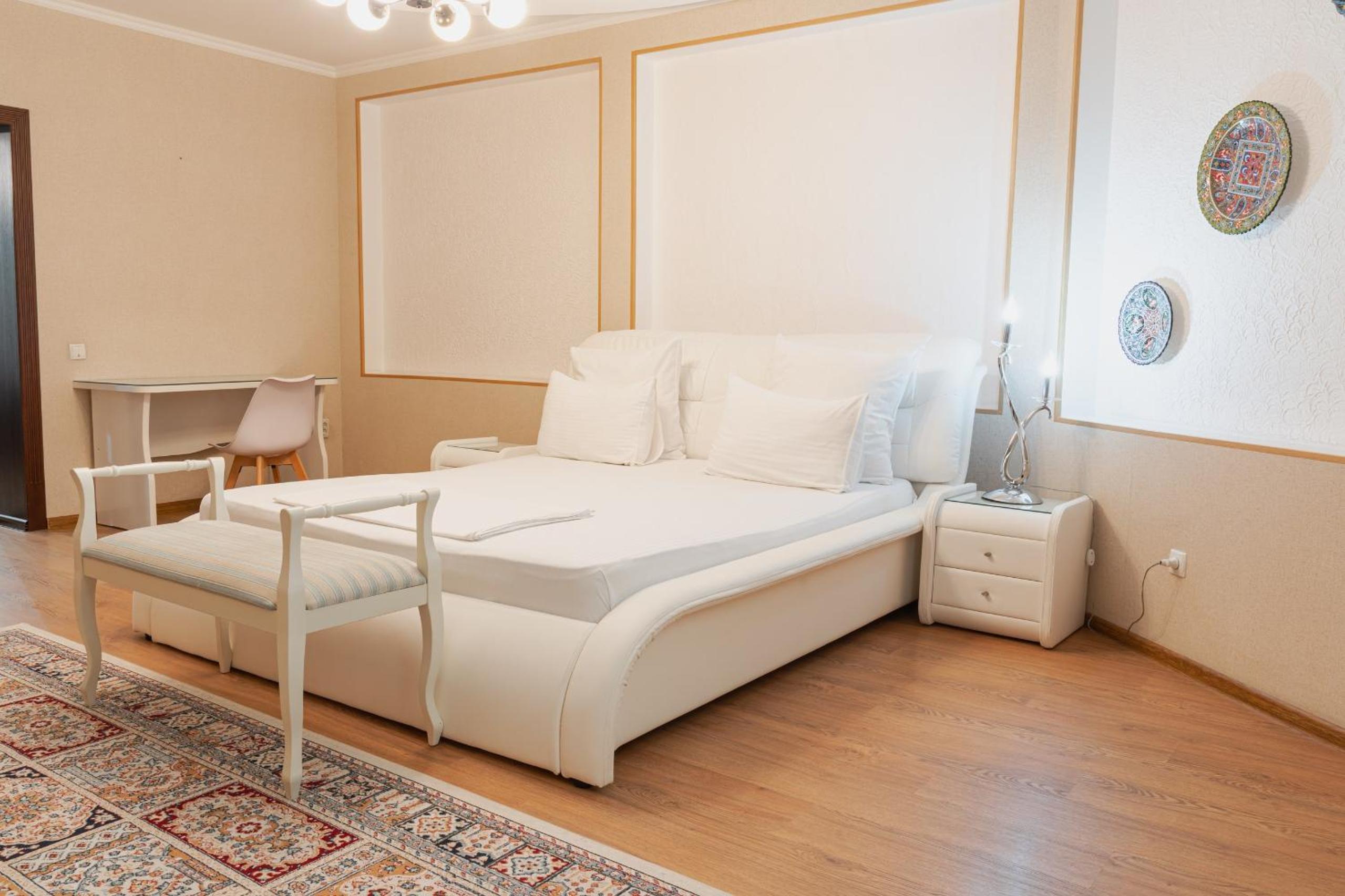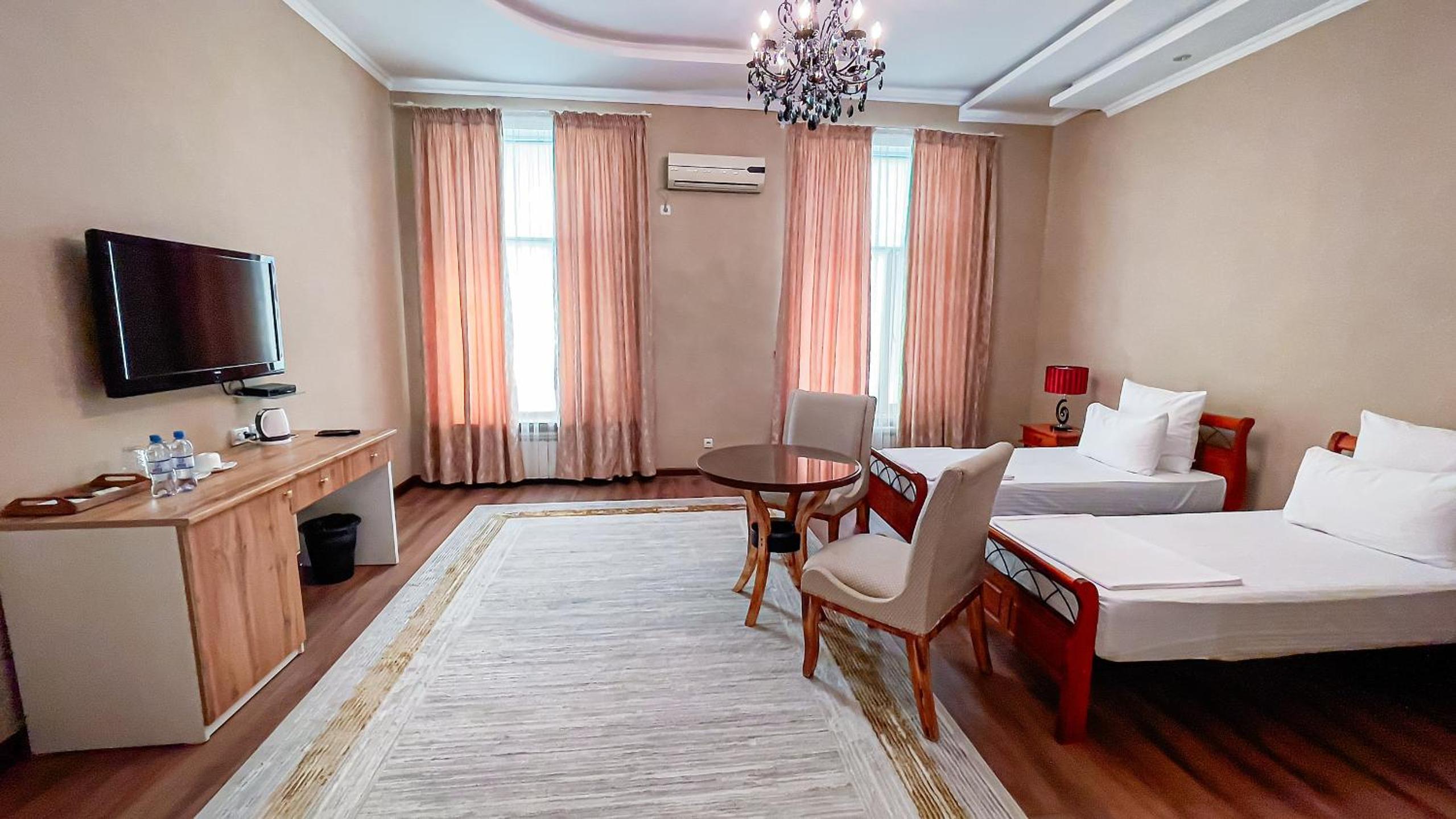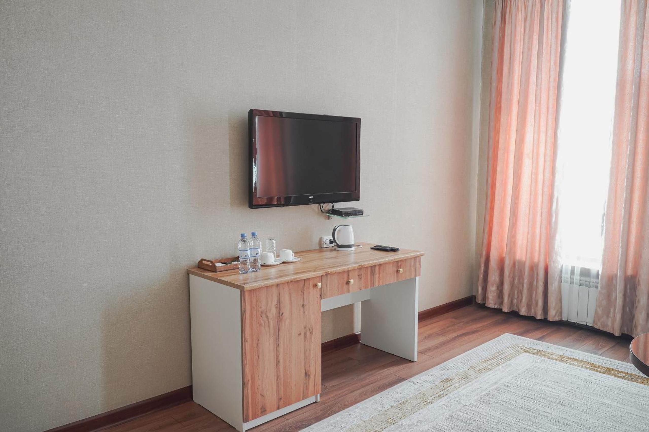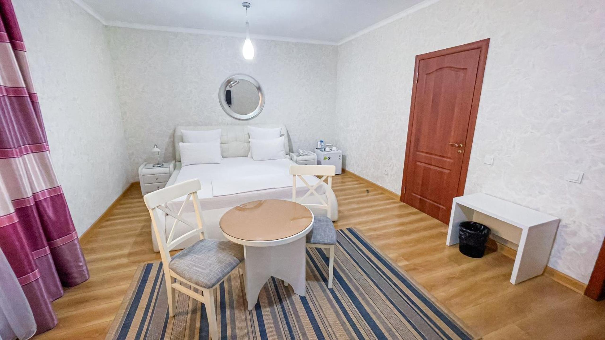 Altair Hotel, located just a 5-minute walk from Shymkent's central square, offers modern rooms with free WiFi access. The vibrant rooms and suites feature flat-screen TVs, minibars, and comfortable bedding options, including round beds in some rooms. The en suite bathrooms are equipped with complimentary toiletries, slippers, and hairdryers for guests' convenience.