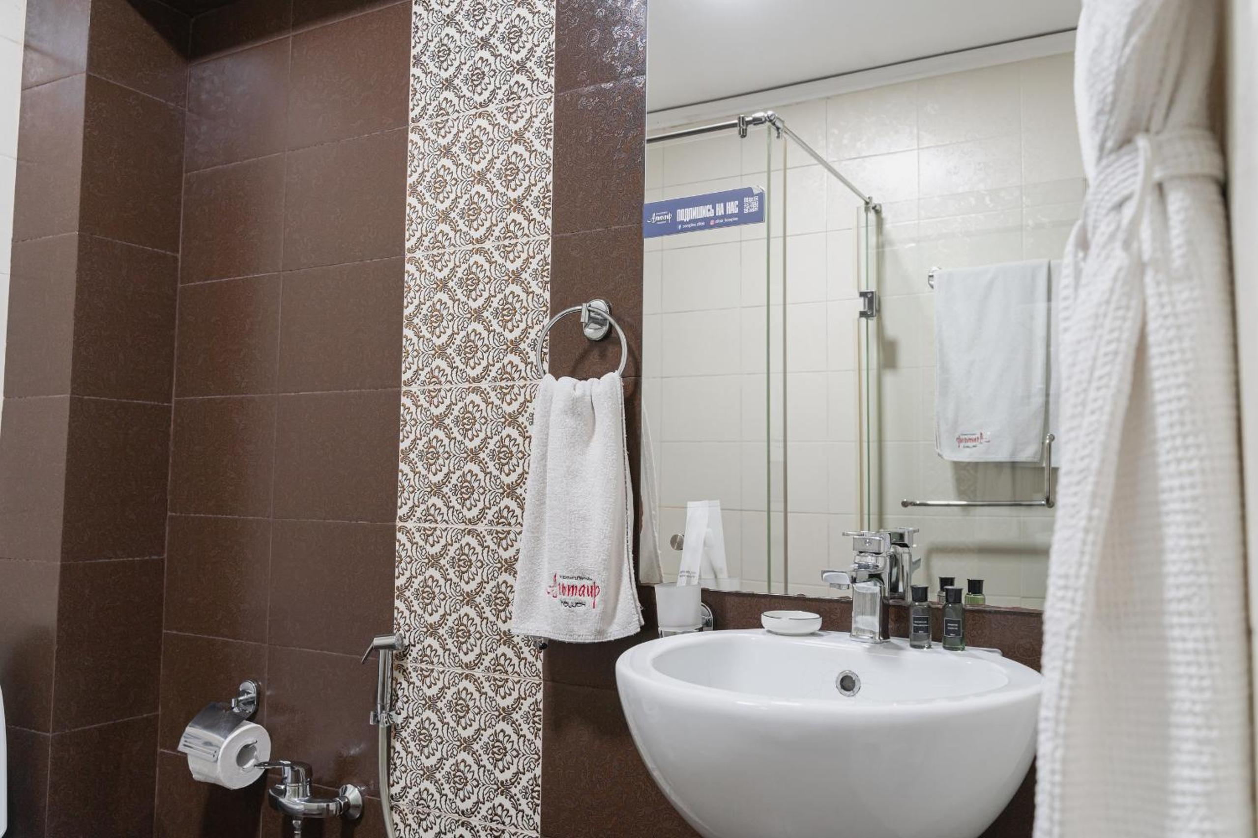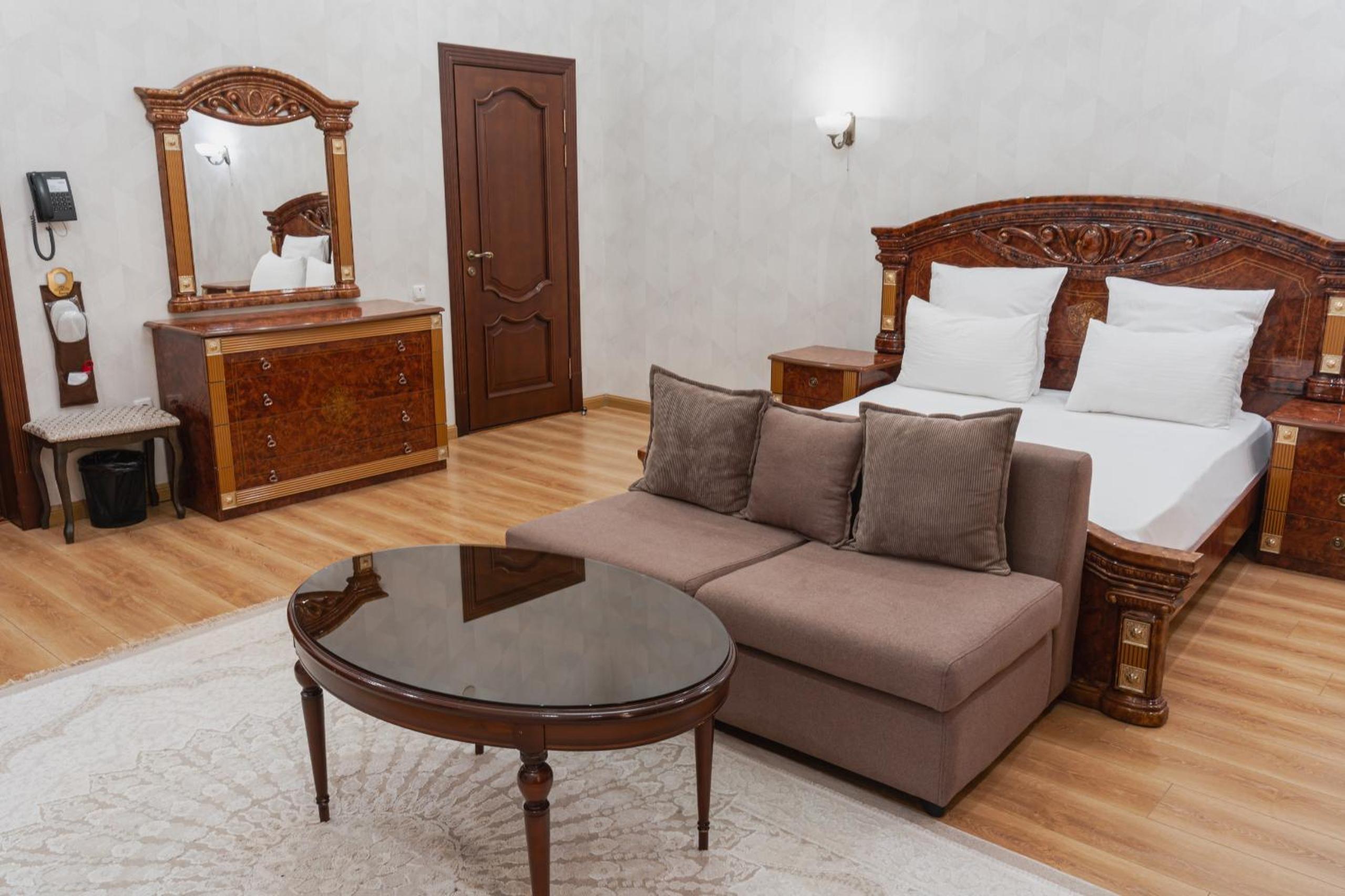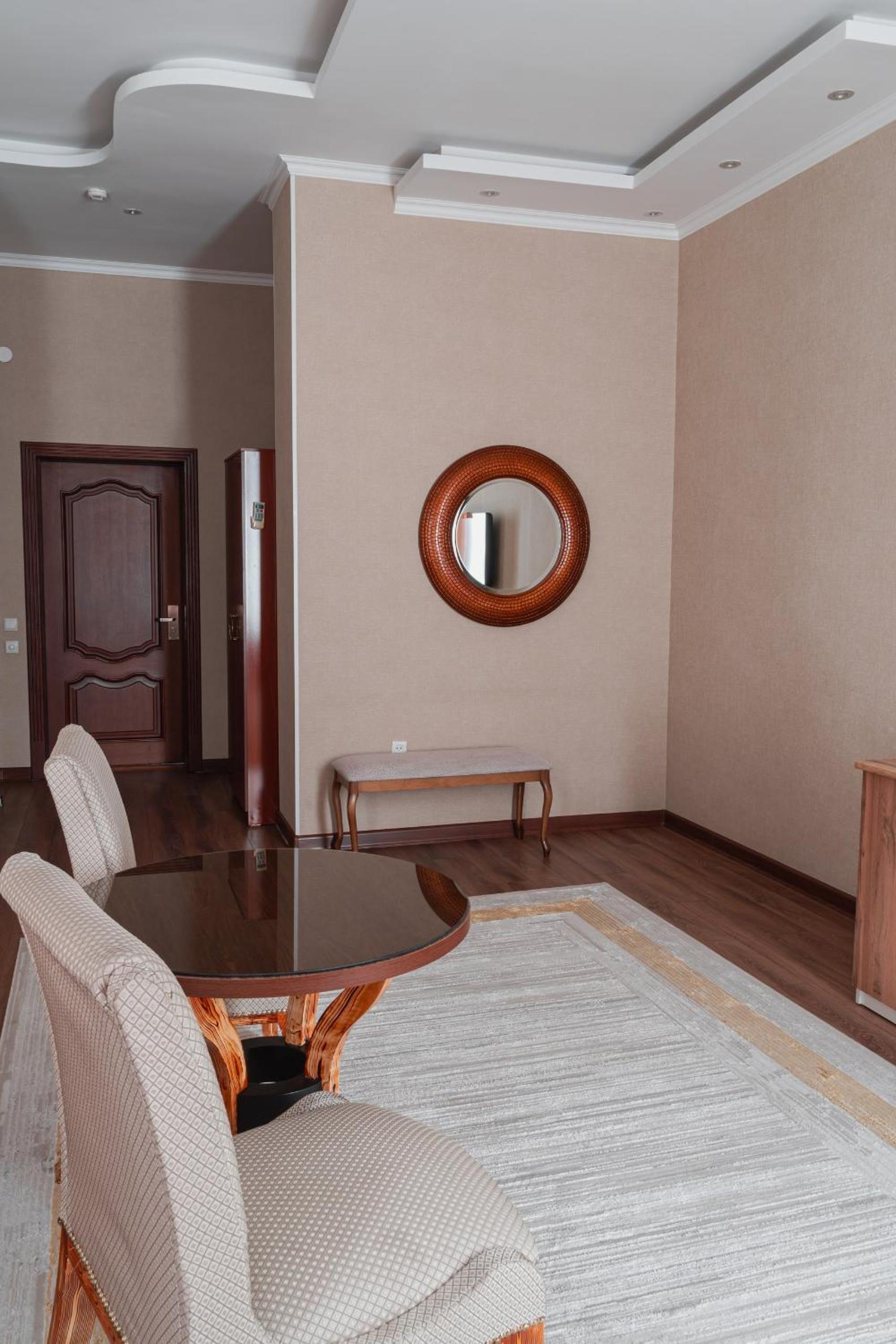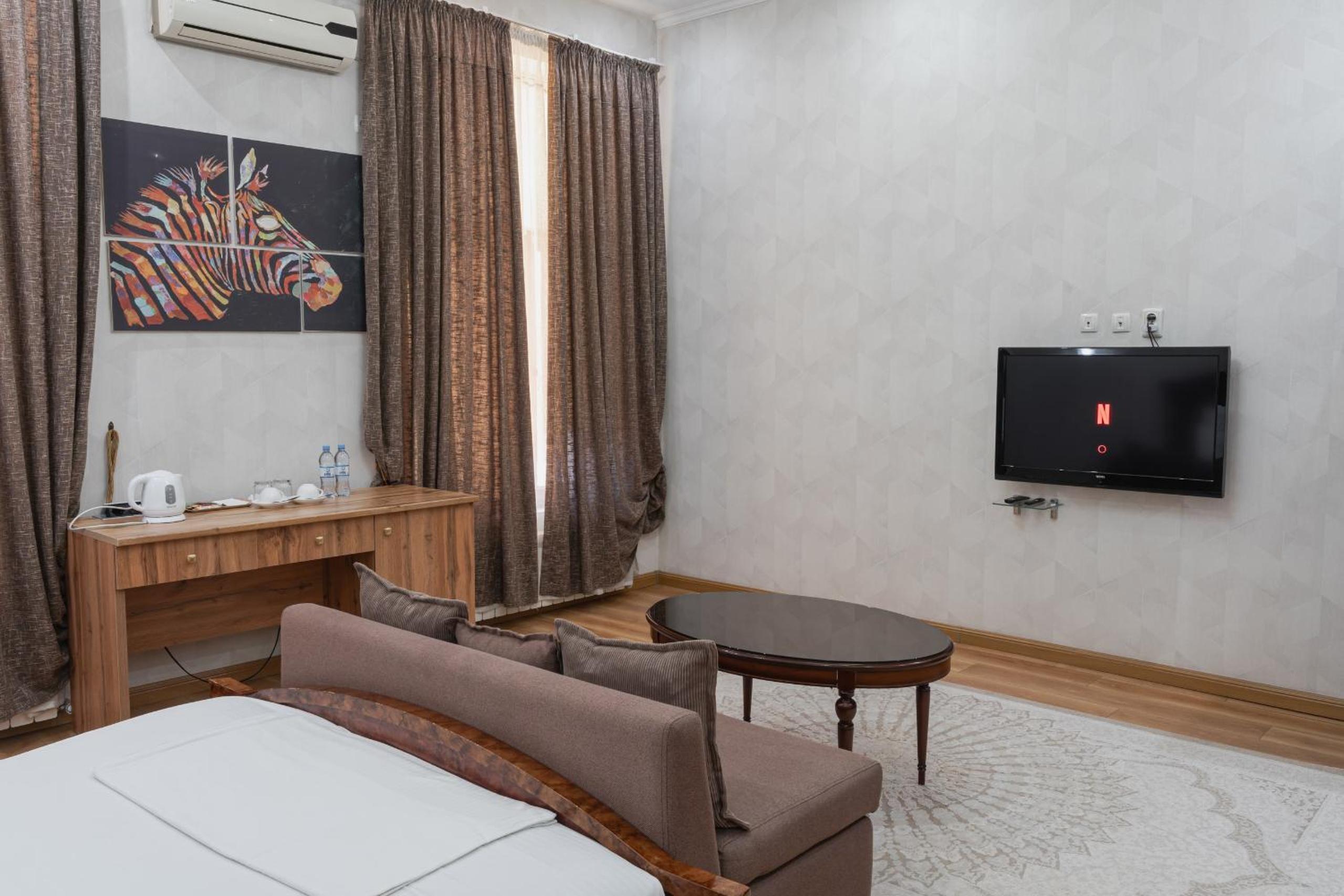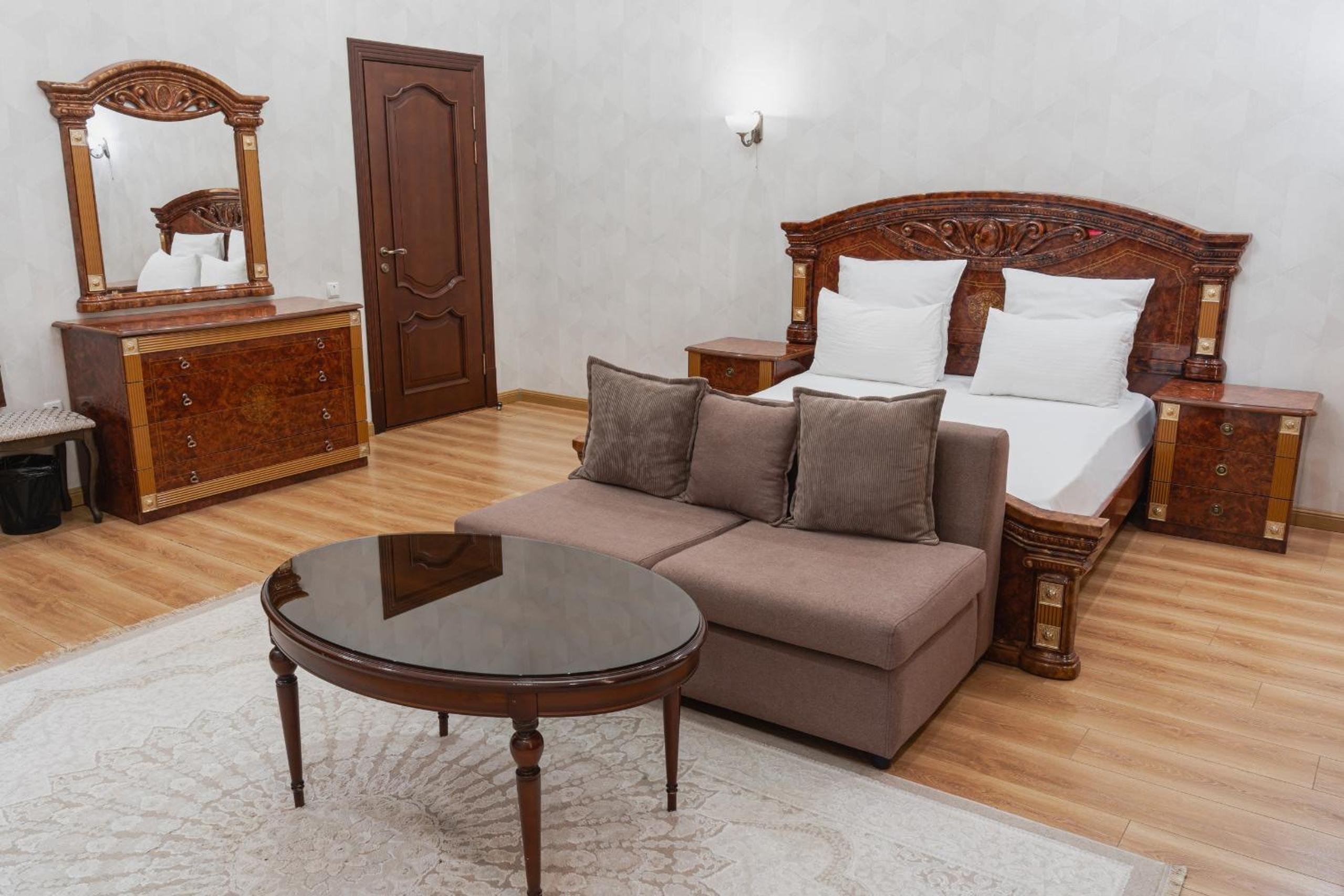Altair Hotel, located just a 5-minute walk from Shymkent's central square, offers modern rooms with free WiFi access. The vibrant rooms and suites feature flat-screen TVs, minibars, and comfortable bedding options, including round beds in some rooms. The en suite bathrooms are equipped with complimentary toiletries, slippers, and hairdryers for guests' convenience.