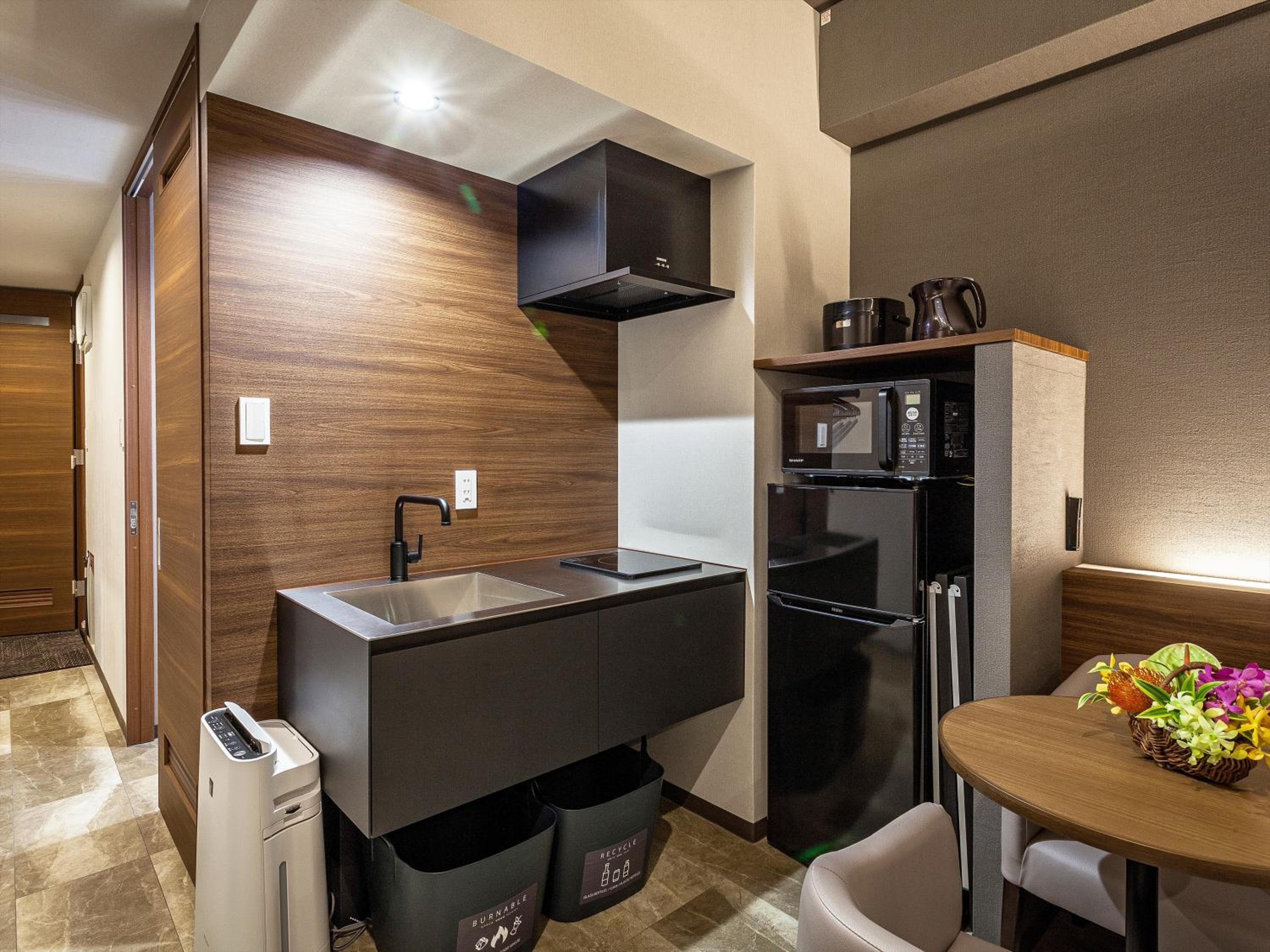 房間有餐具及烘衣機微波爐
