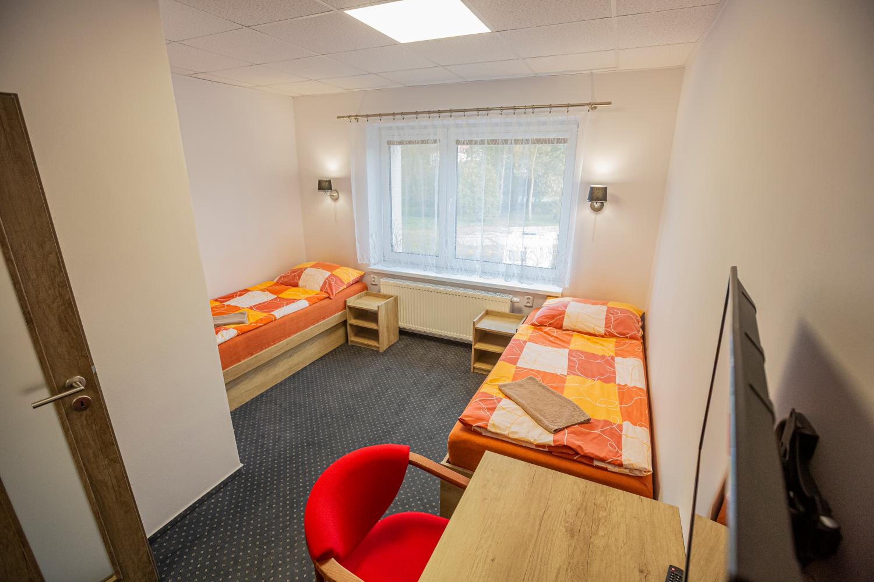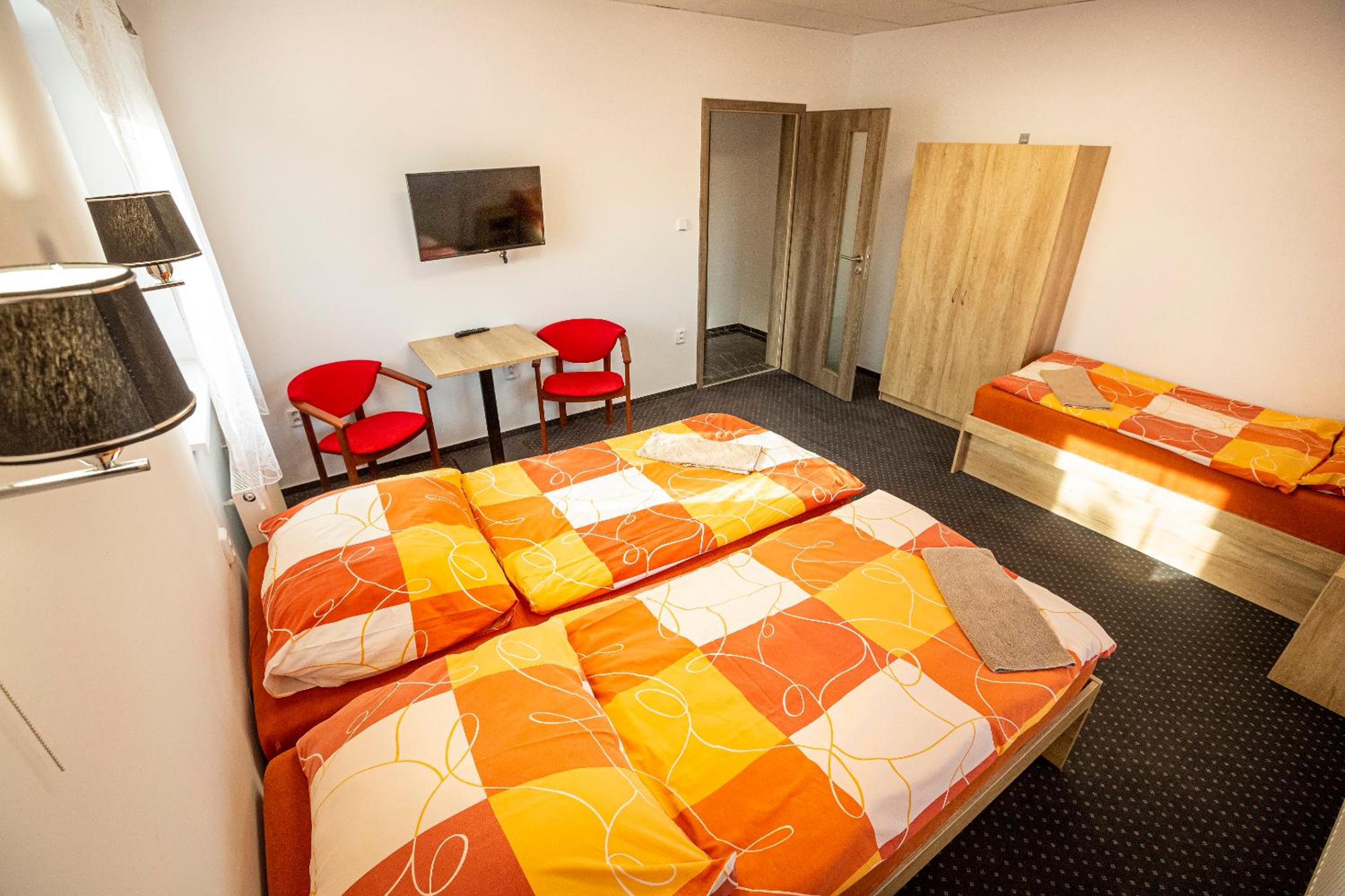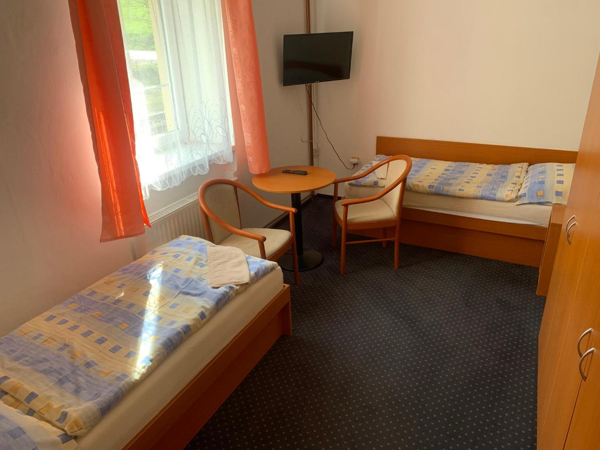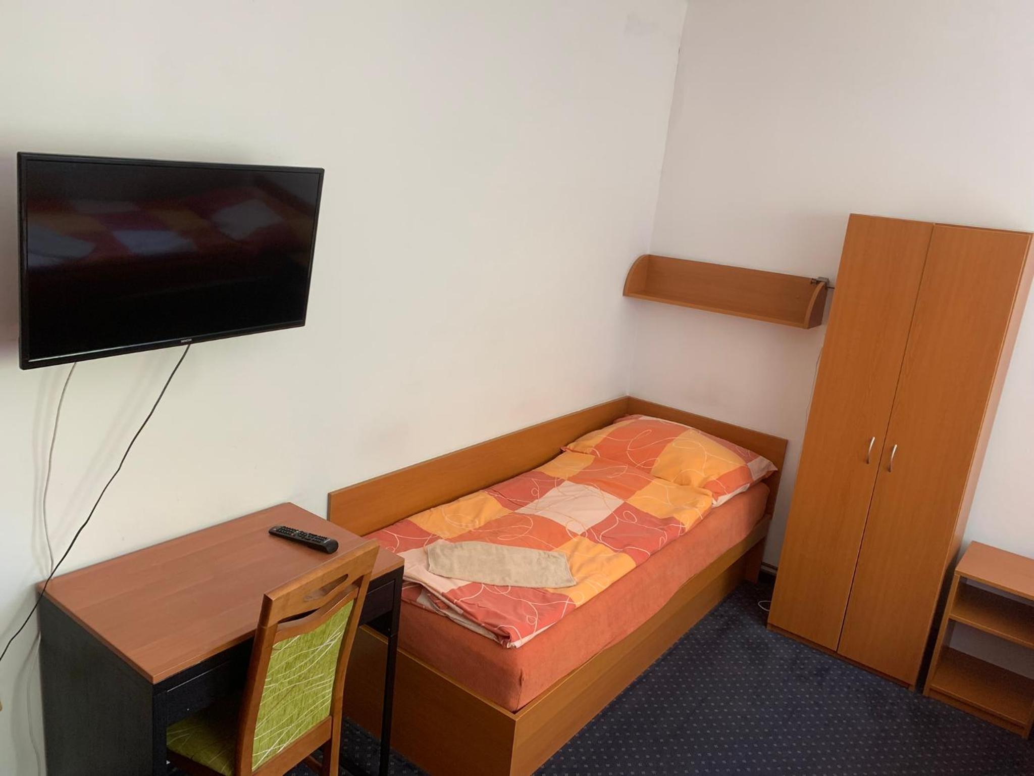 Na pokoji je trošku znát, že tam bývají ubytovaní dělníci. Nic proti nim, ale olezlá zeď nad postelí a podobně.