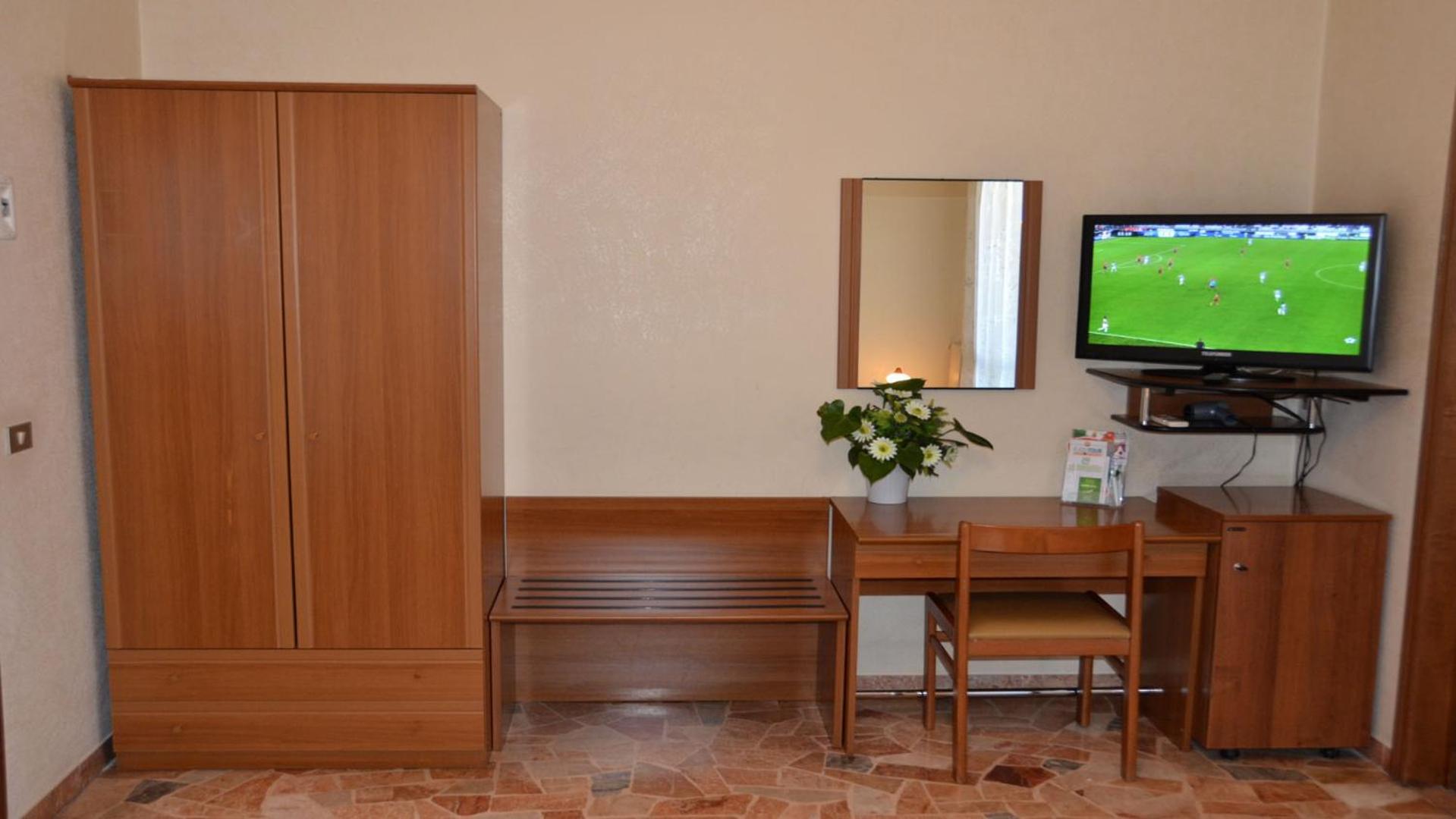In camera (43) mancava la lampadina nel lume sulla scrivania. Non sono offerte pantofole.