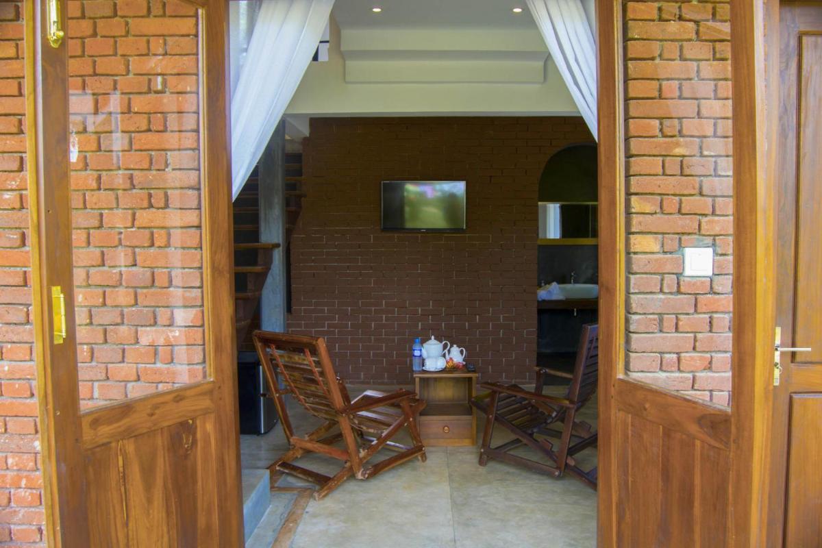 Garden Oasis: Enjoy the serene garden surroundings and relax in the sun terrace at Sigiri Arana Luxury Chalets.