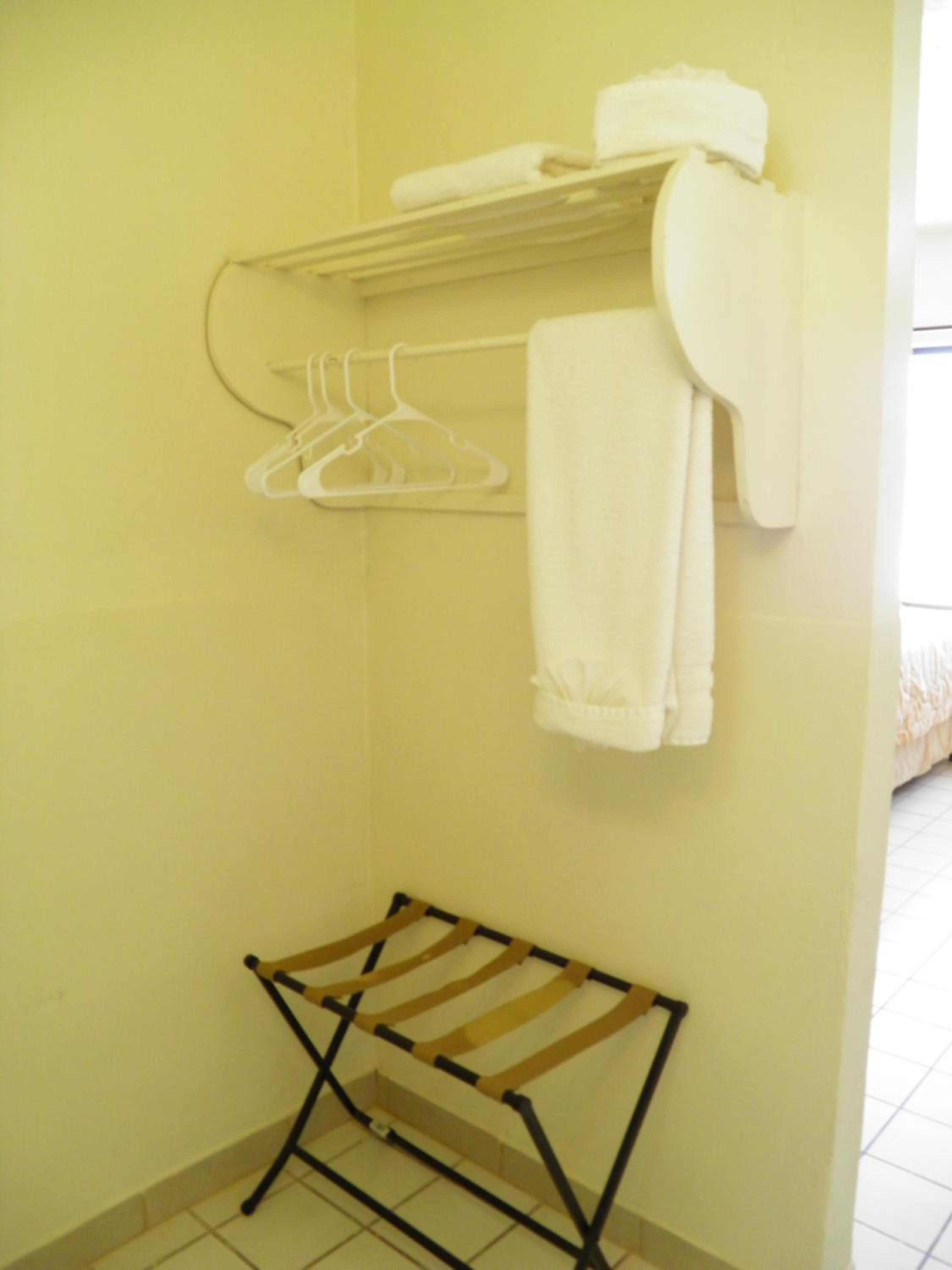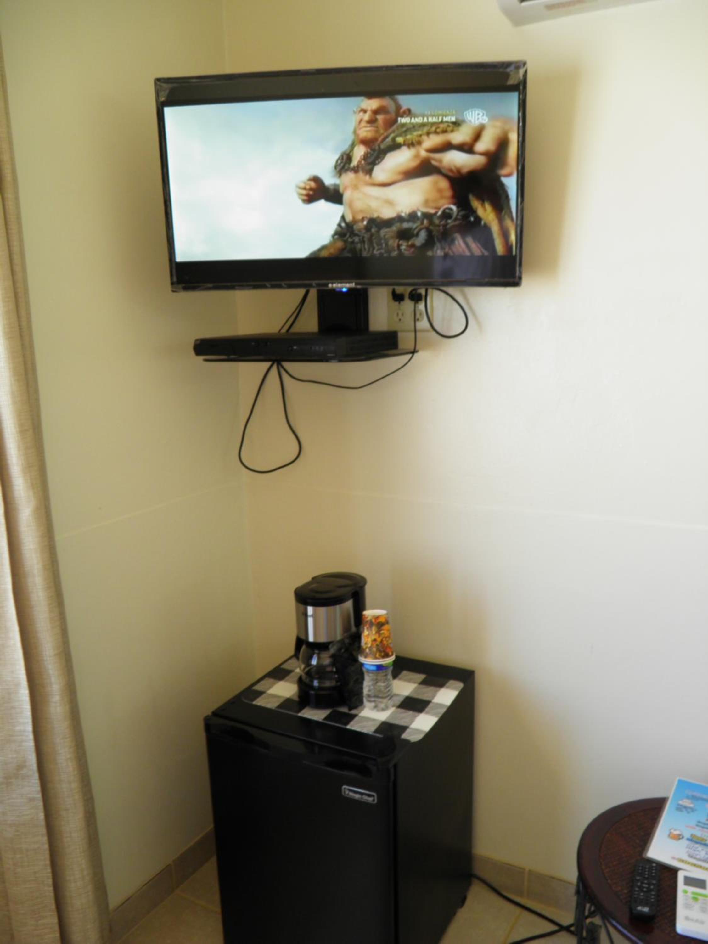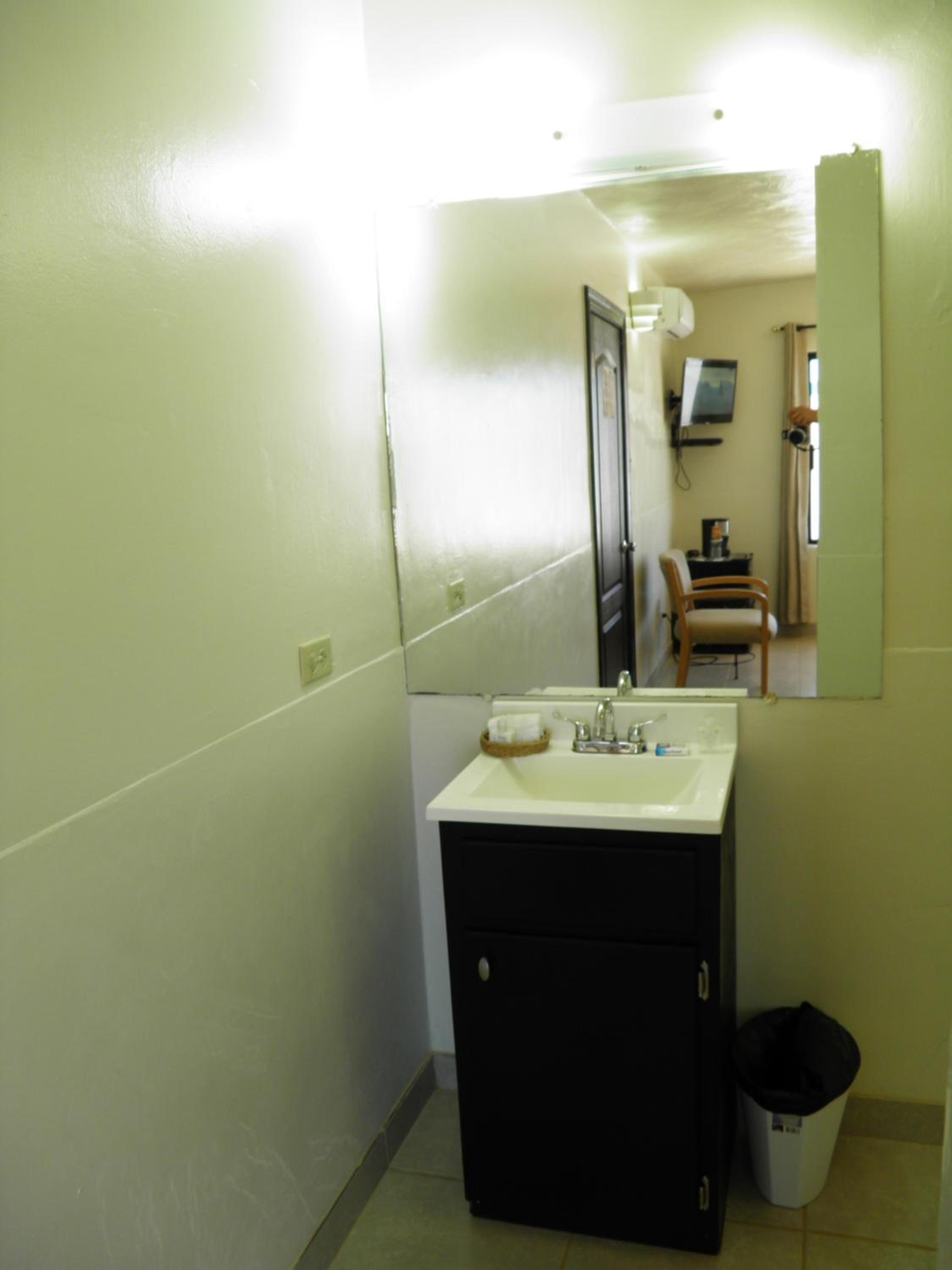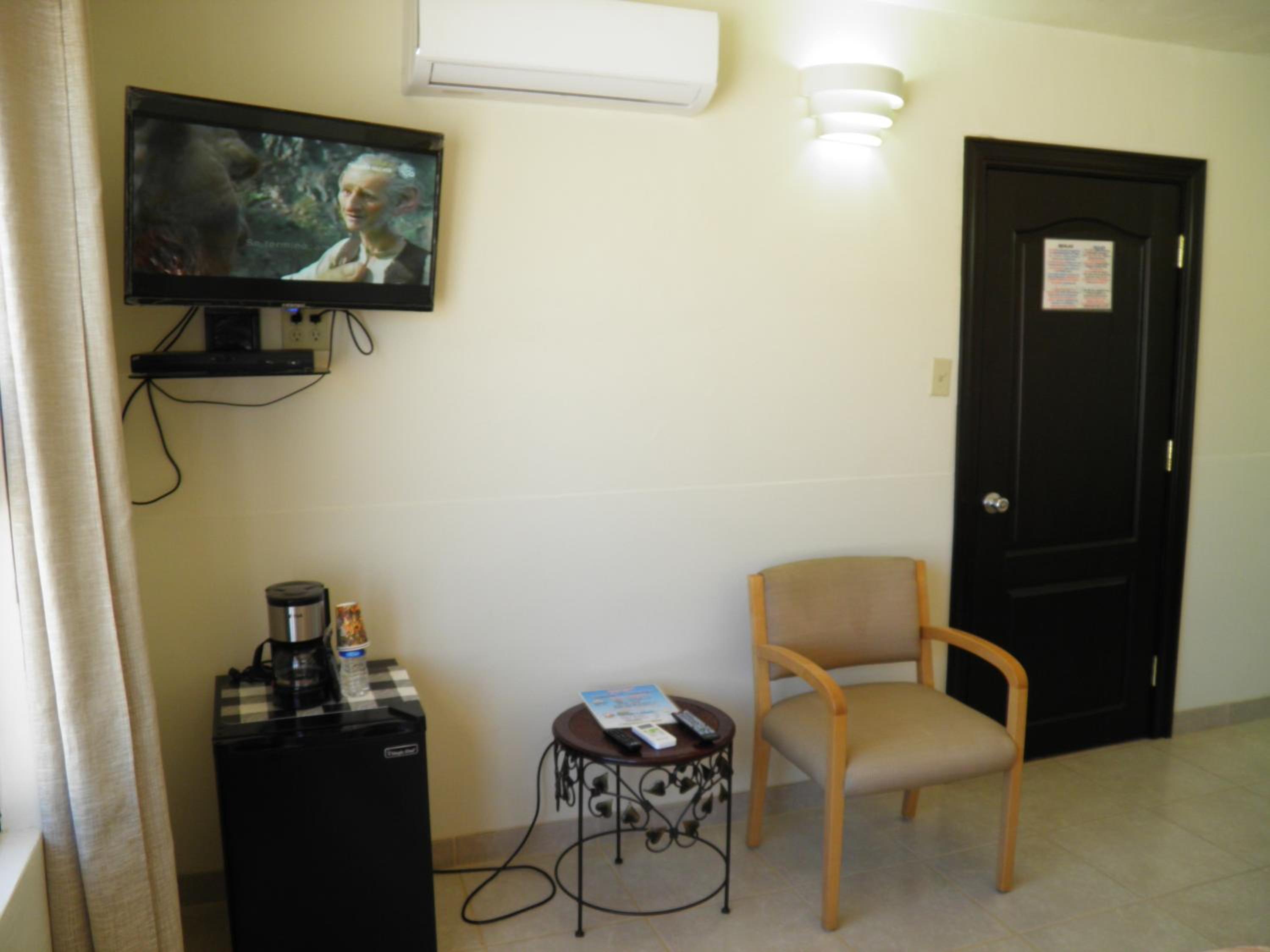 There is a fridge in the room. The bathroom sink is a decent size. Dogs allowed. The beach is nice with great sand.