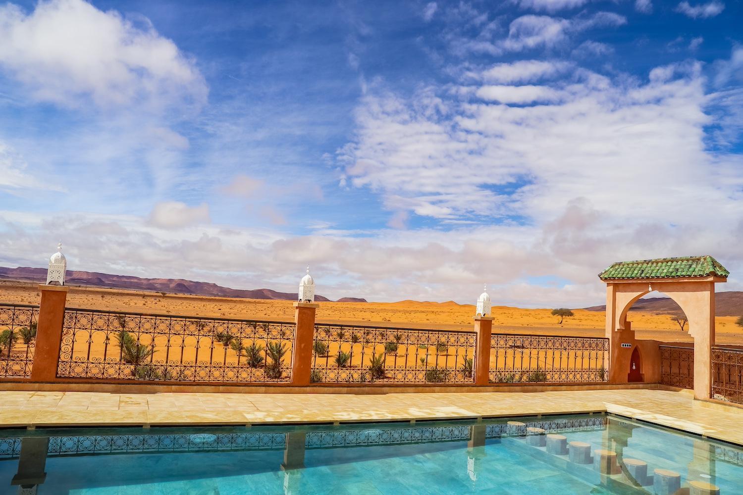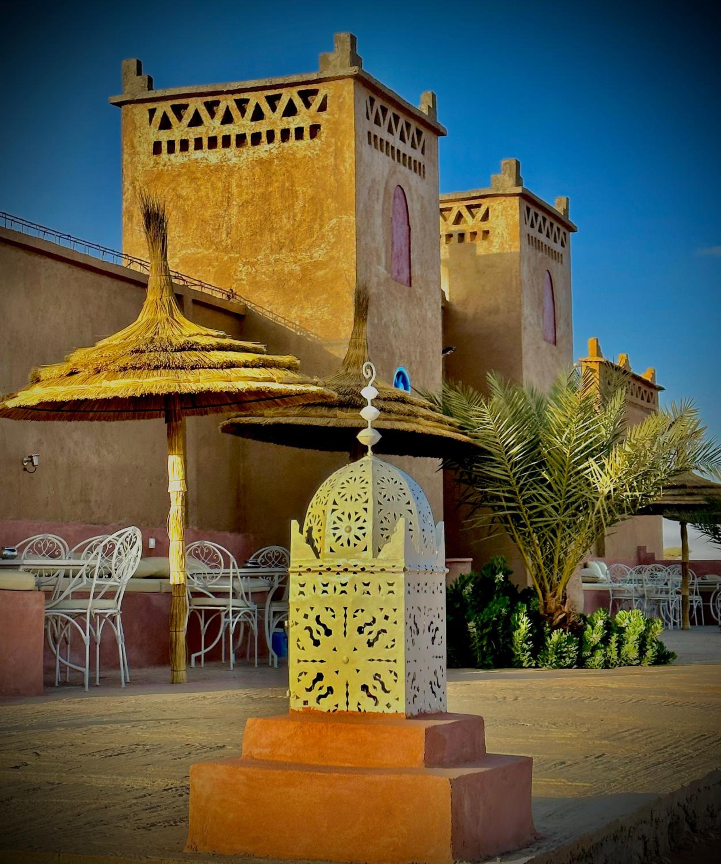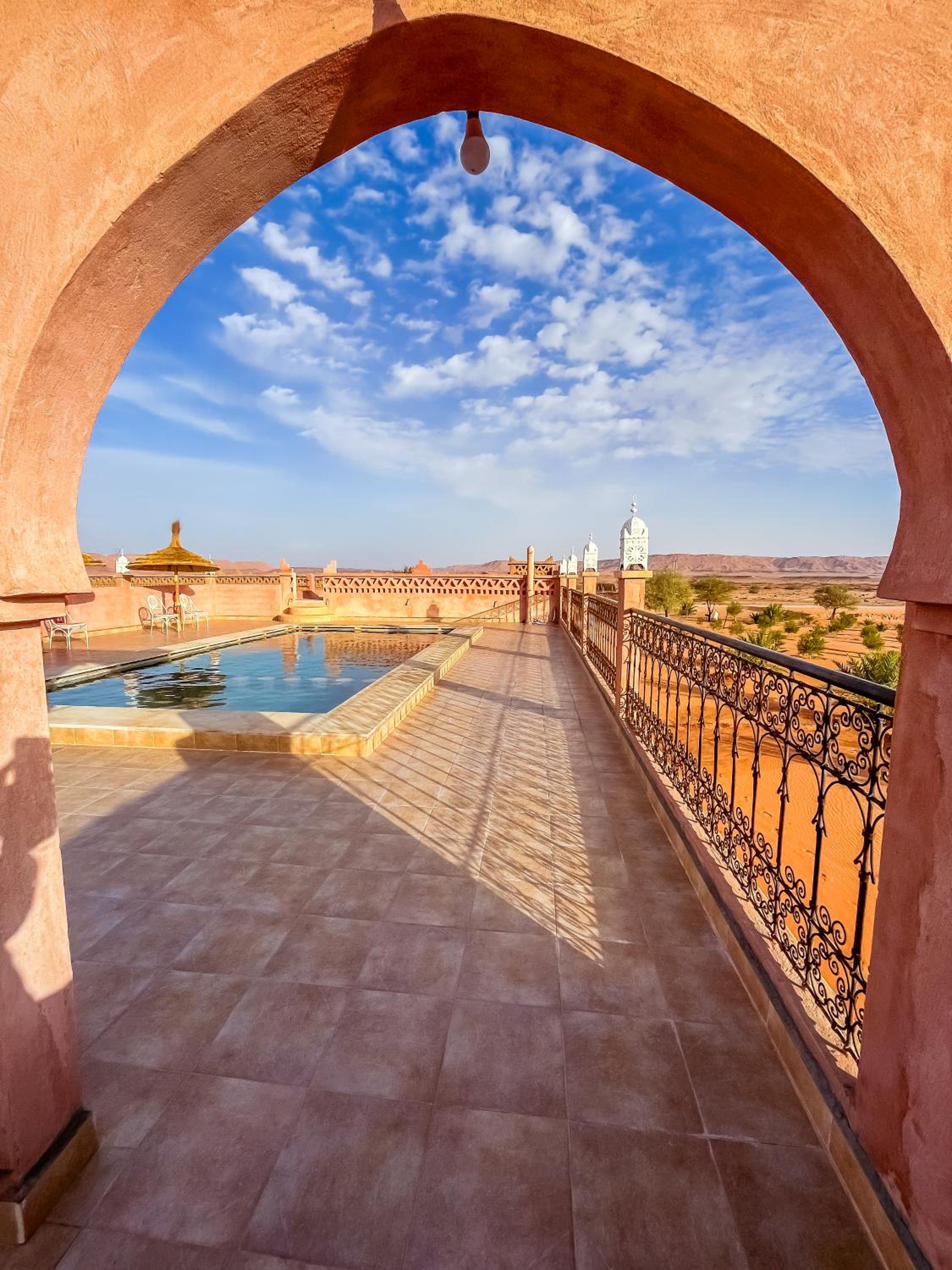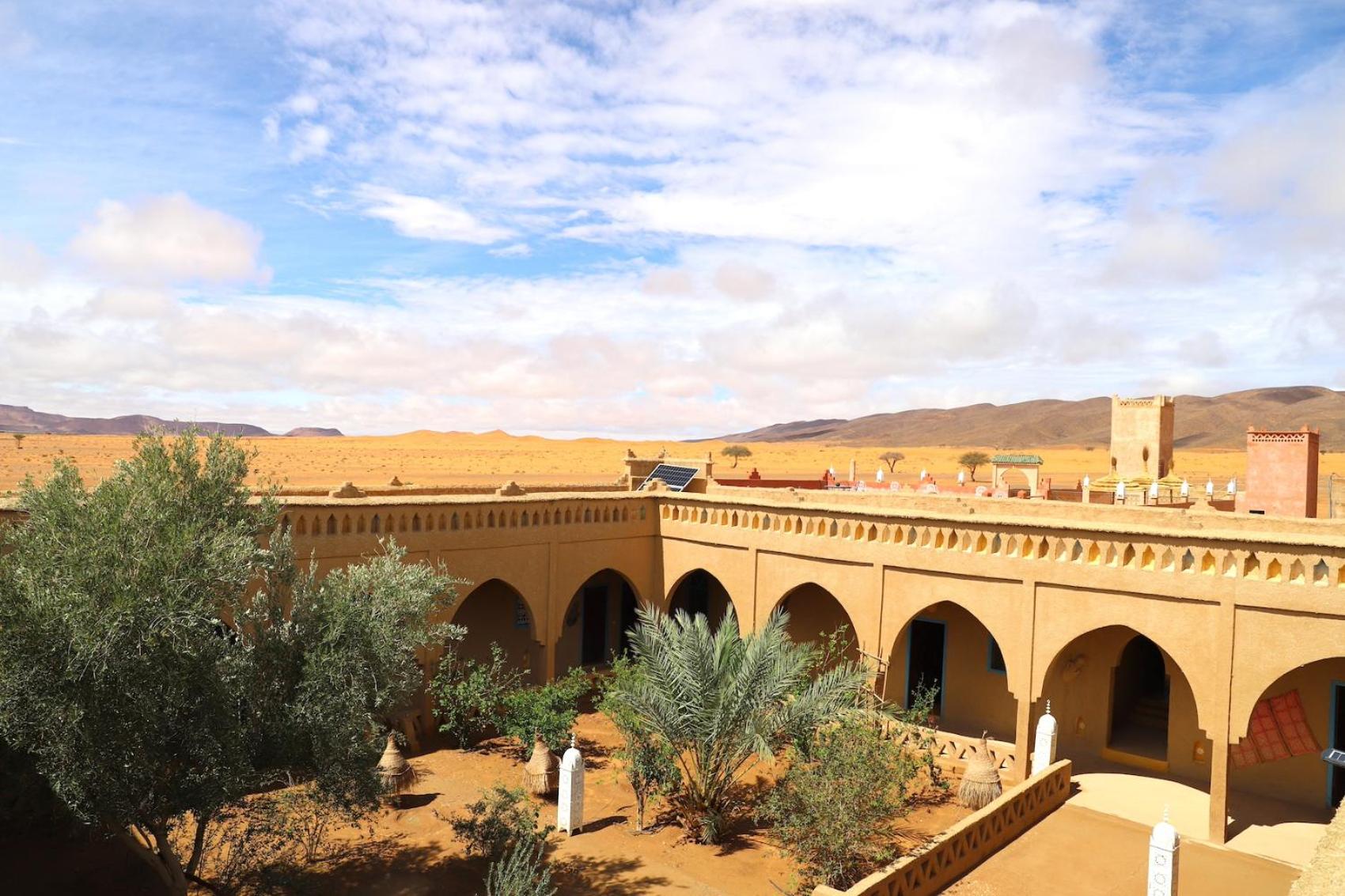 Un emplacement au calme, à 50km de Merzouga, seul dans la nature ou presque. J'étais le seul client de l'hôtel, et j'ai apprécié le silence et la beauté du ciel étoilé. En demi pension, nourriture abondante et bien préparée, que ce soit le soir ou le matin. Une piscine à dispo sur le toit de l'hôtel. Des dunes pas loin, 3km en voiture et vous êtes au pied !!