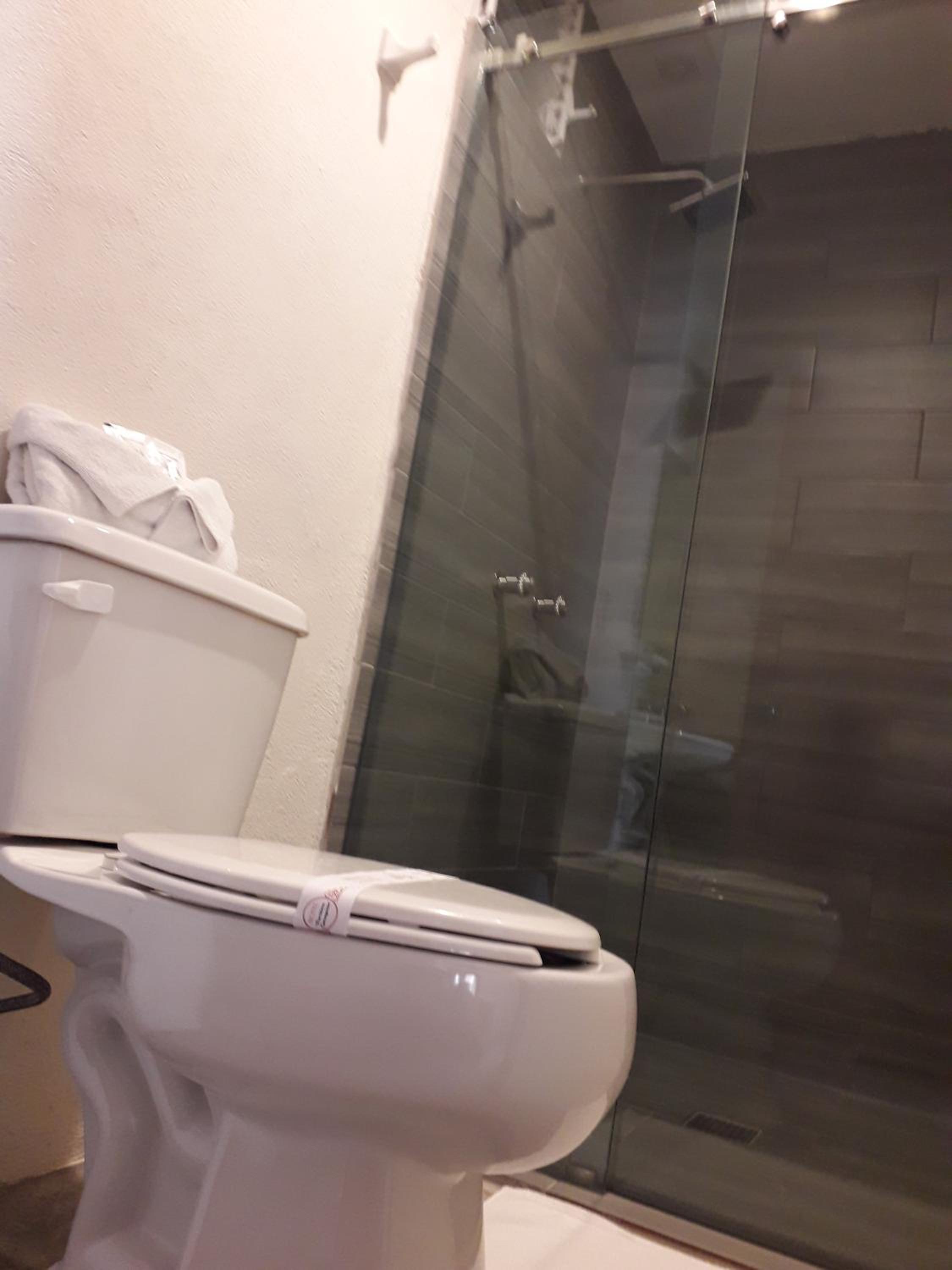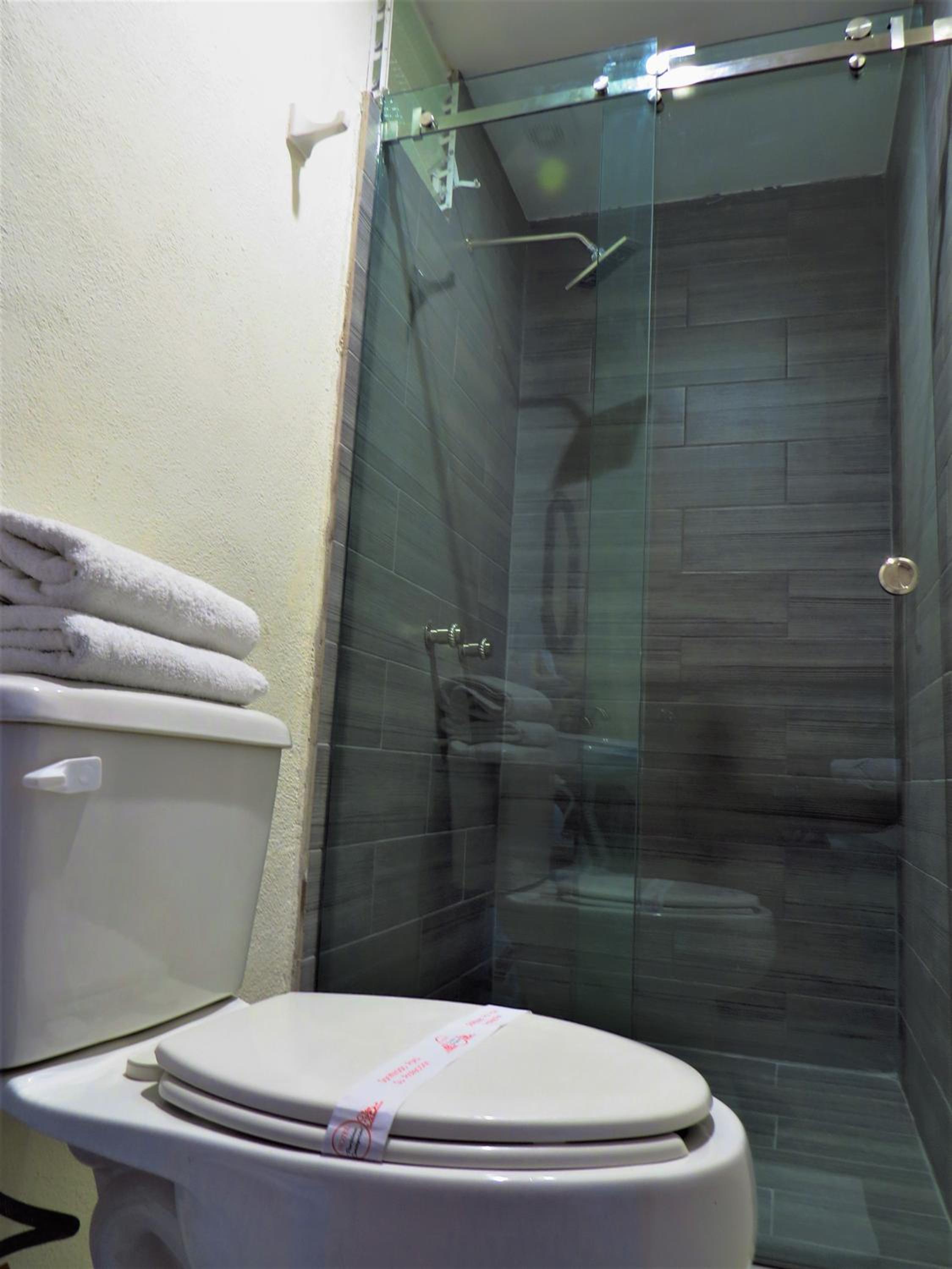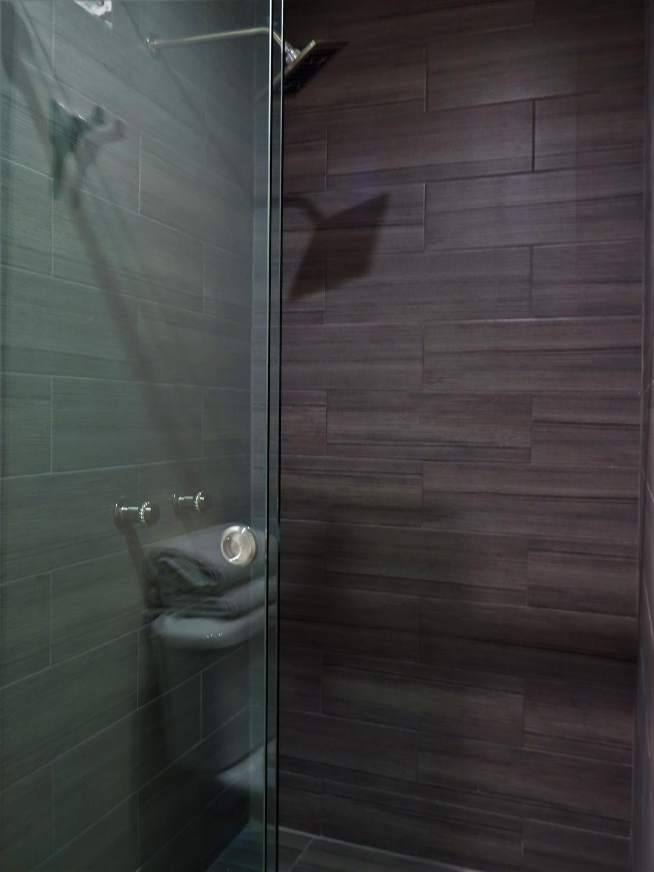 La cama King size y la ducha.