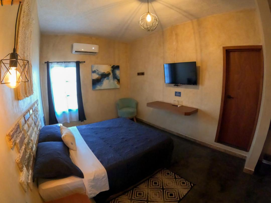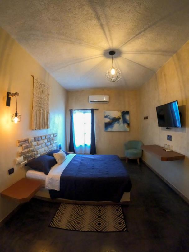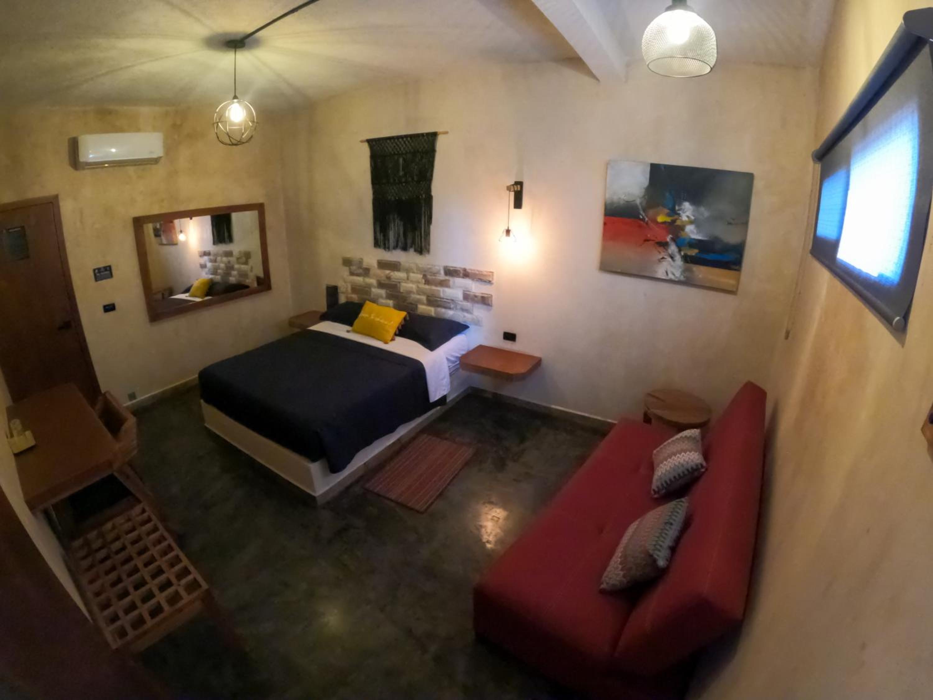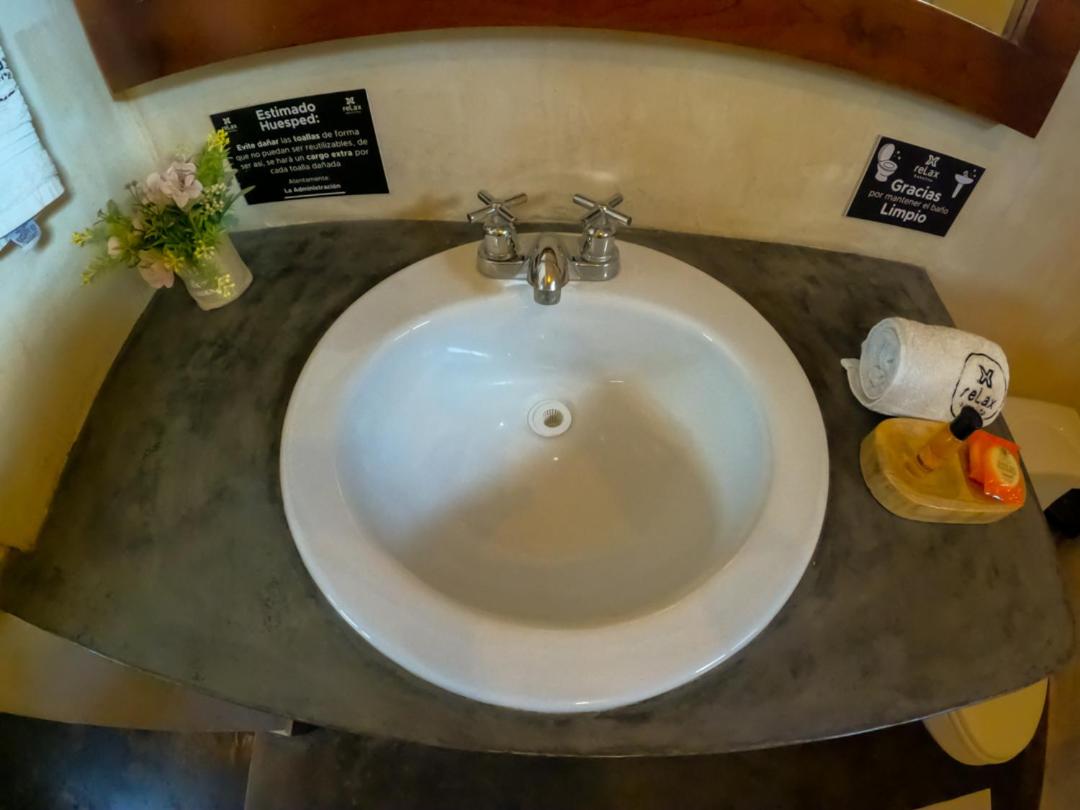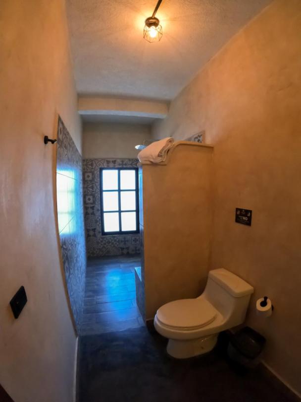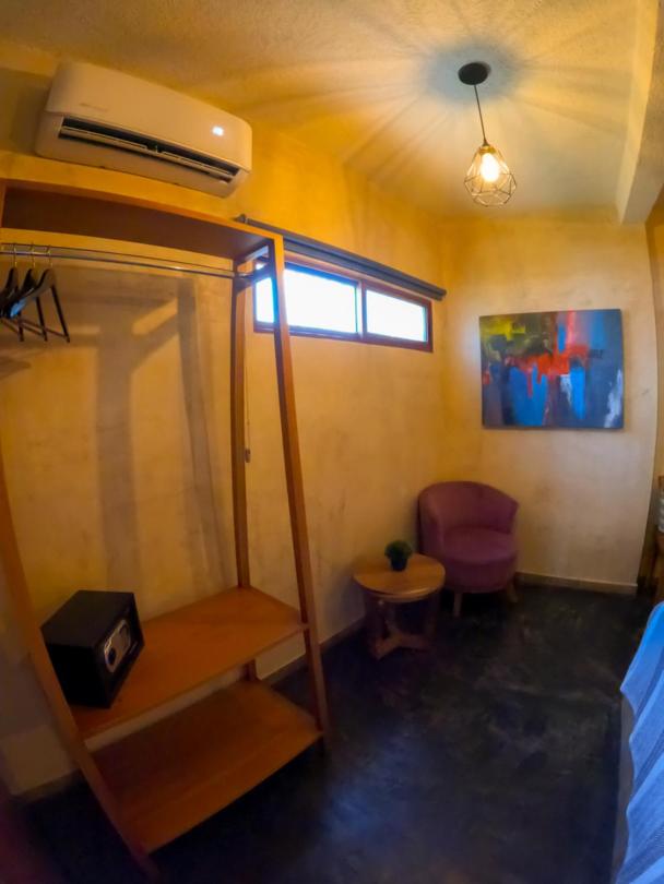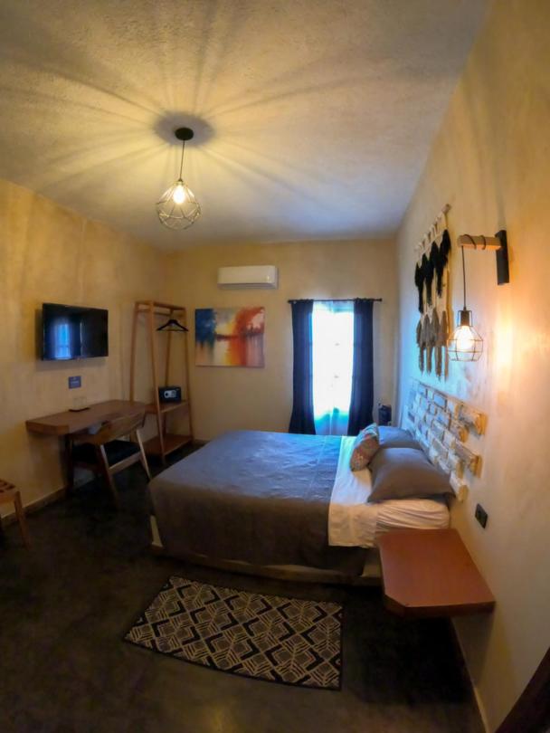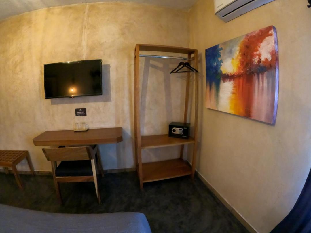 This room is great for an overnight stay. Basically a bed and shower. No coffee machine, no mini fridge...small selection of cold drinks in cooler downstairs and OXXO a block away. We both had showers, one in the evening and one in the morning. There was hot water for maybe a minute, then it went to cool, then only slightly warm. The neighbourhood was noisy (for us). We kept our windows closed...typical for the country.