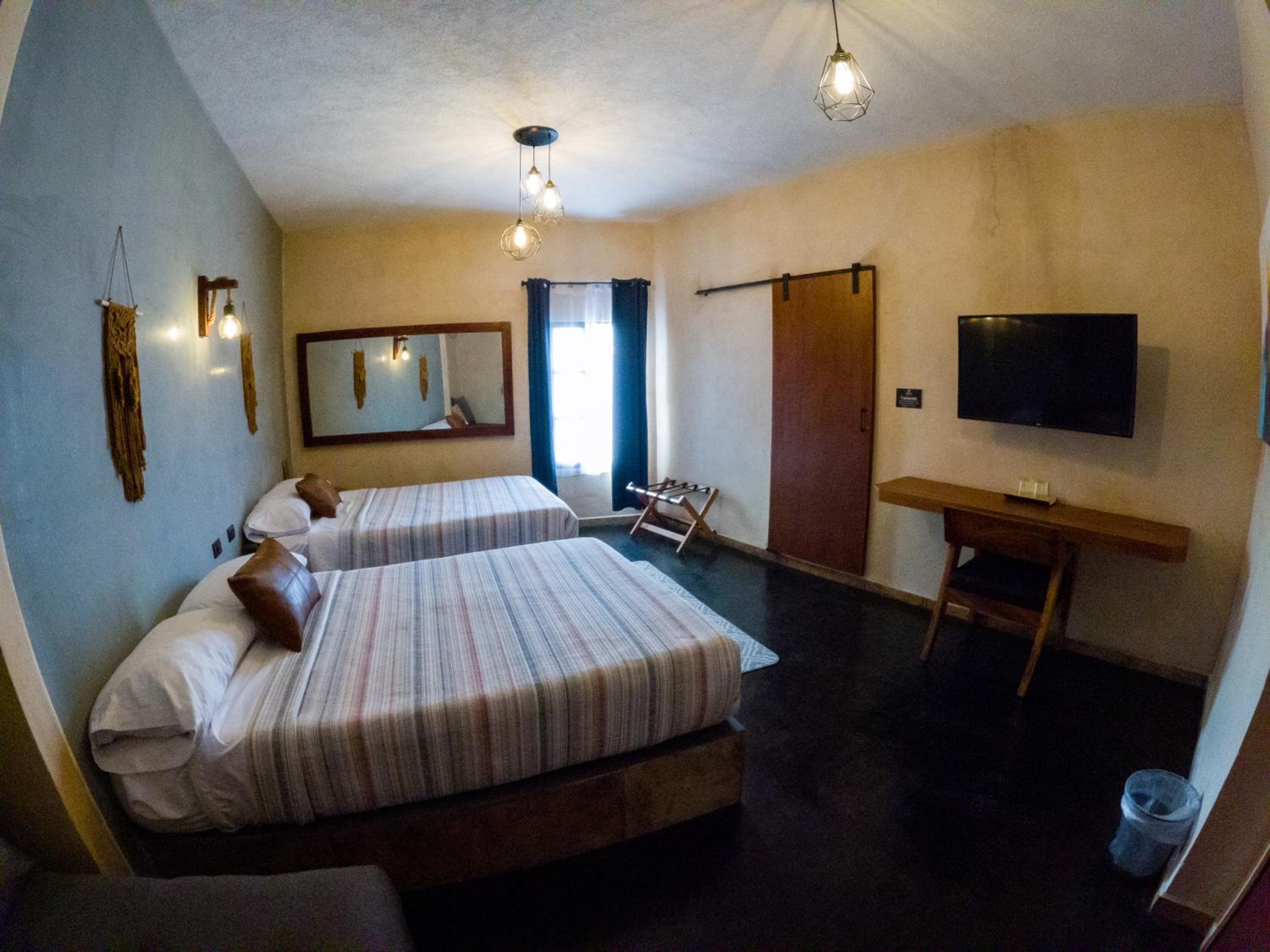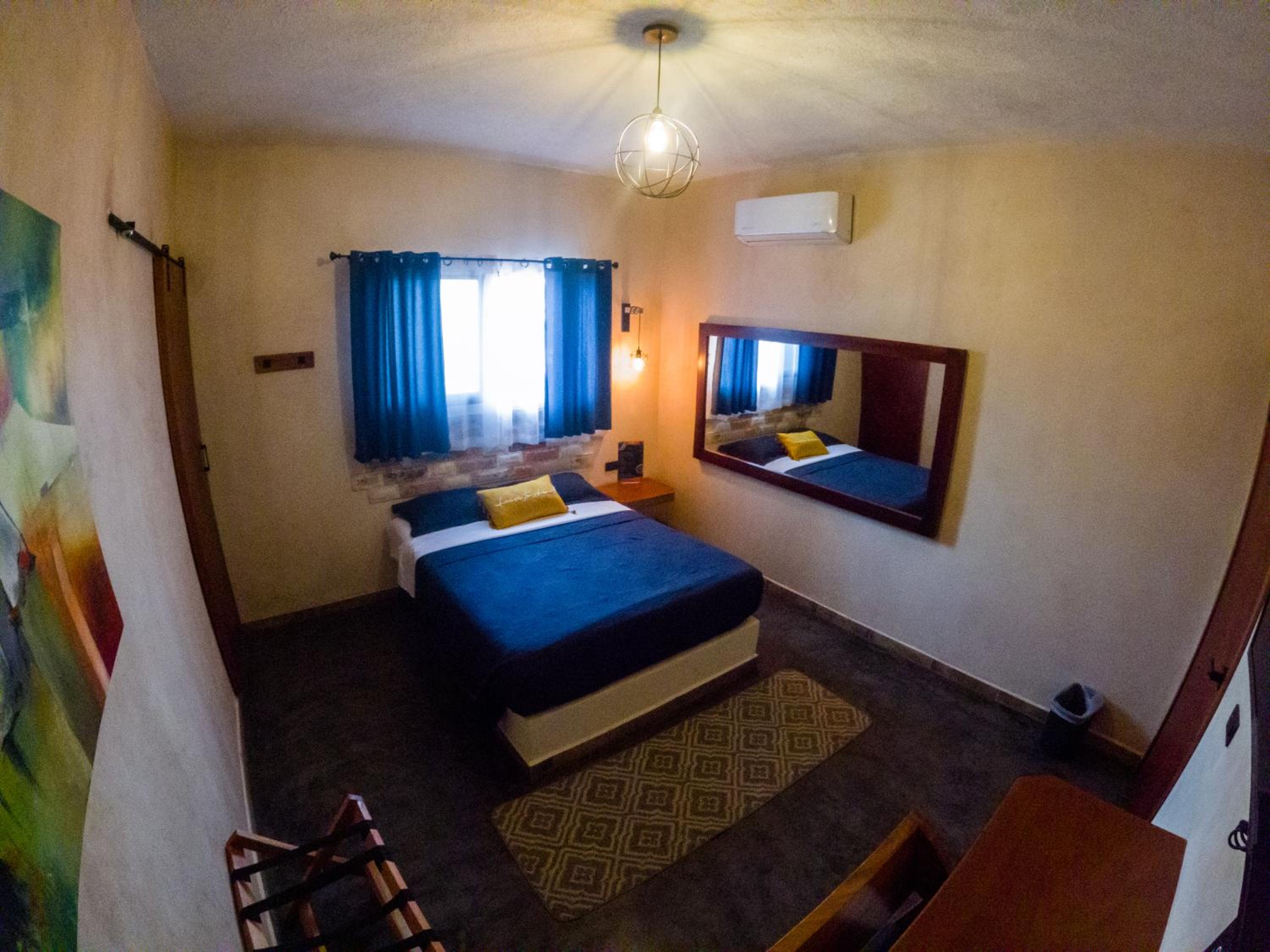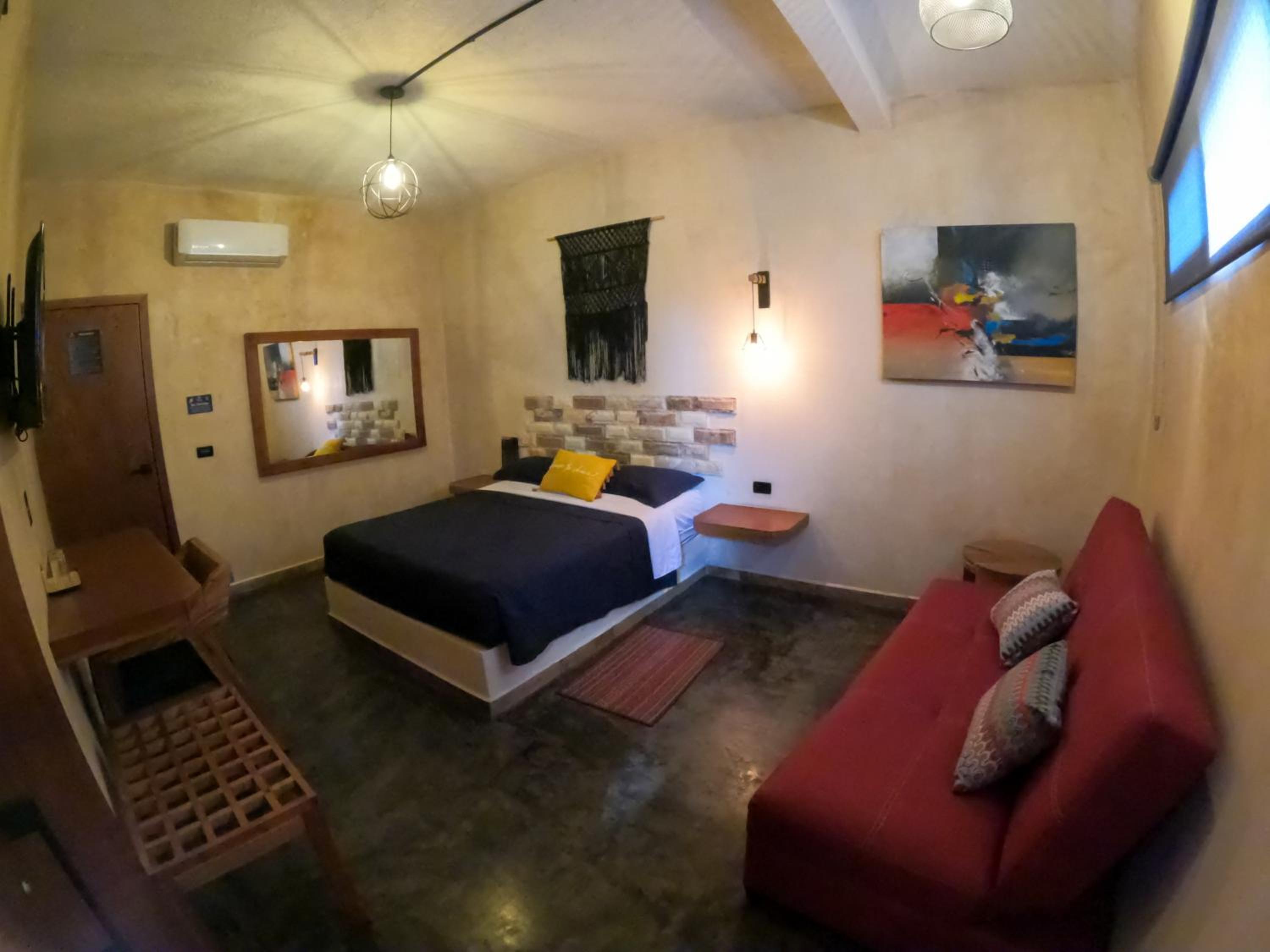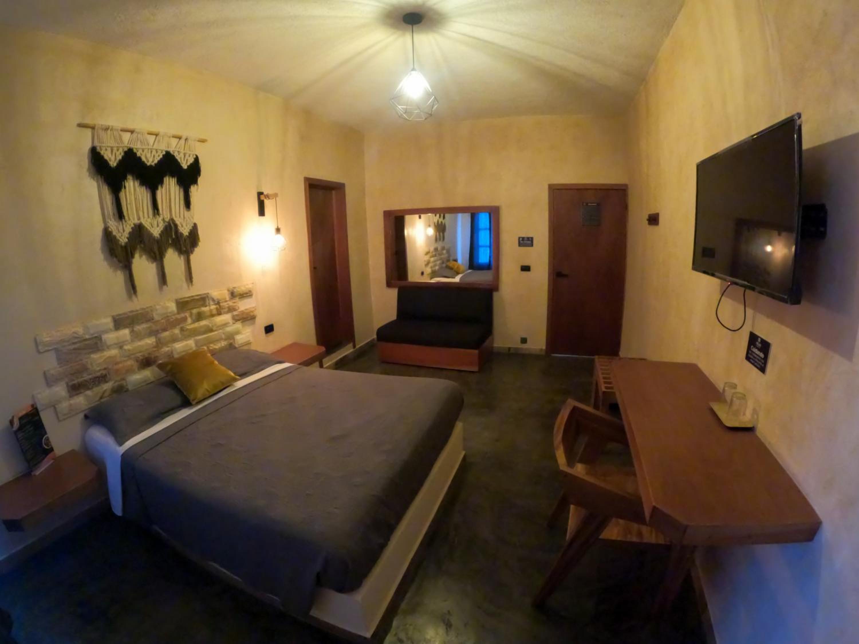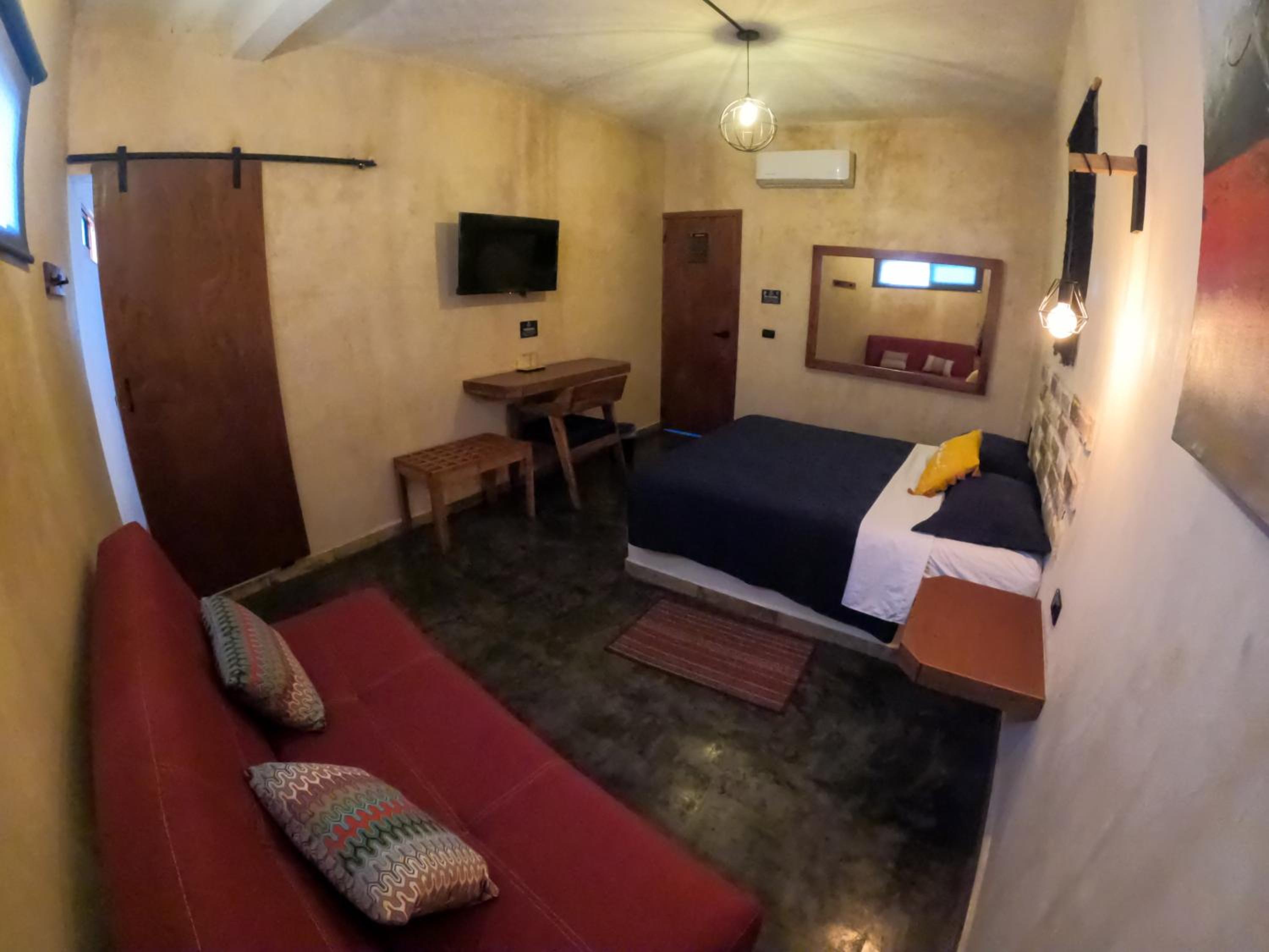 This room is great for an overnight stay. Basically a bed and shower. No coffee machine, no mini fridge...small selection of cold drinks in cooler downstairs and OXXO a block away. We both had showers, one in the evening and one in the morning. There was hot water for maybe a minute, then it went to cool, then only slightly warm. The neighbourhood was noisy (for us). We kept our windows closed...typical for the country.