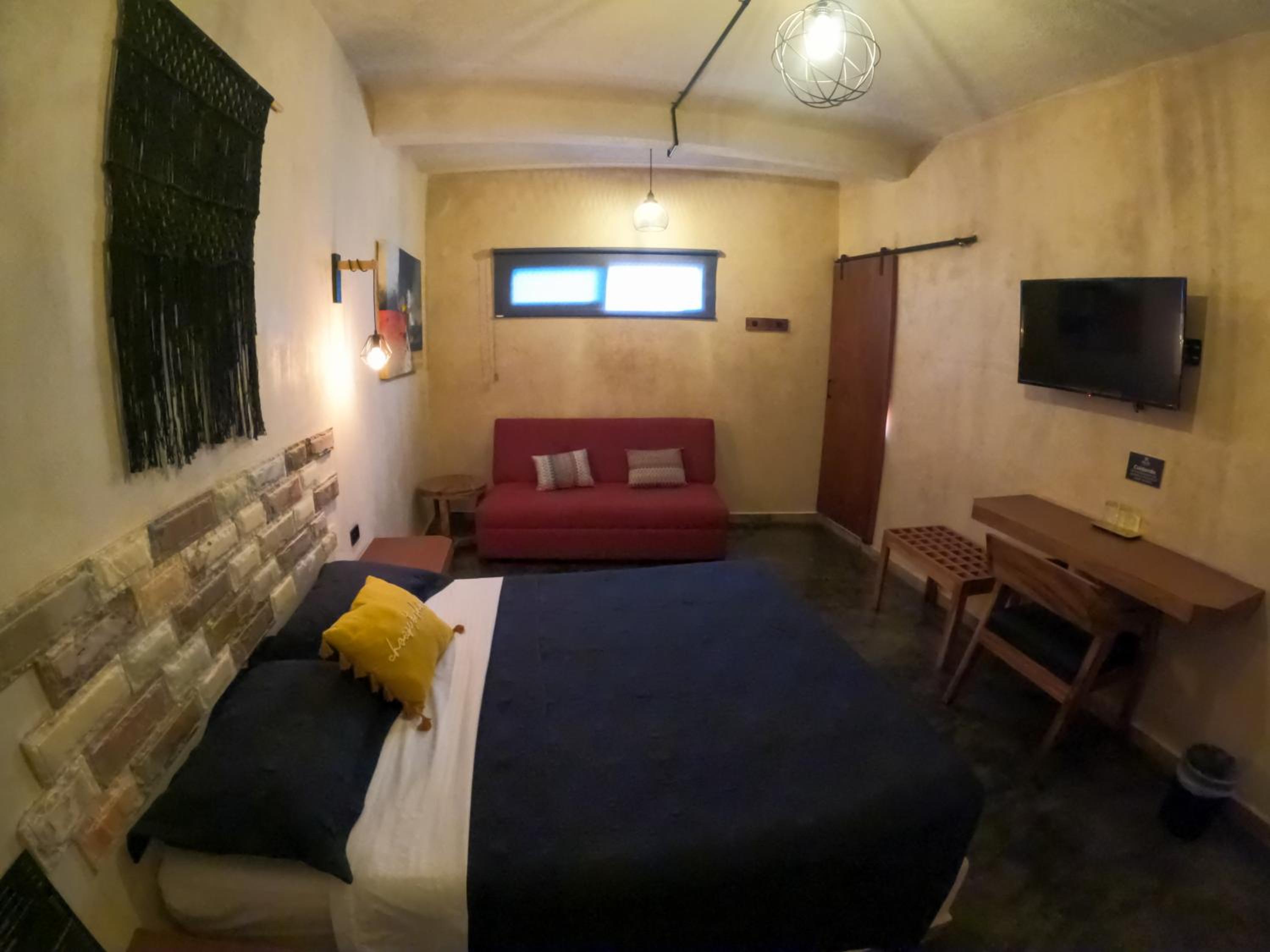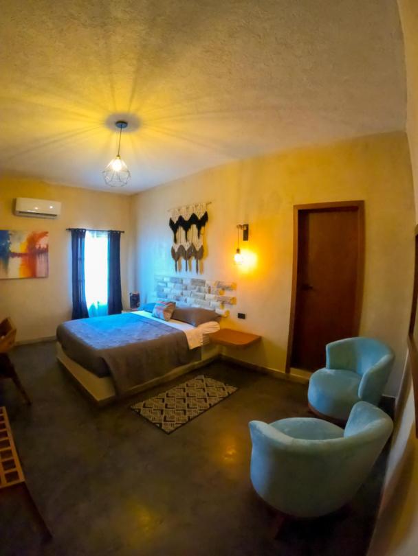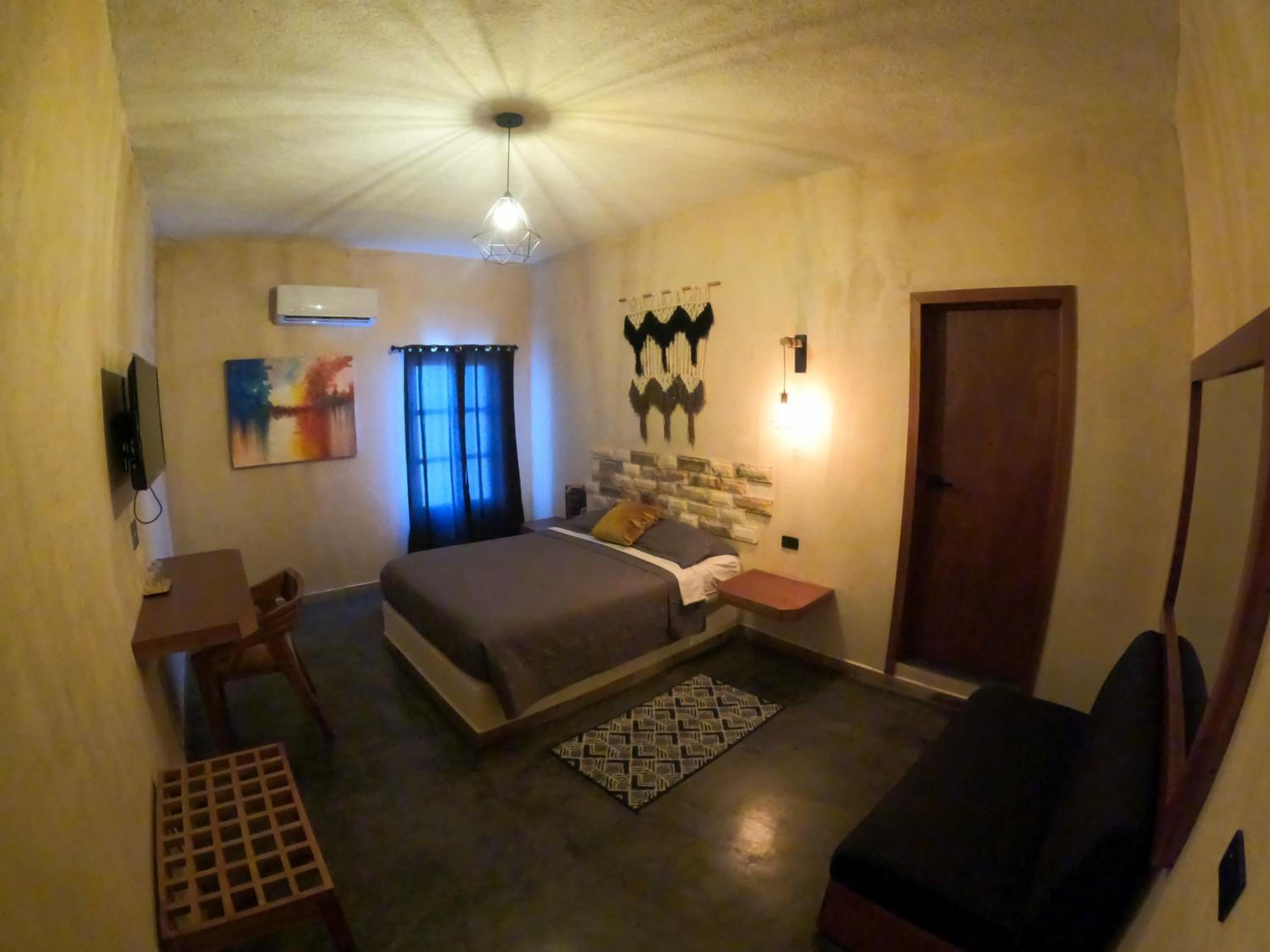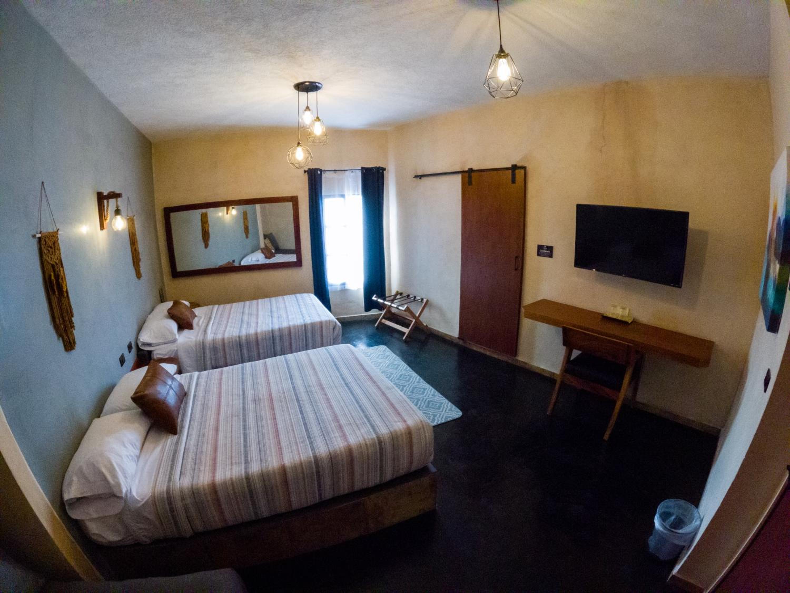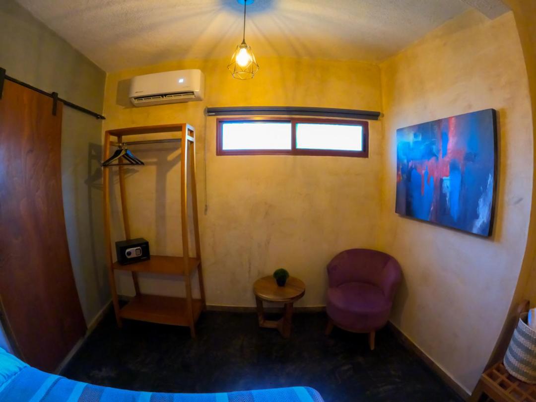 This room is great for an overnight stay. Basically a bed and shower. No coffee machine, no mini fridge...small selection of cold drinks in cooler downstairs and OXXO a block away. We both had showers, one in the evening and one in the morning. There was hot water for maybe a minute, then it went to cool, then only slightly warm. The neighbourhood was noisy (for us). We kept our windows closed...typical for the country.