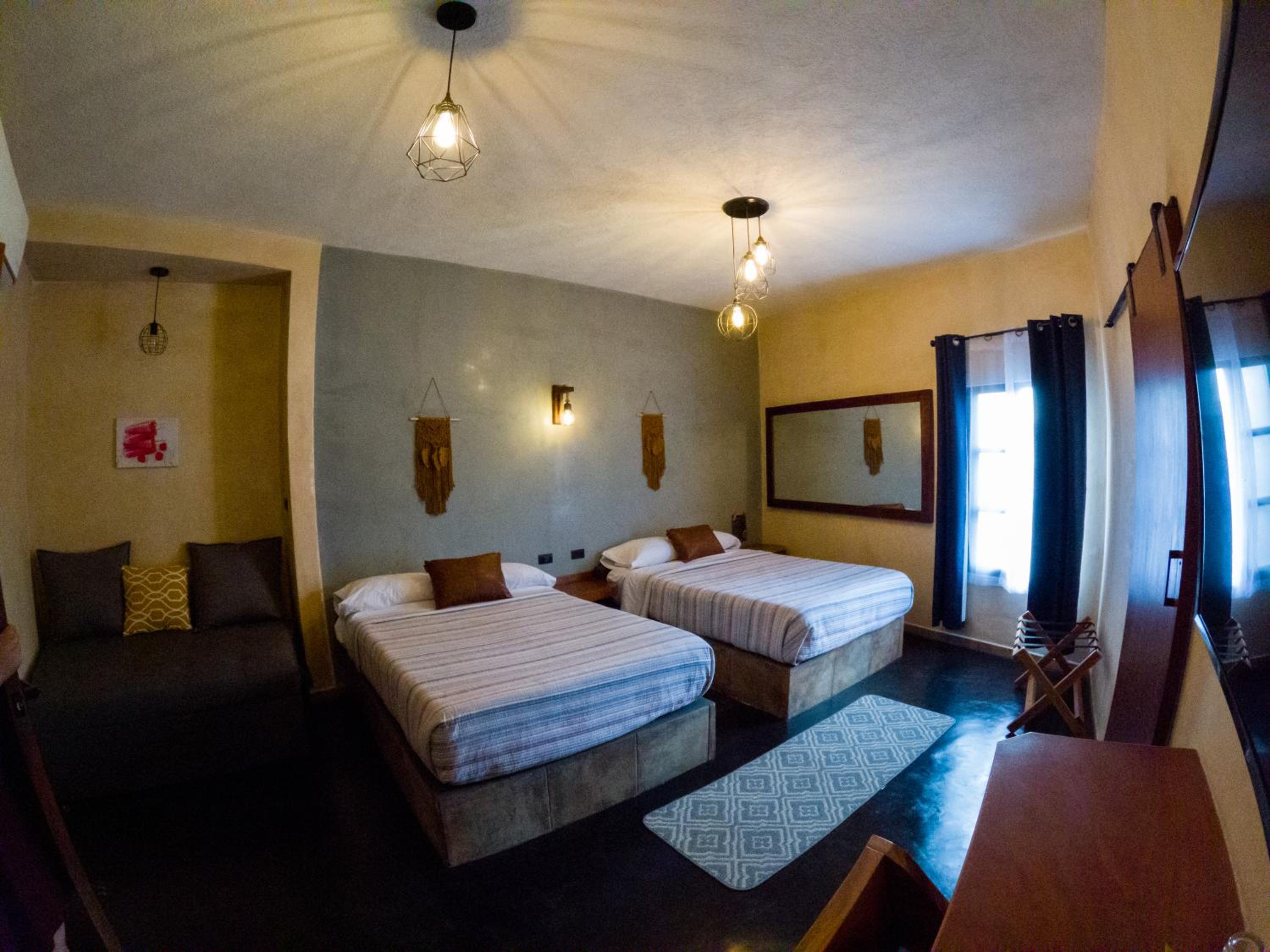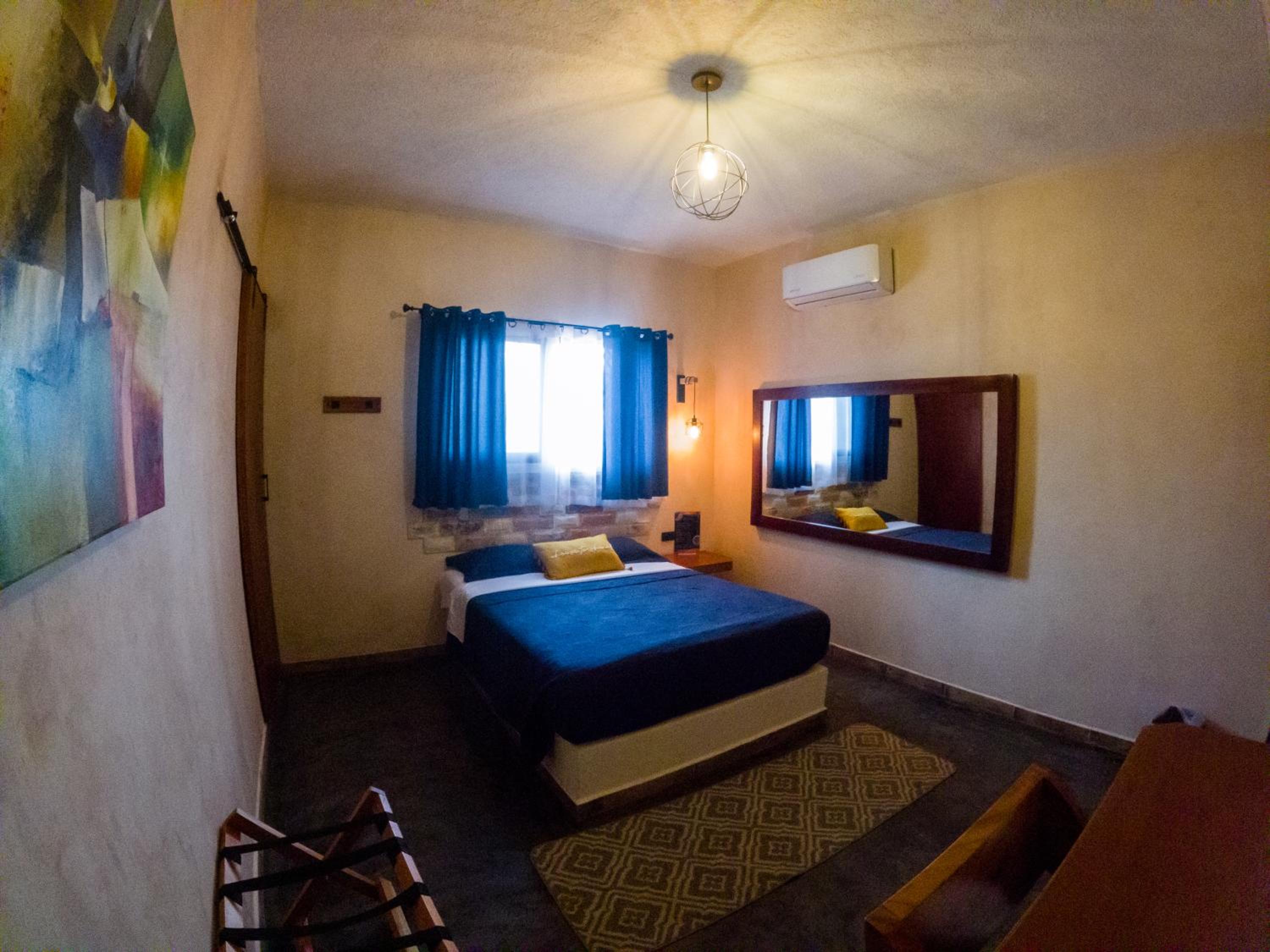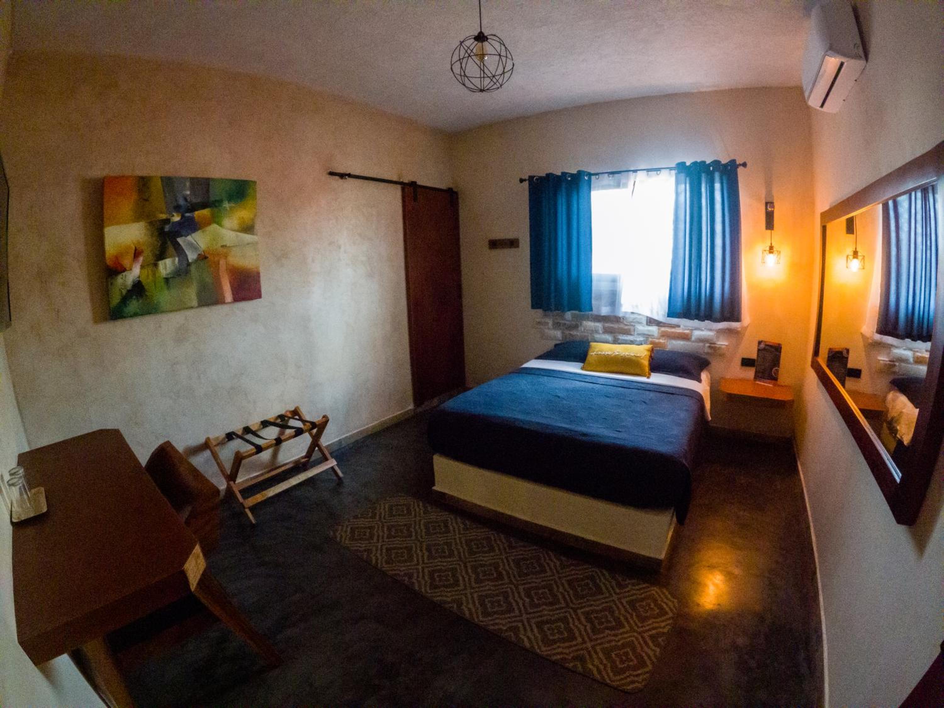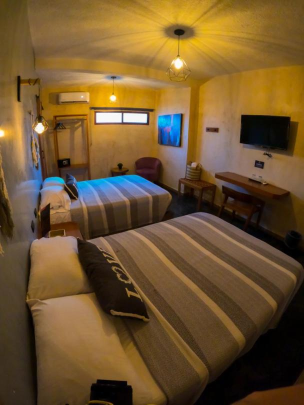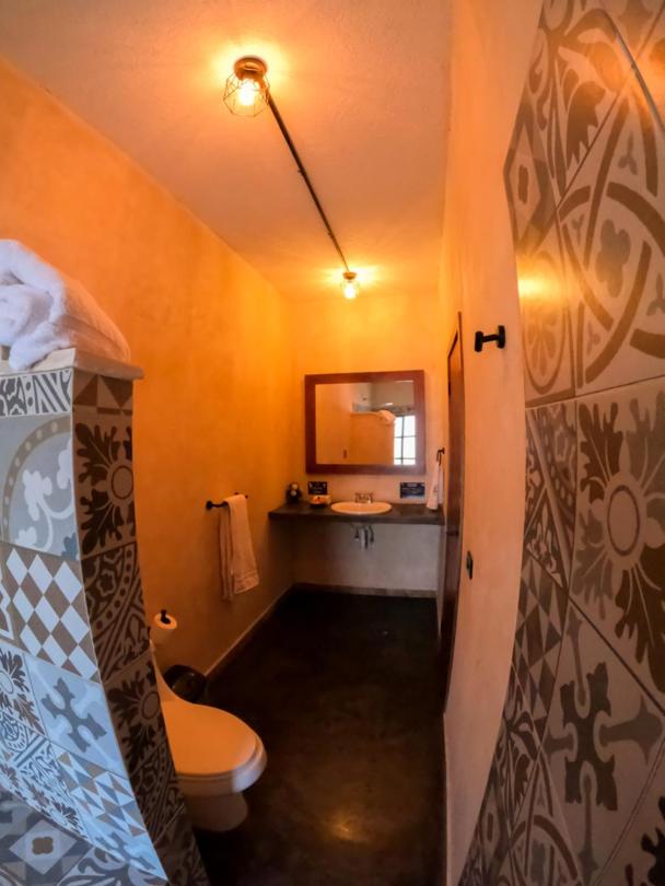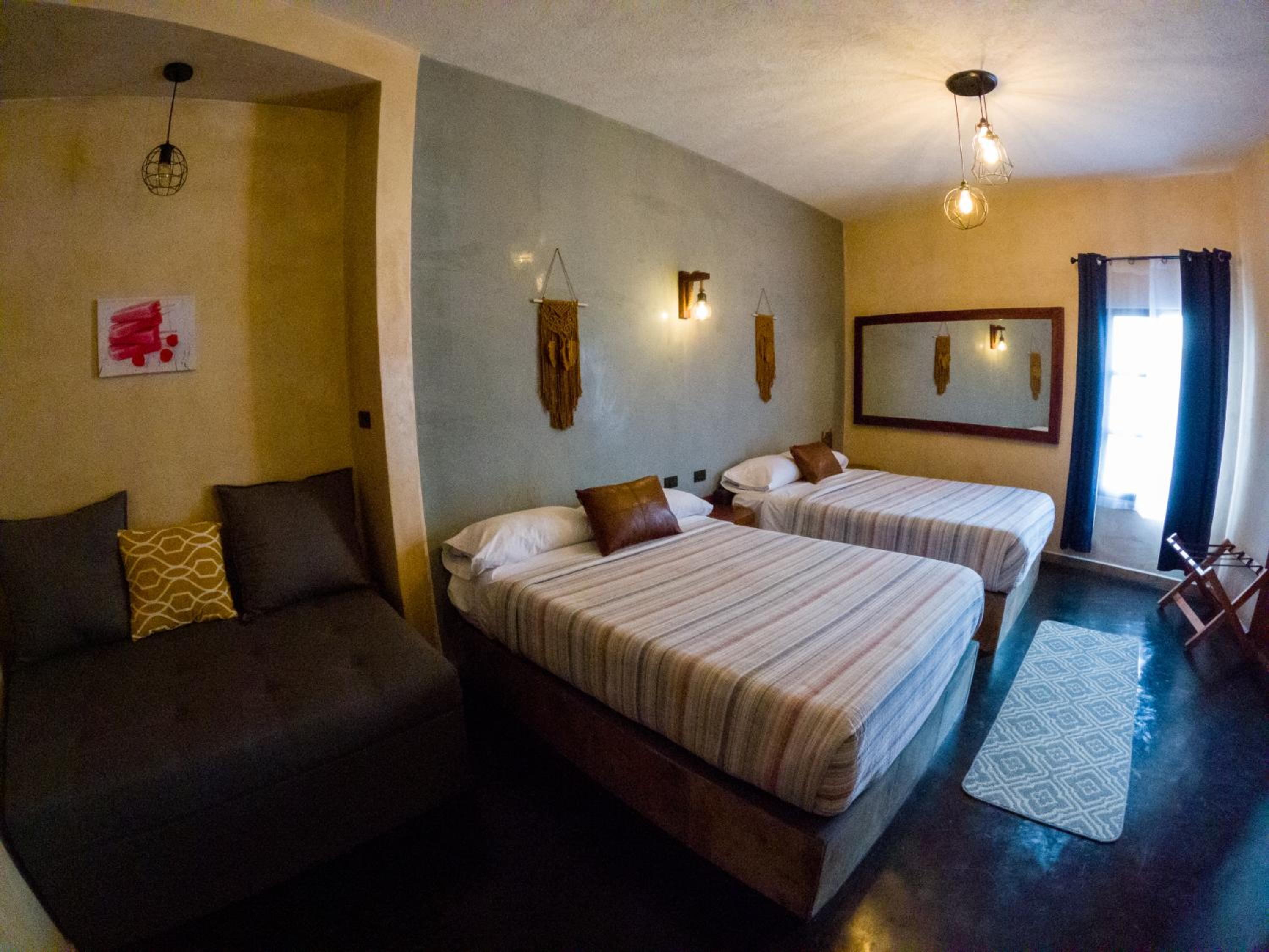 This room is great for an overnight stay. Basically a bed and shower. No coffee machine, no mini fridge...small selection of cold drinks in cooler downstairs and OXXO a block away. We both had showers, one in the evening and one in the morning. There was hot water for maybe a minute, then it went to cool, then only slightly warm. The neighbourhood was noisy (for us). We kept our windows closed...typical for the country.