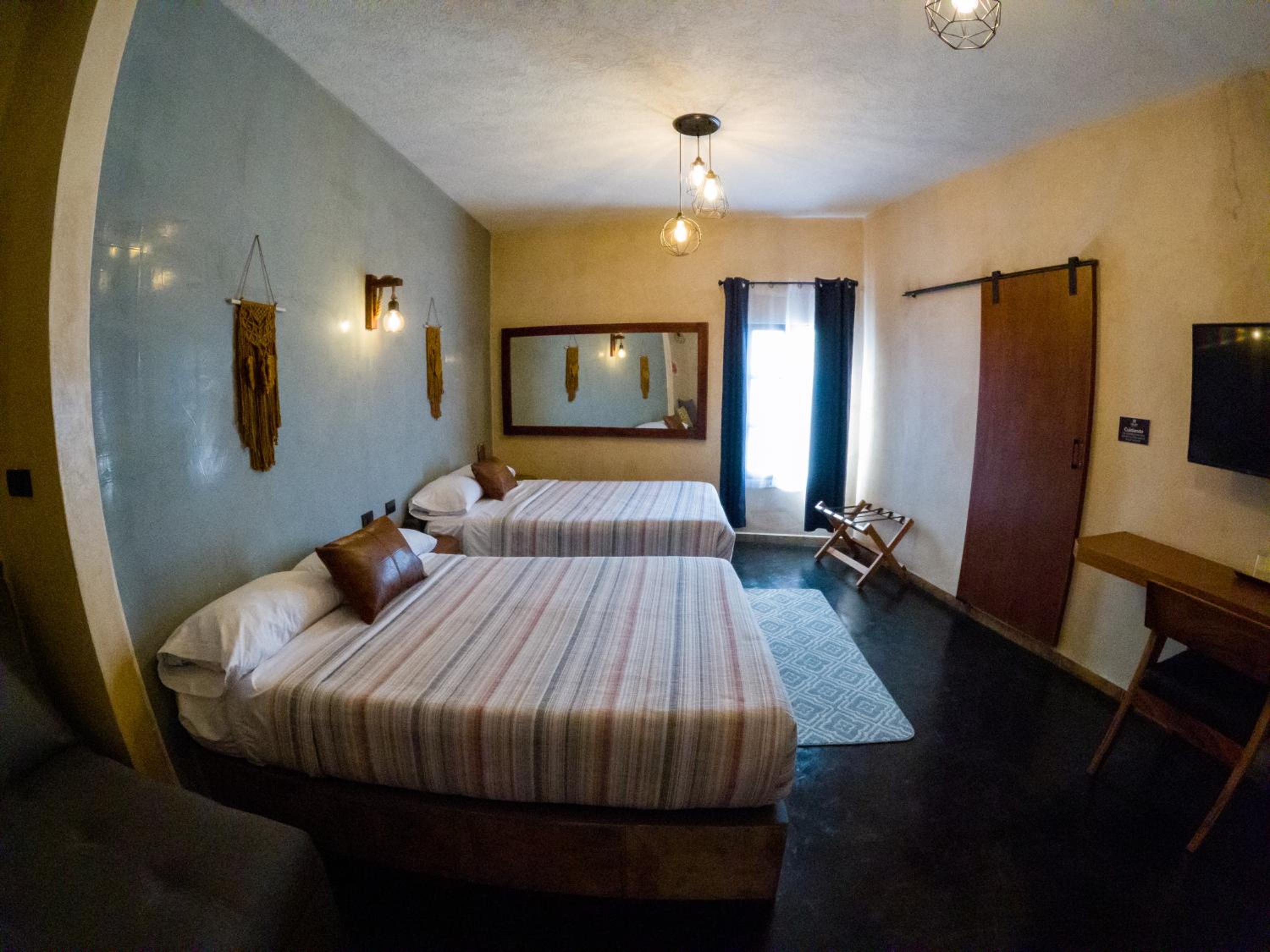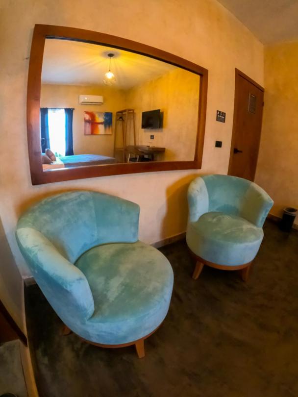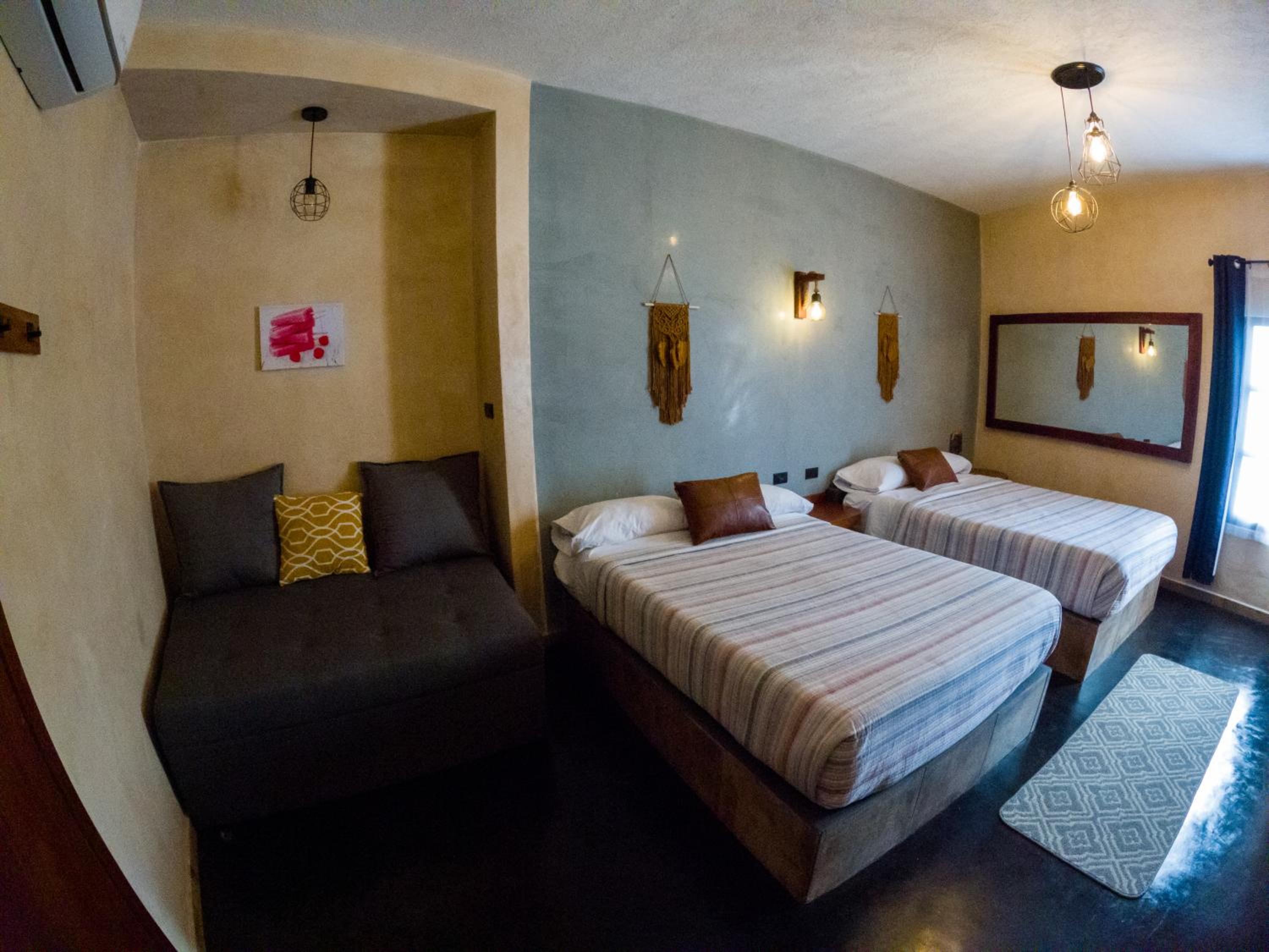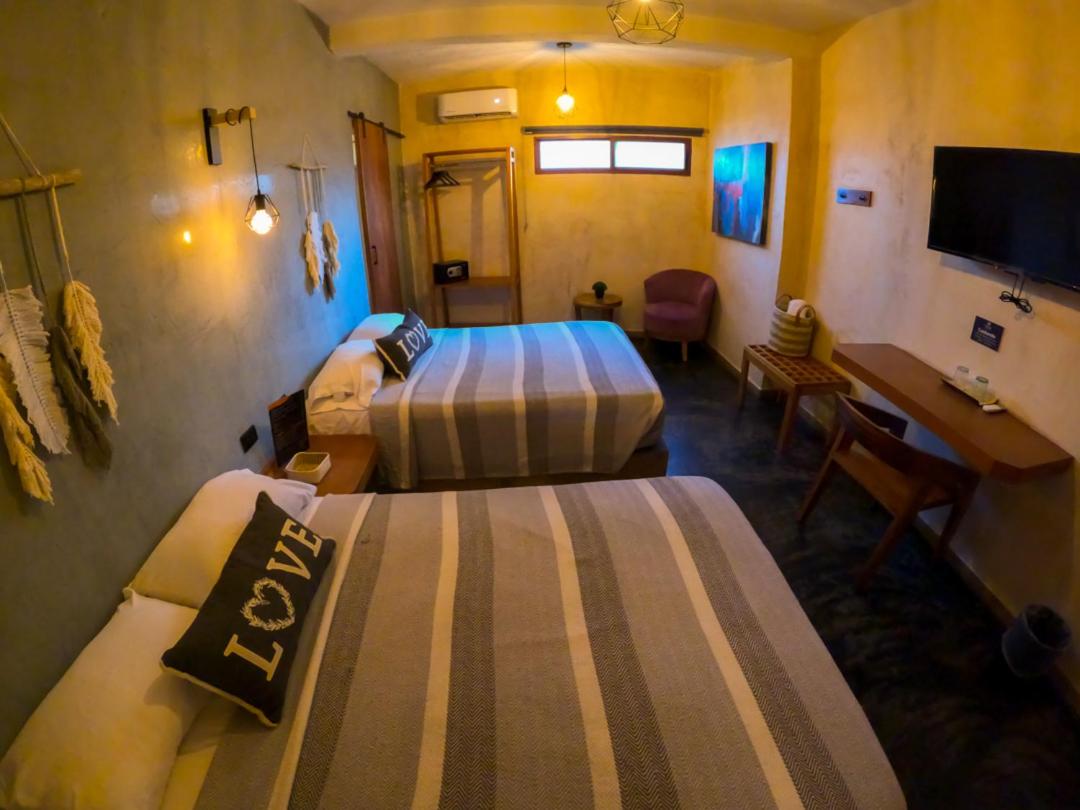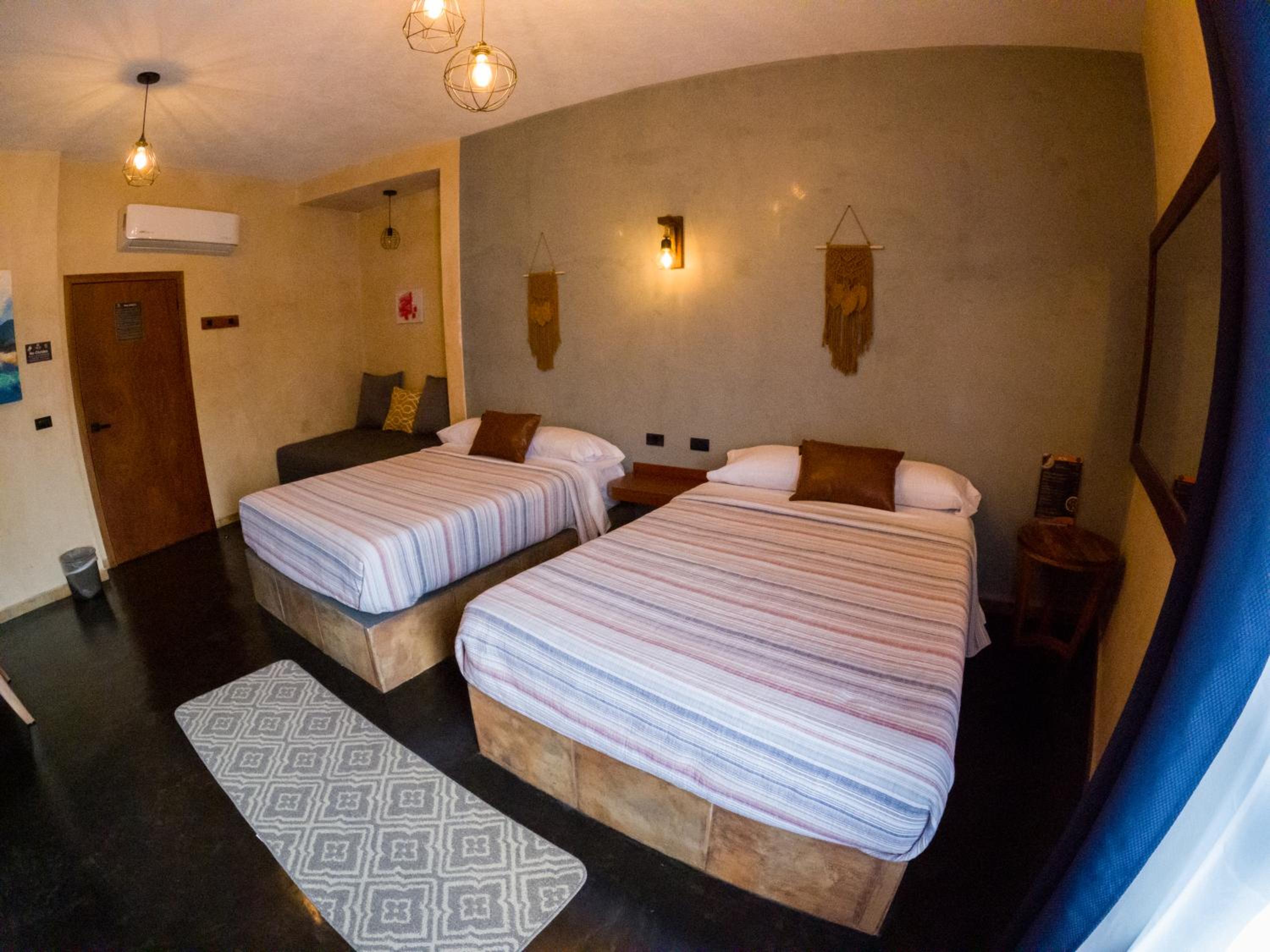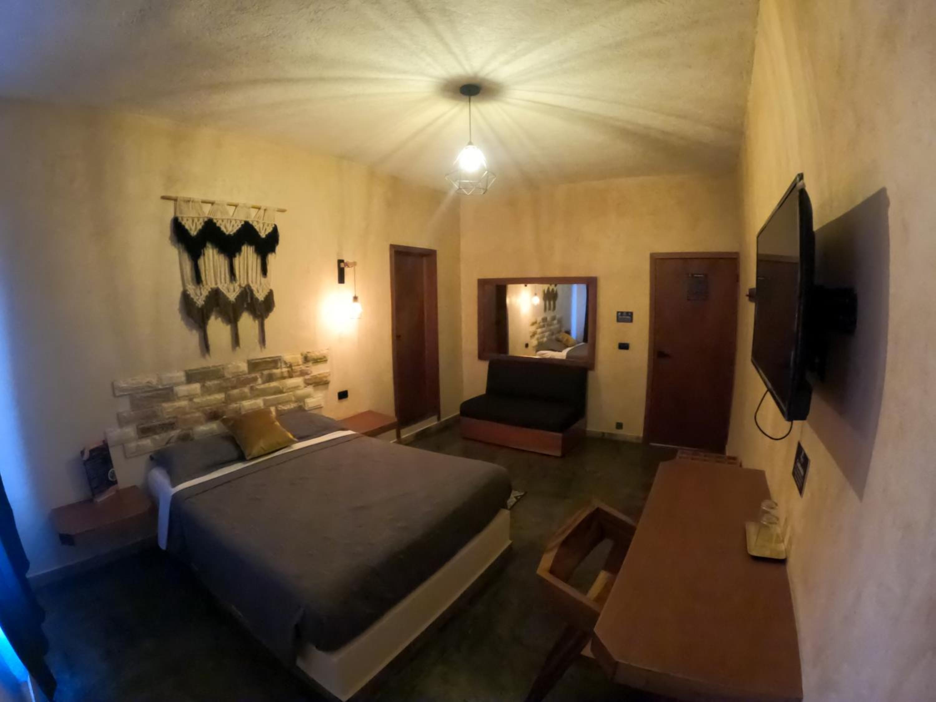 This room is great for an overnight stay. Basically a bed and shower. No coffee machine, no mini fridge...small selection of cold drinks in cooler downstairs and OXXO a block away. We both had showers, one in the evening and one in the morning. There was hot water for maybe a minute, then it went to cool, then only slightly warm. The neighbourhood was noisy (for us). We kept our windows closed...typical for the country.