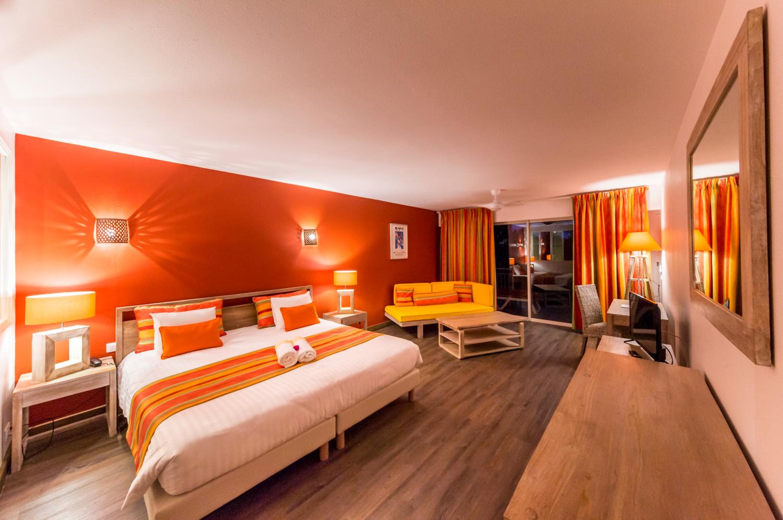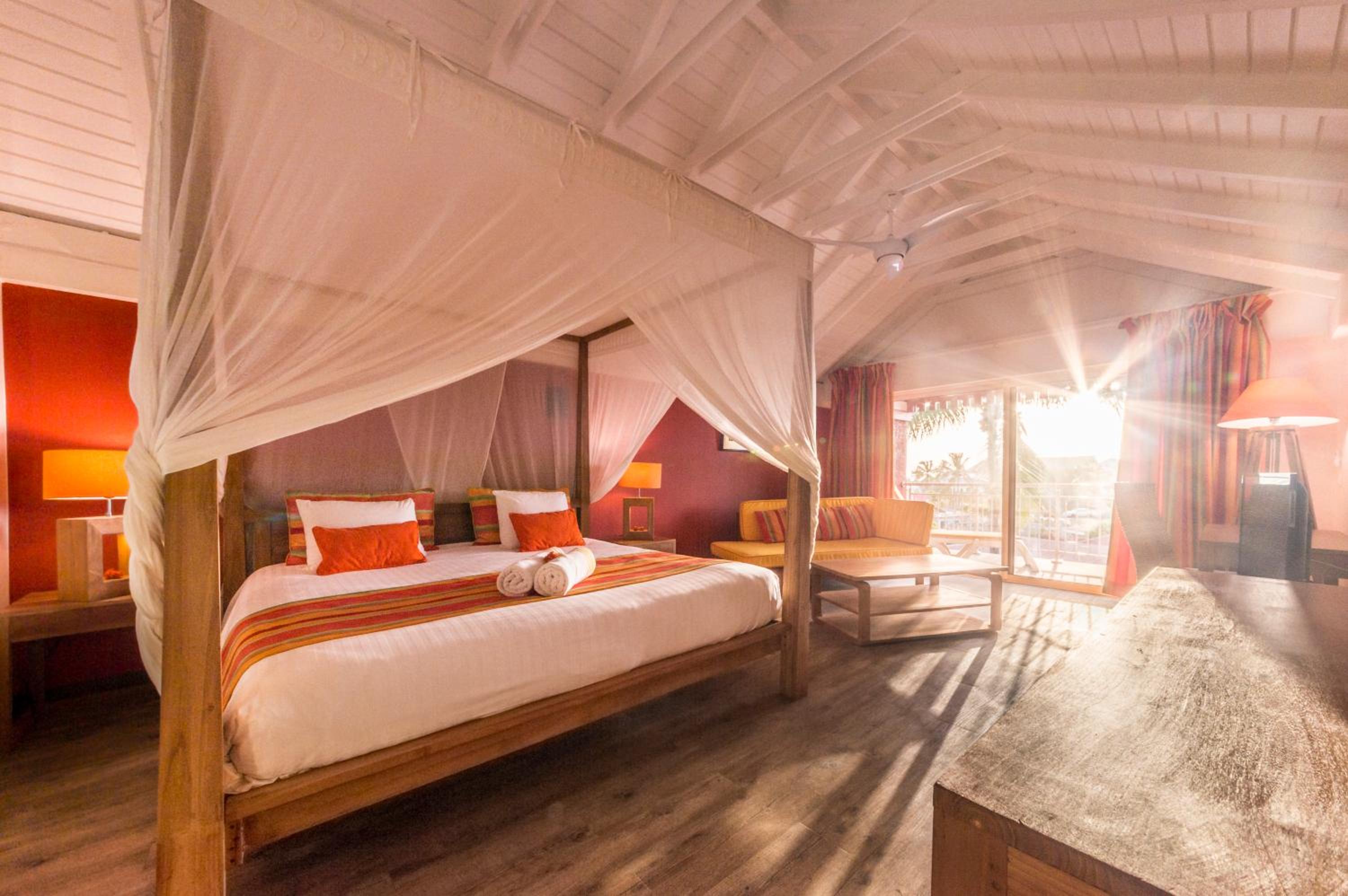 PALM COURT RESIDENCE 4 Stars in Orient Bay French St Martin offers elegant rooms with modern amenities, including cable TV, air conditioning, and private terraces. Enjoy stunning views of the pool and garden from your room.