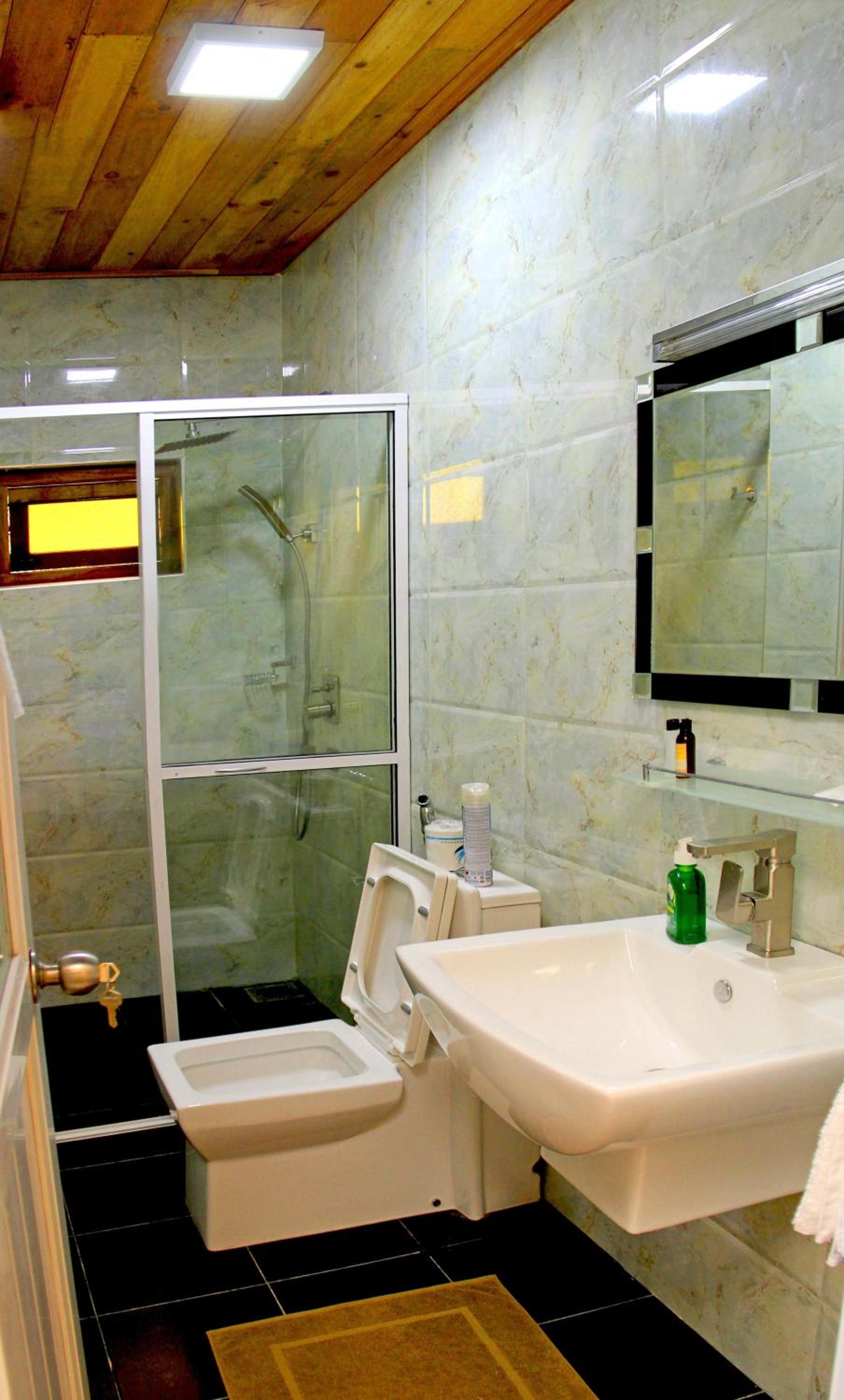 La chambre laissée passer l’eau lors d’une grosse averse par la porte d’entrée et également par le plafond de la salle de bain