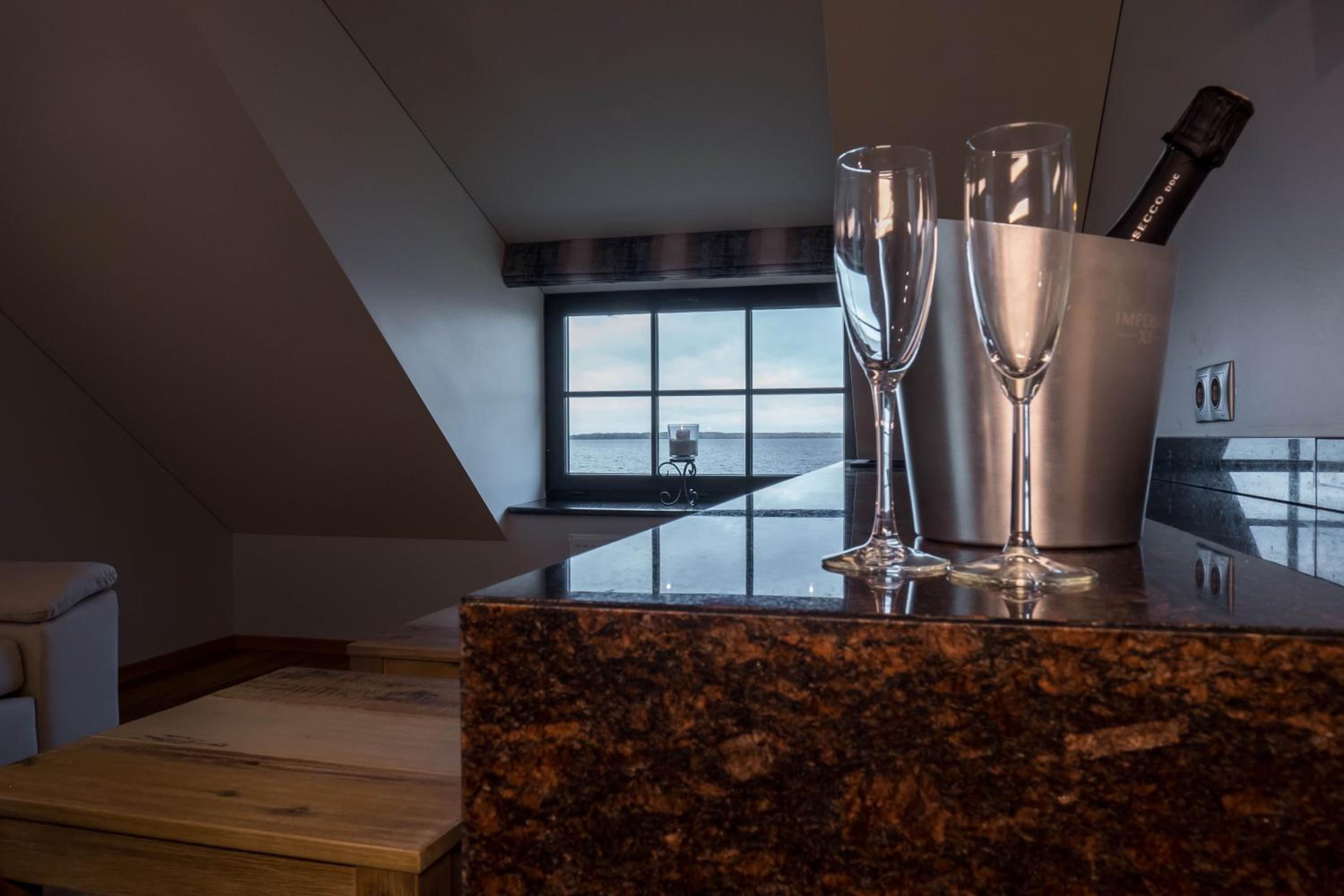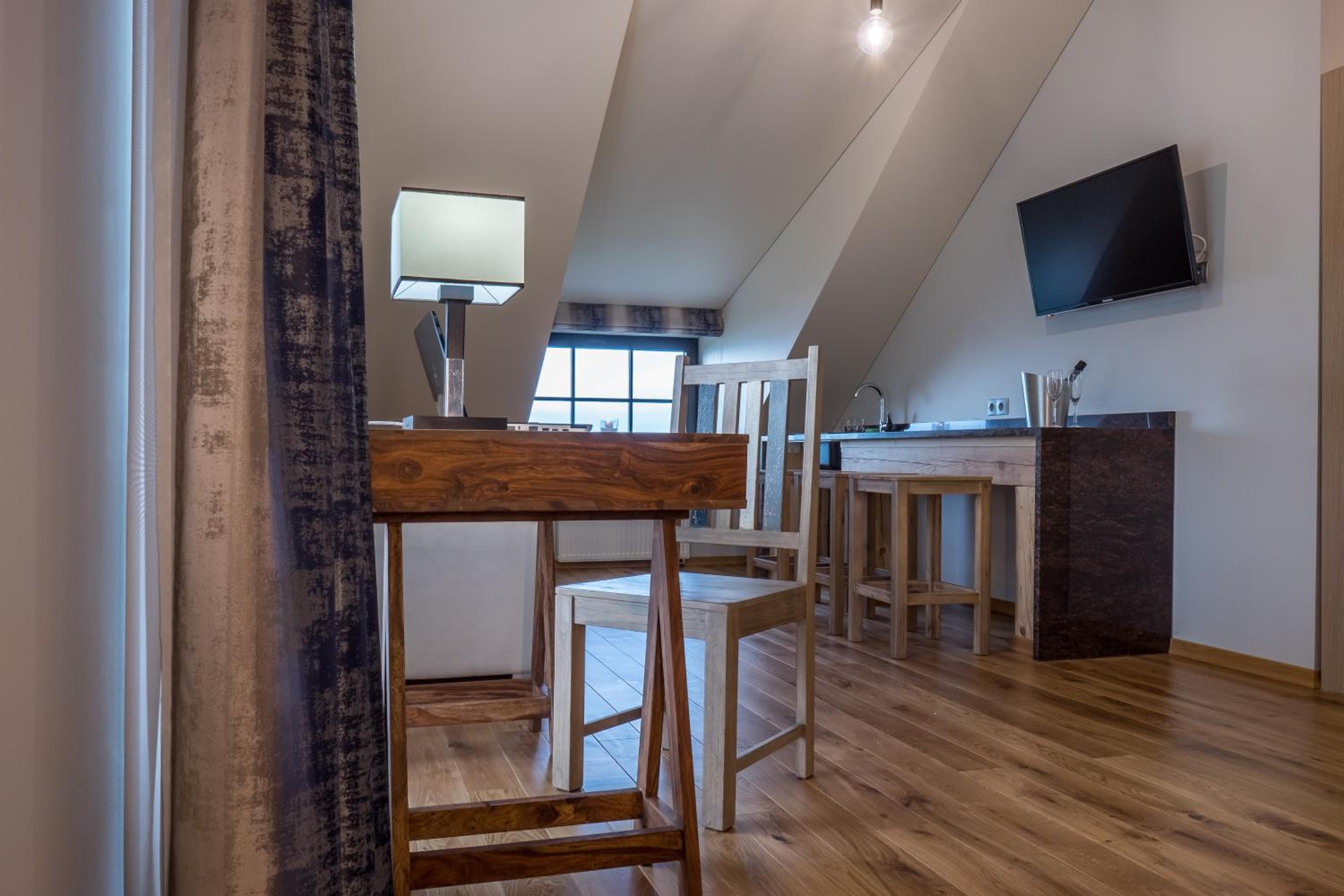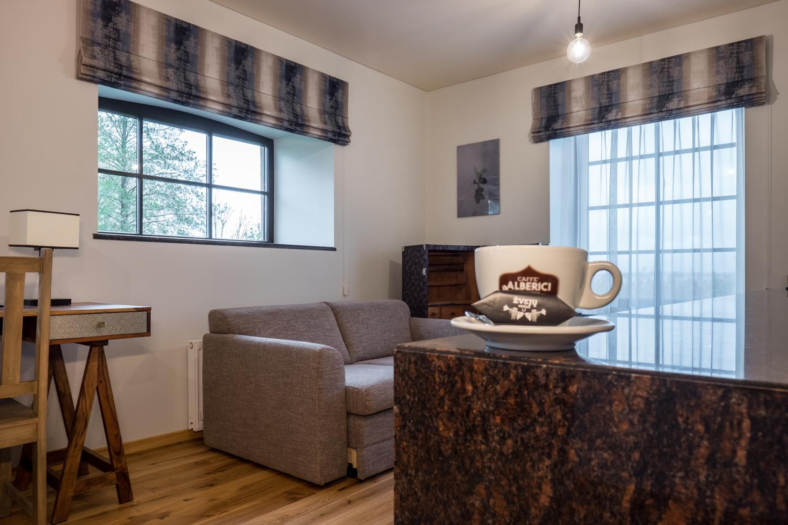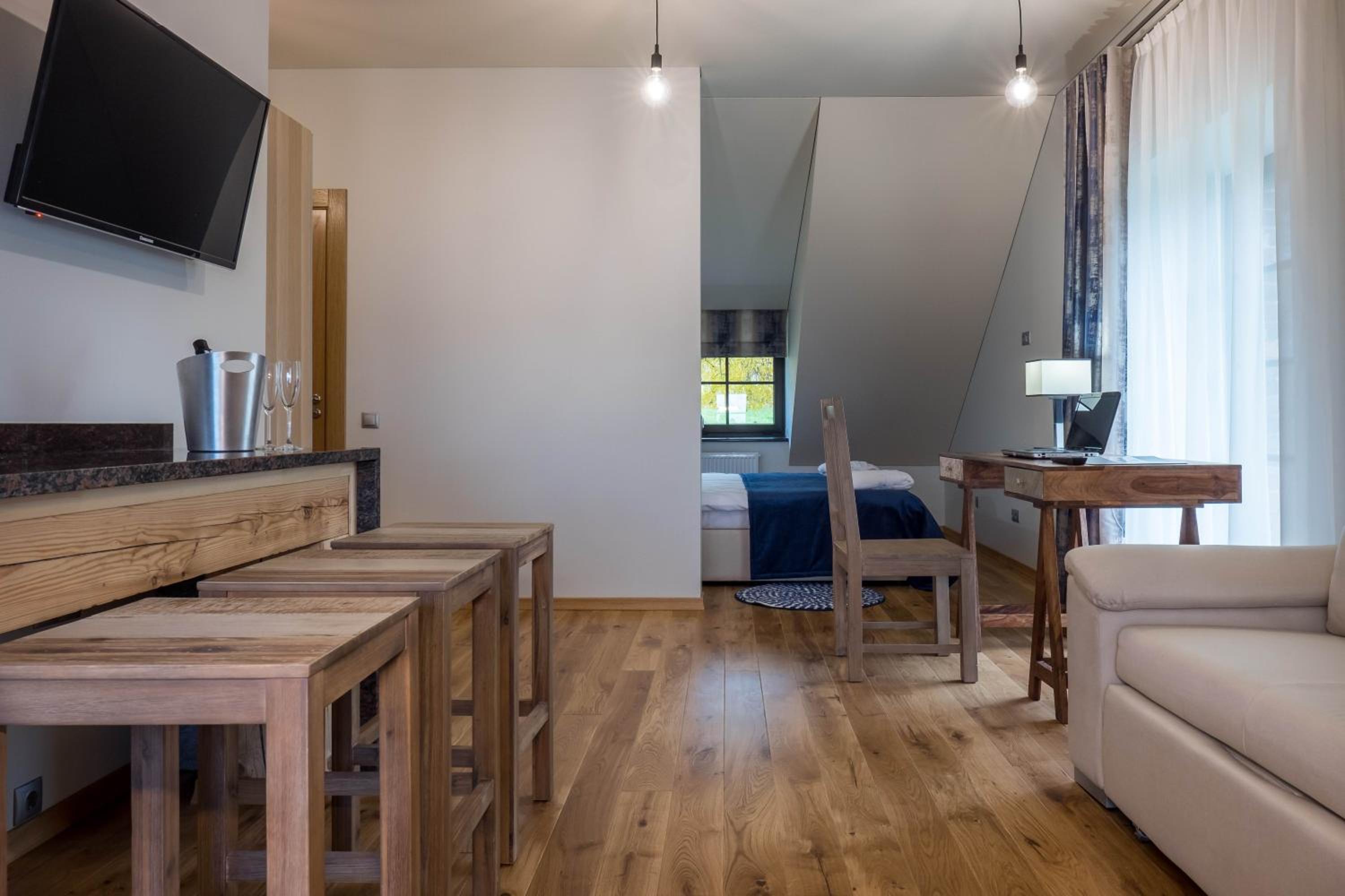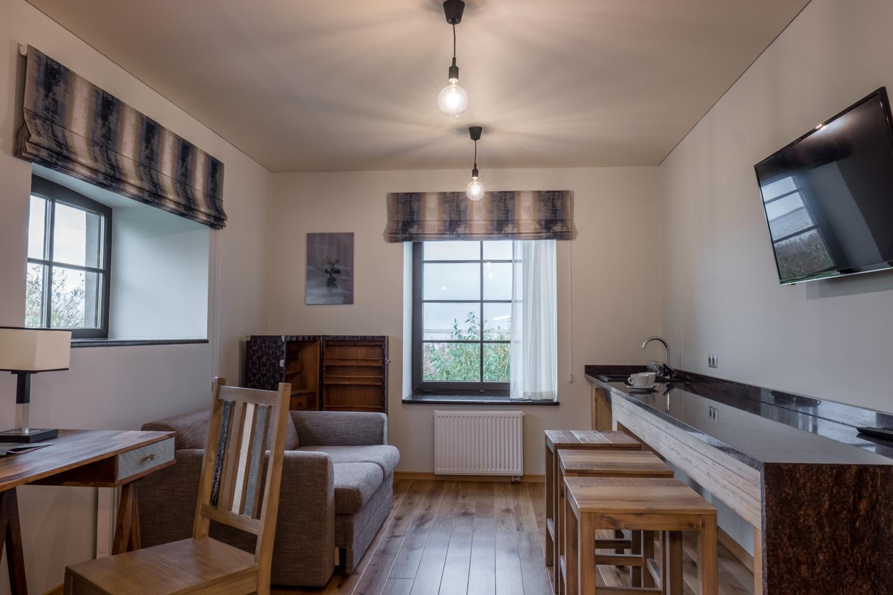 Luxurious Rooms and Amenities: Žvejų užeiga offers well-appointed rooms with modern amenities including flat-screen TVs, air conditioning, and comfortable seating areas. The private bathrooms are stocked with complimentary toiletries for a relaxing stay.
