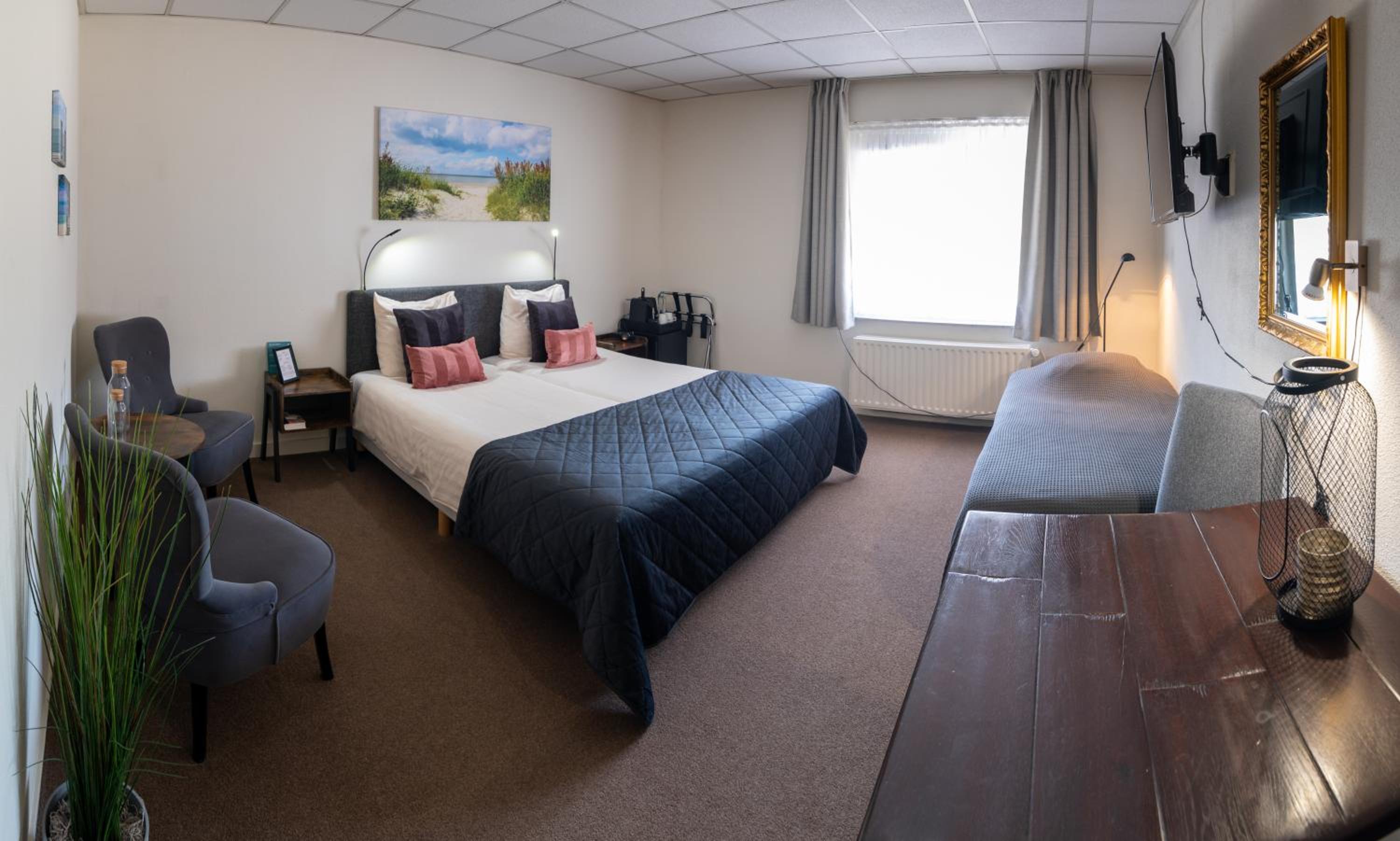 De kamers zijn zeer oudbollig en voorzien van tapijt. Wij hadden een extra grote kamer met koffiezetapparaat met 2 koffiecups wat wij erg schaars vonden. De volgende dag werden we nauwelijks te woord gestaan. De kamers zijn zeer oudbollig. In de badkamer hangt 1 automaat met iets om je mee te wassen. Ik vermoed dat deze zeep zowel voor lichaam als haar is.. Heel sober. Gebakken eieren behoorde niet tot de mogelijk.. "Dat doen we de ene dag wel en de andere dag niet, en vandaag doen we dat niet, zo werd mij verteld". Met tegenzin werden er nog wel een post extra schaaltjes yoghurt gemaakt. Geen aanrader!