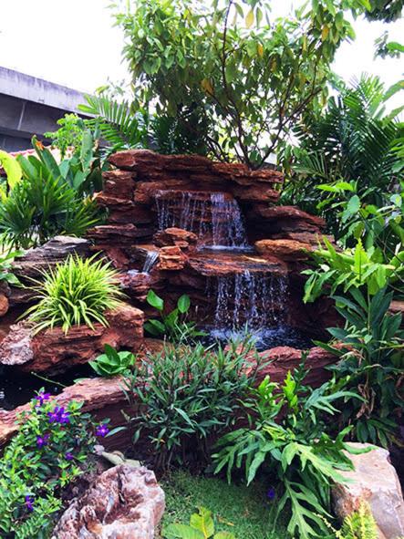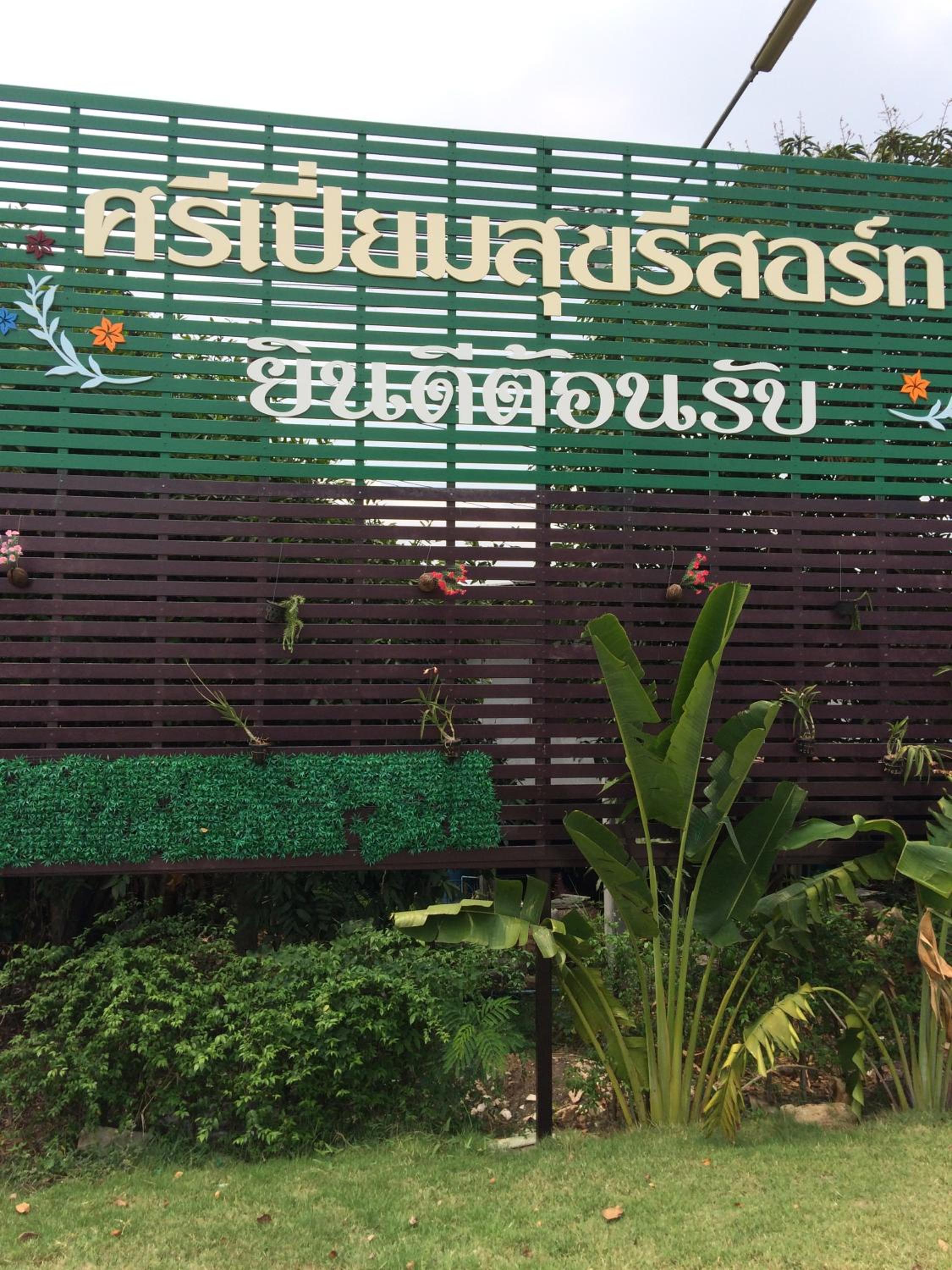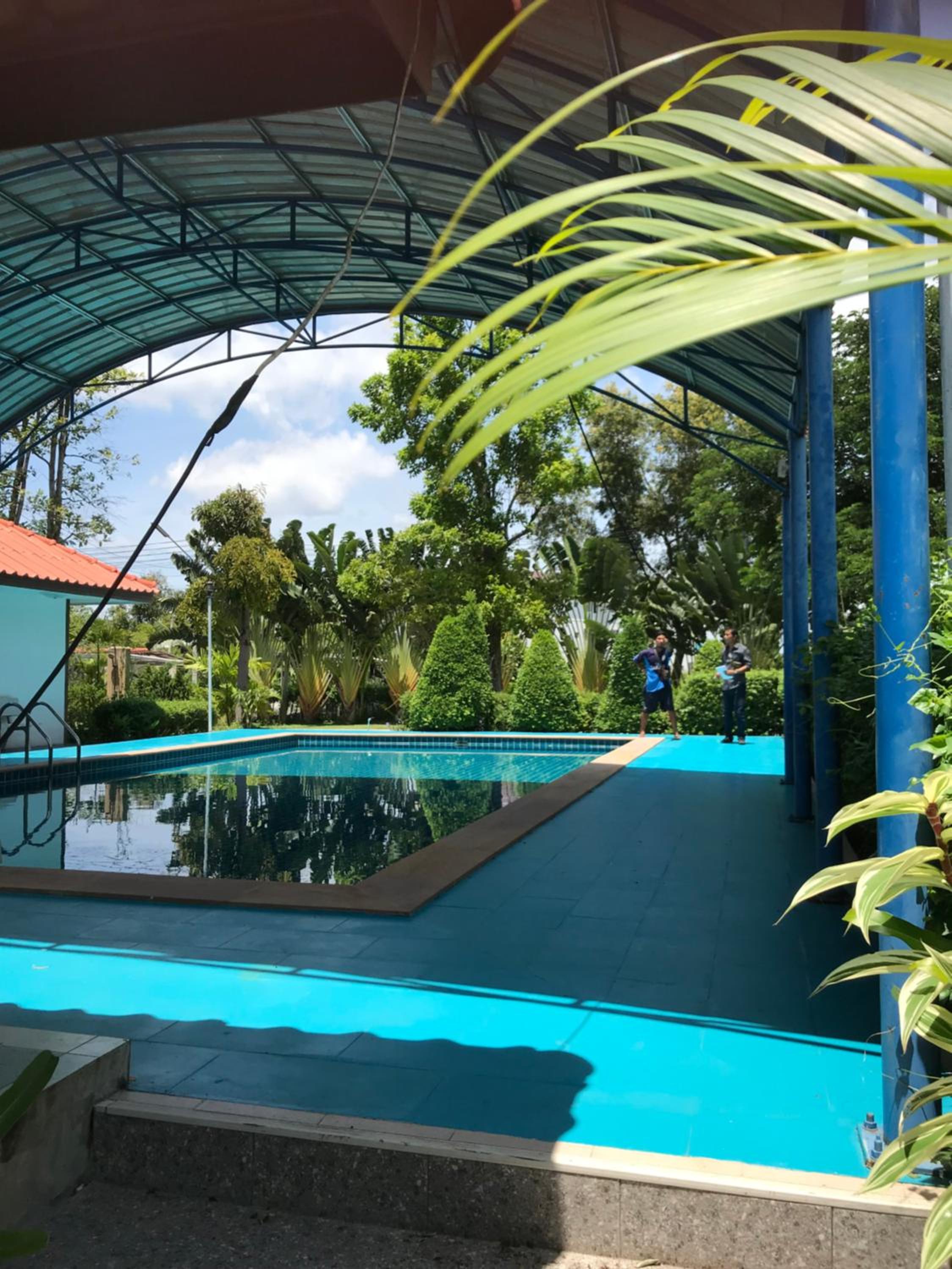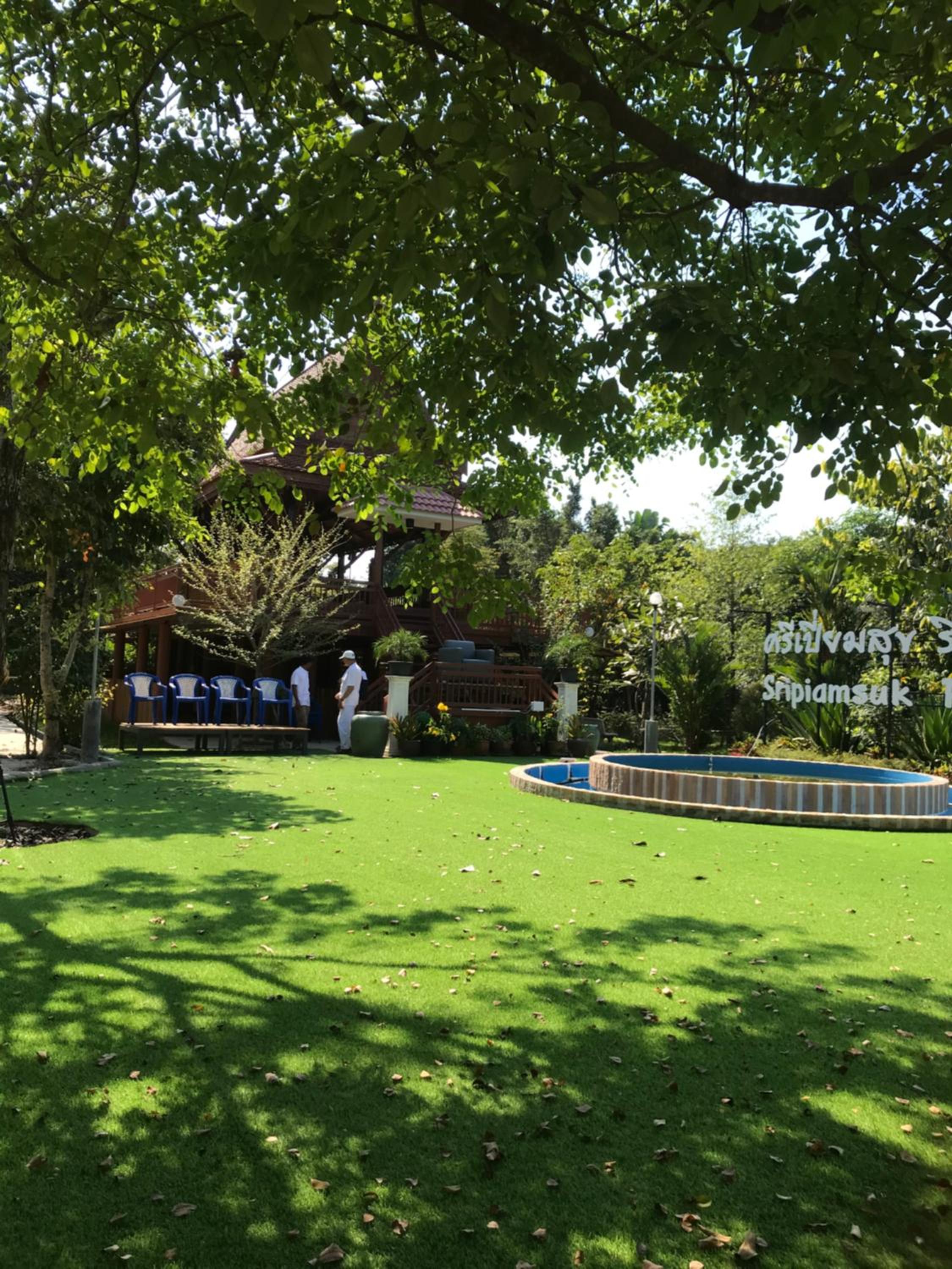 Sripiamsuk Resort Bangkok features an inviting outdoor swimming pool surrounded by a lush garden, providing a perfect spot for relaxation and leisure.