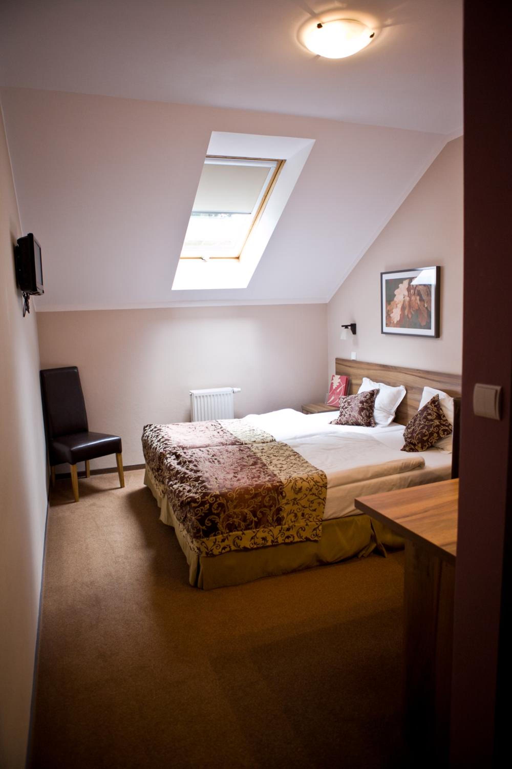 Pokoje na piętrze nie mają "widoku" - mają tylko okna dachowe. Pewnie i tak niewiele można by zobaczyć, bo teren otaczają gęste drzewa (dęby?). W pokojach nie ma również lodówek, ale jako, że to była zima, to siatka za oknem, czyli "studenckie" czasy się przypomniały ;-)