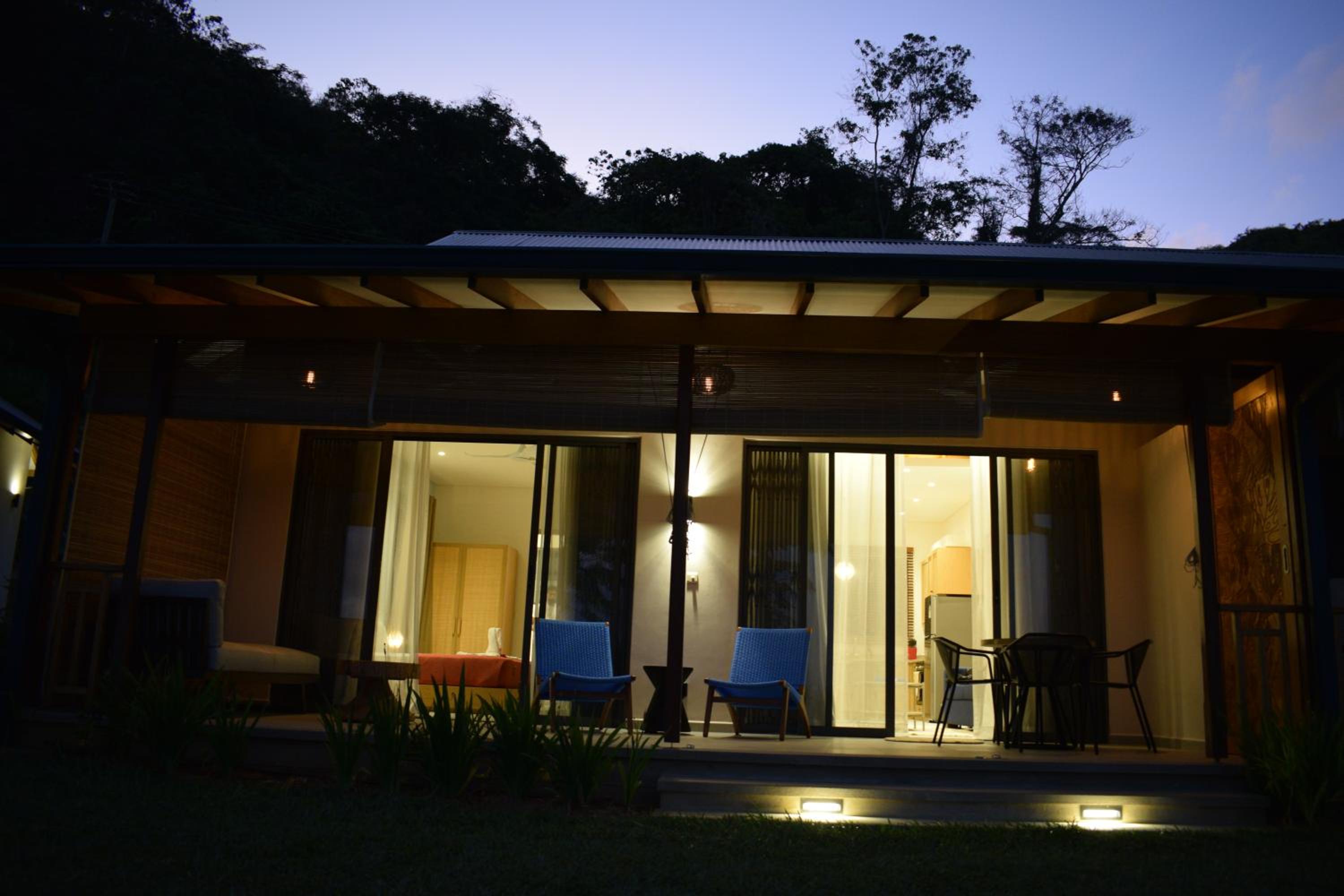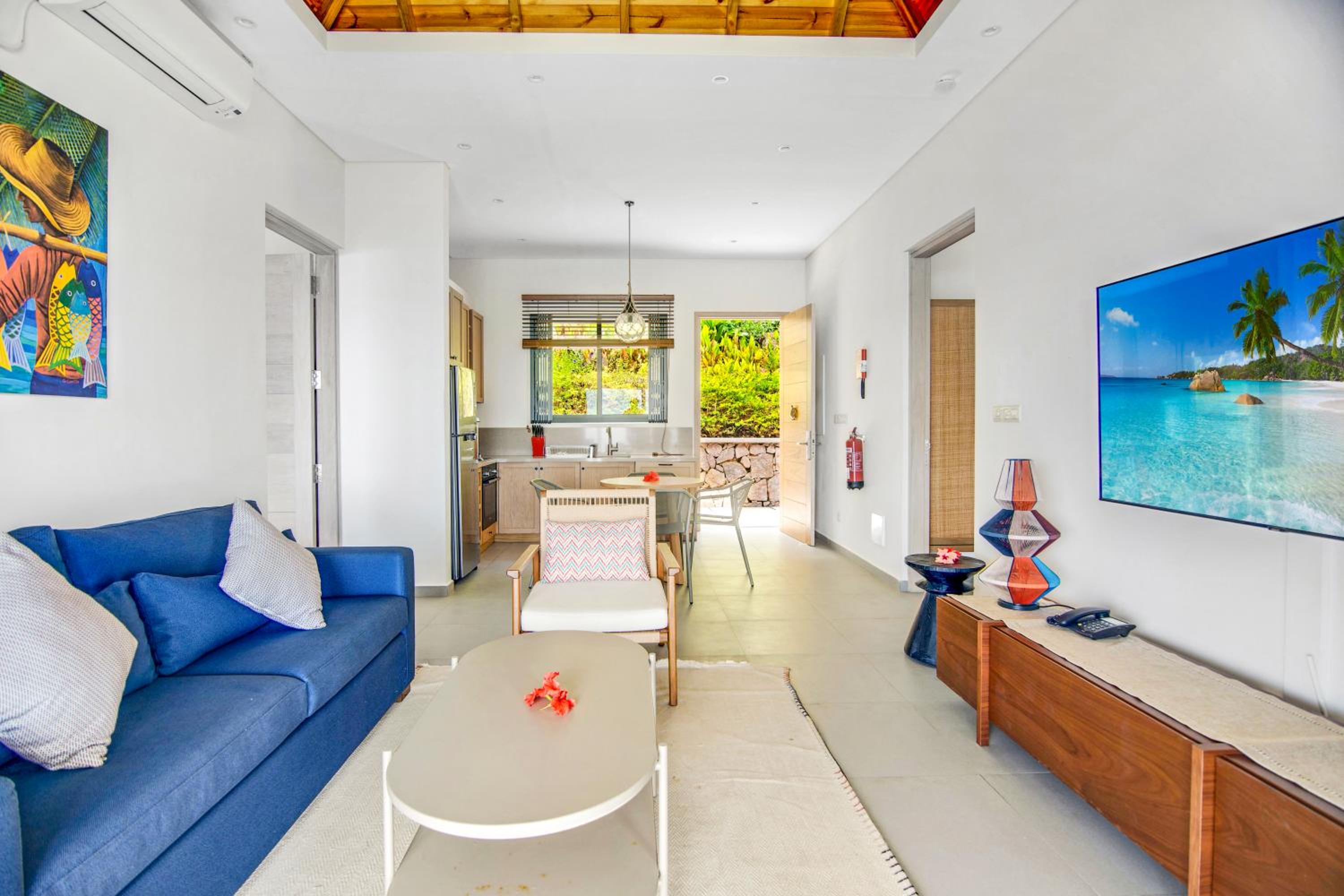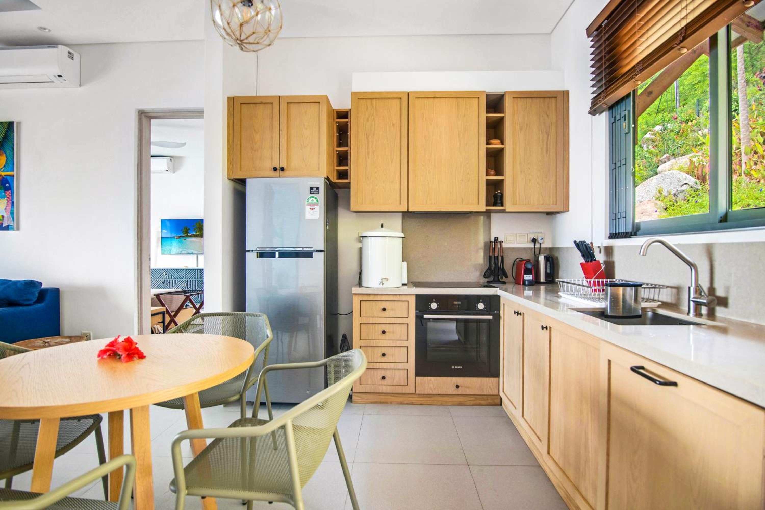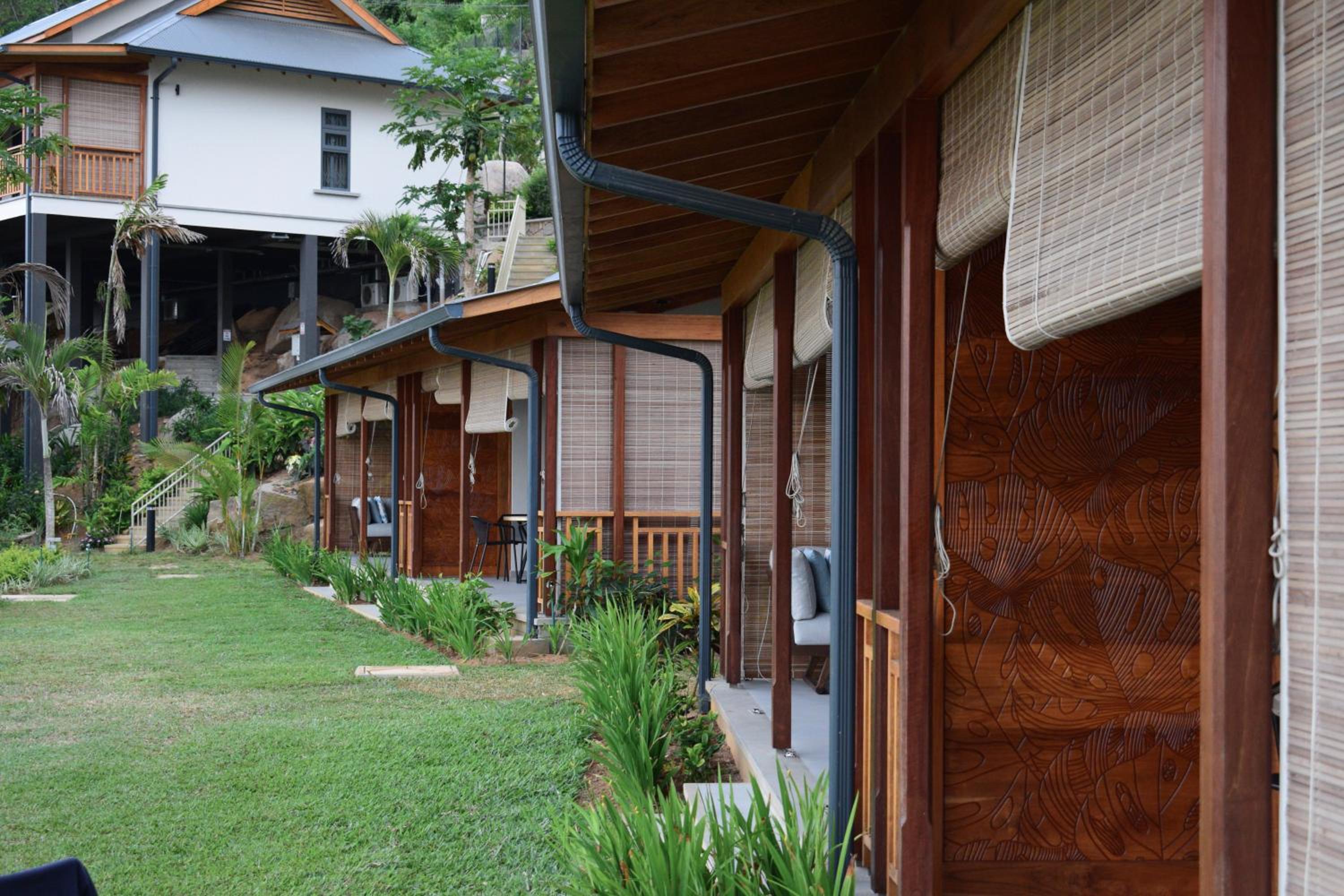 Paradise Chalets Yoga & Wellness in Takamaka offers air-conditioned rooms with modern amenities like a coffee machine, fridge, and flat-screen TV. Some units even boast pool views and balconies for a touch of luxury.