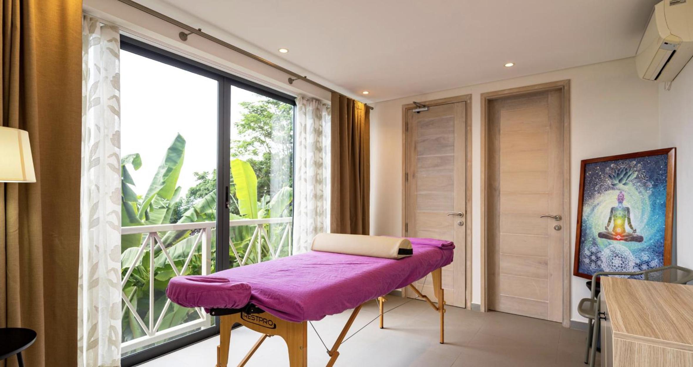 Great location in a quiet area of the island. The coast road goes along the front of the property but traffic noise is minimal, mostly drowned out by the sound of the surf on the beach that is just a few steps away across the road. There is also a restaurant right by the beach which was very popular. Very helpful and friendly staff. We liked the complimentary yoga, we were able to try several different 'styles' during our stay.