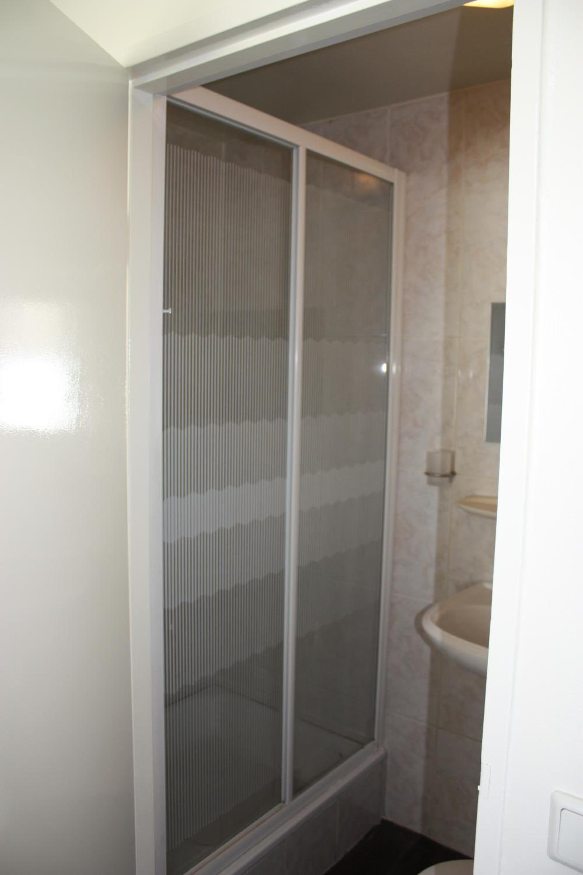 Er was een douchegordijn. Dat was zwart. Ziet er chique uit, maar het vuil (dat er mogelijk op zit) zie je dus niet.