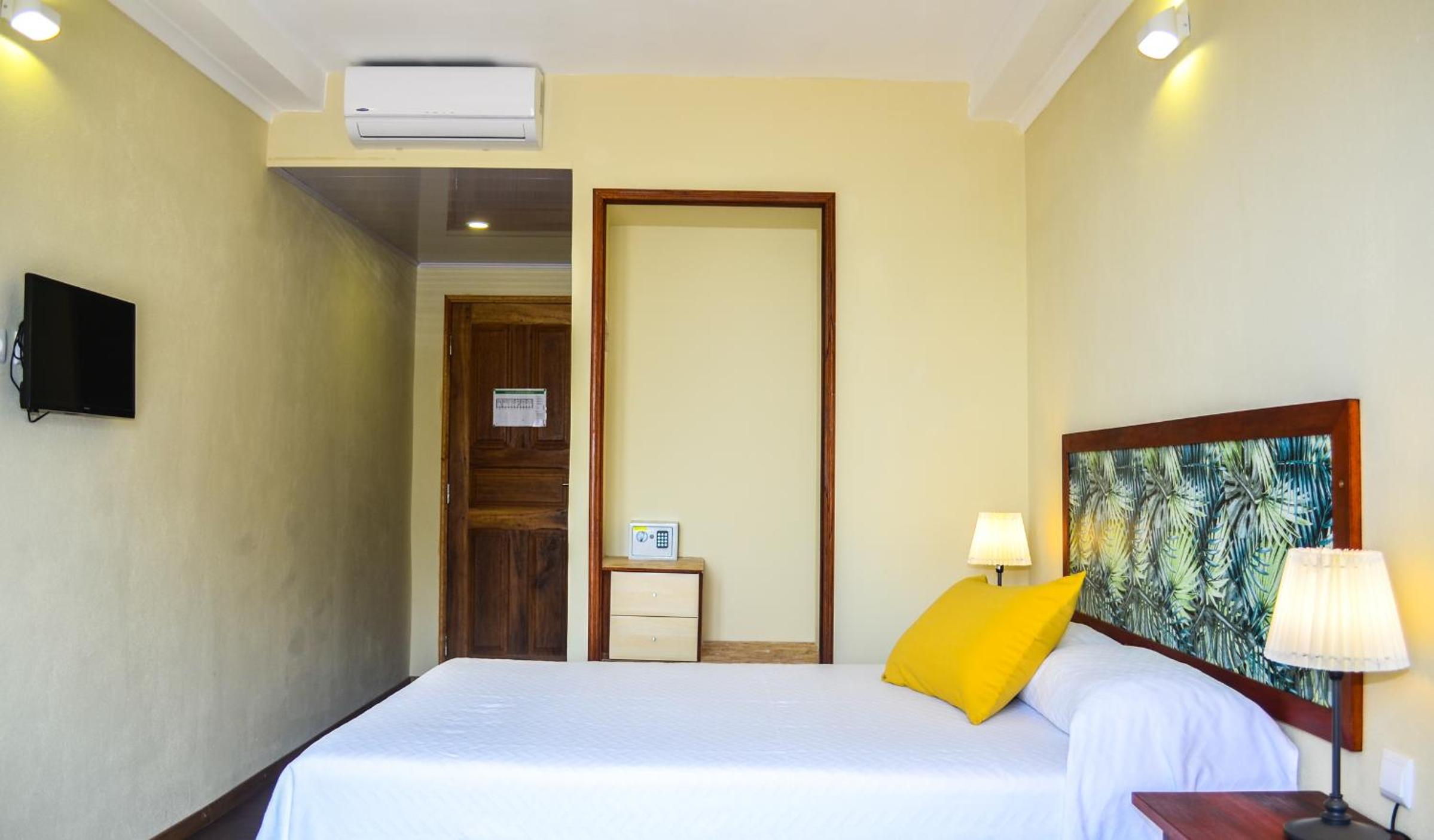 Enjoy spacious rooms with modern amenities including flat-screen TVs, private bathrooms, and air conditioning.