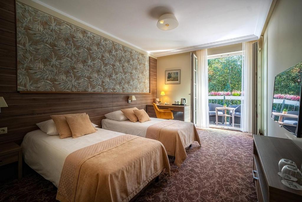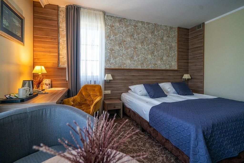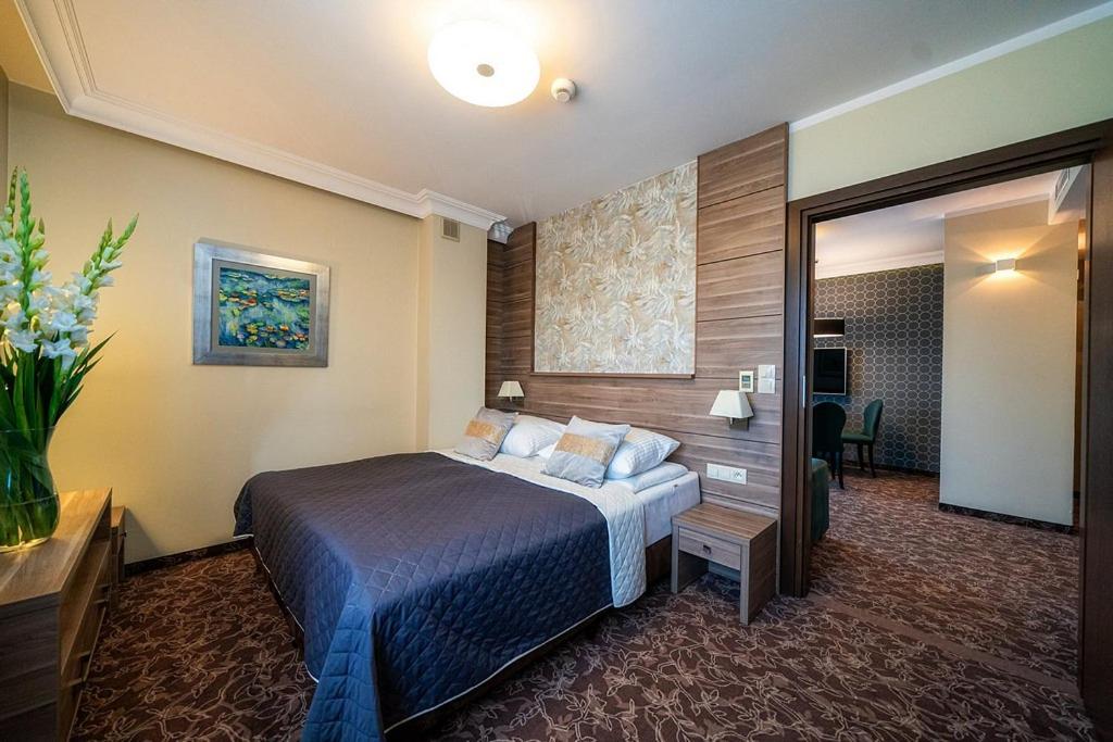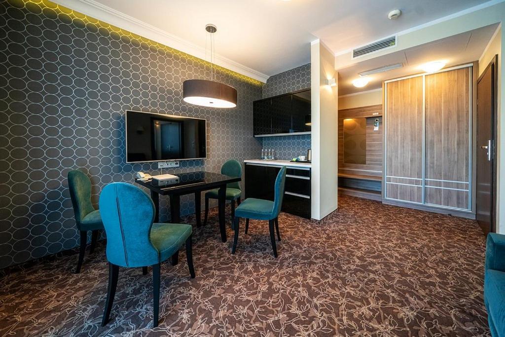 Discover the tranquil Korona Hotel nestled in a serene pine forest in Ostrołęka. The air-conditioned rooms boast flat-screen TVs and modern amenities, ensuring a comfortable stay. Unwind in the spa & wellness centre featuring a sauna and hot tub, or enjoy a meal at the on-site restaurant and bar.