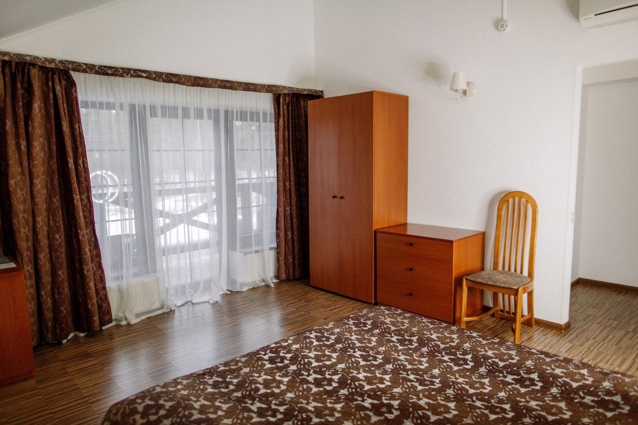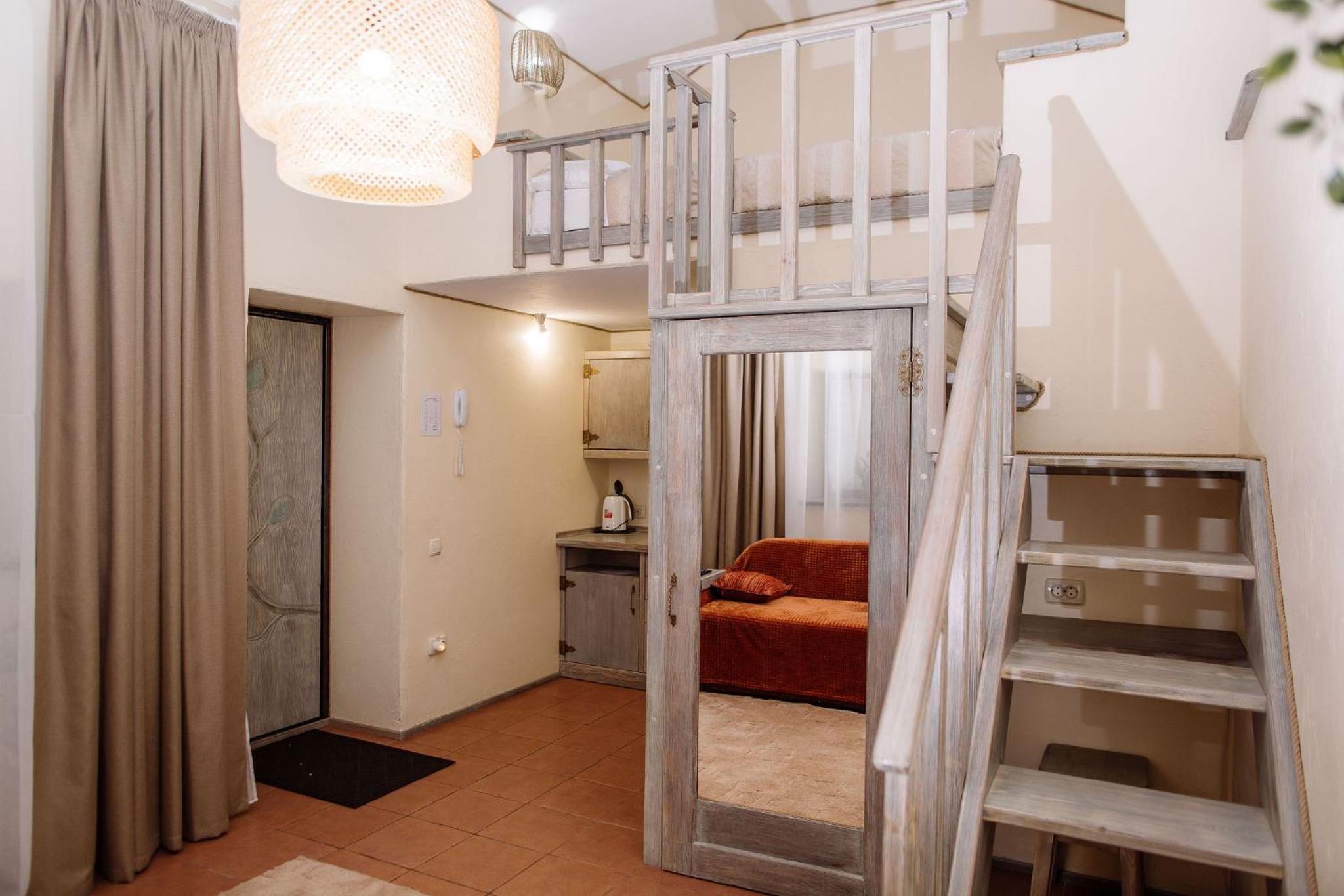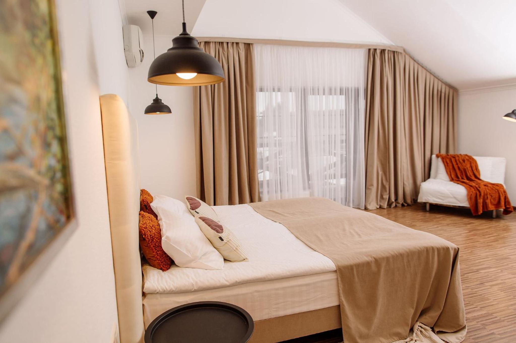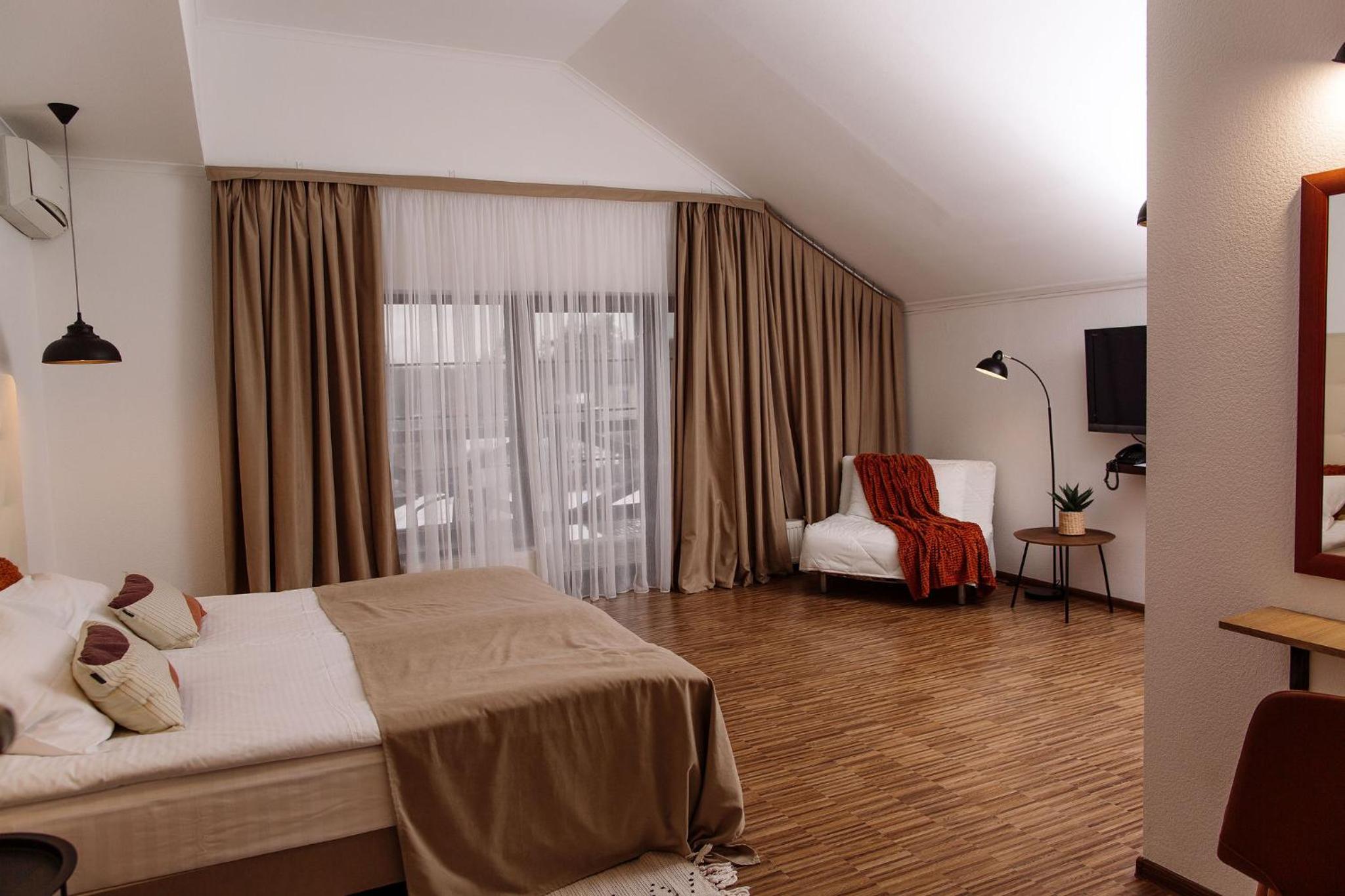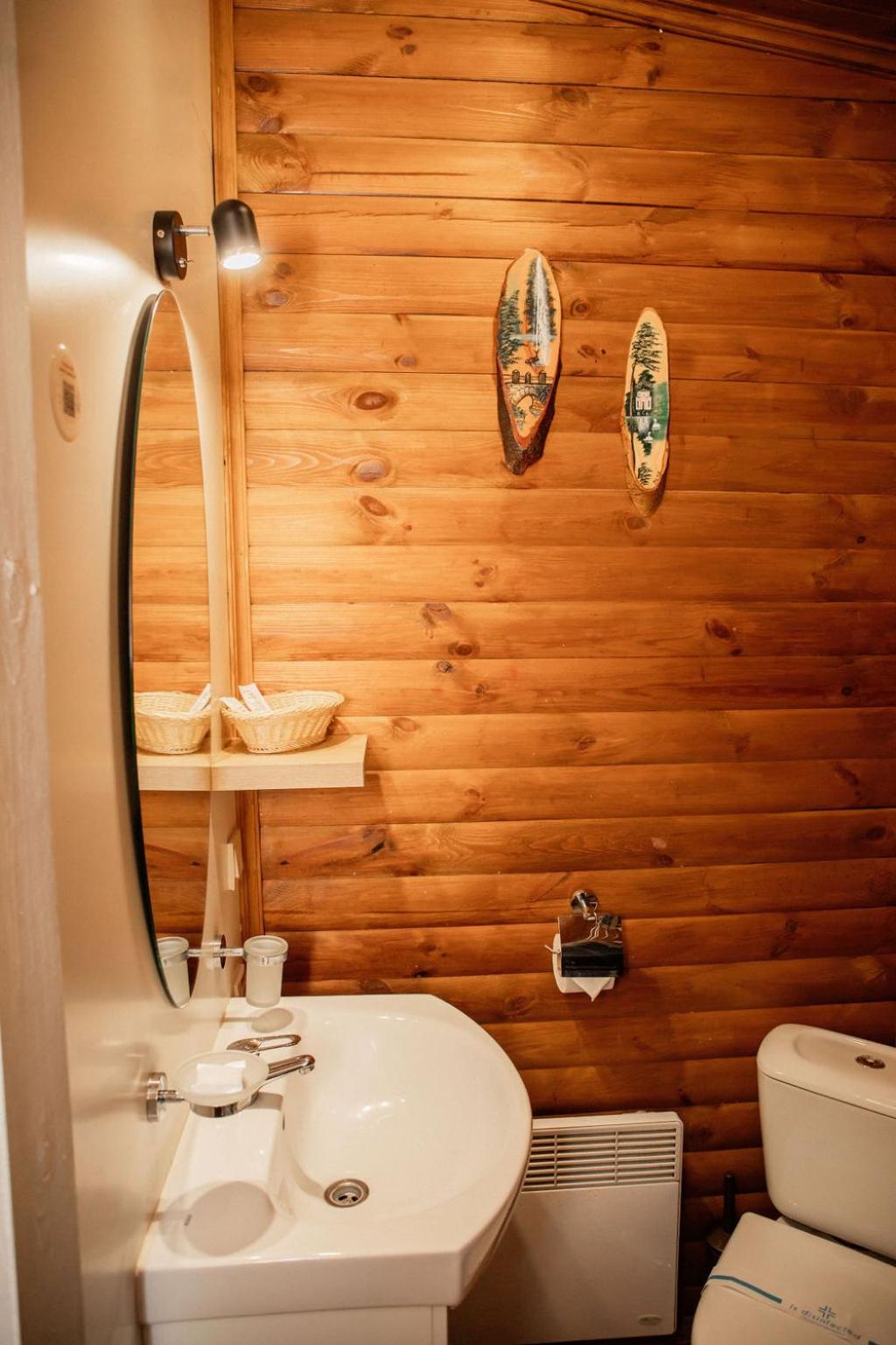 Дуже гарний отель. Все зручно, комфортно і продумано! Номер в дійсності, завдяки розташуванню, здається більший ніж на фото. На другому поверсі величезне ліжко є розетки є широка полка для особистих речей. Додатково брали мангал, дрова були сухі та колоті з розжигом та усім необхідним для приготування м'яса. Також на території є баня, доволі вмістка підійде навіть для великої компанії. Територія готелю прибрана, доглянута, всі дорожки чисті від снігу! Персонал комплексу привітній і йде на зустріч своїм клієнтам! Гарне місце, гарний відпочинок. Дуже рекомендую!!!
