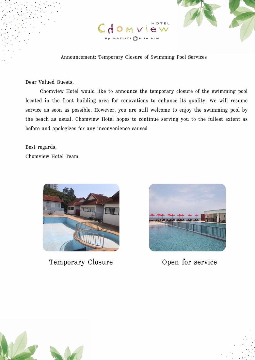 Please be informed that due to required repairs, the swimming pool will be closed from 19 November to 29 November 2023.