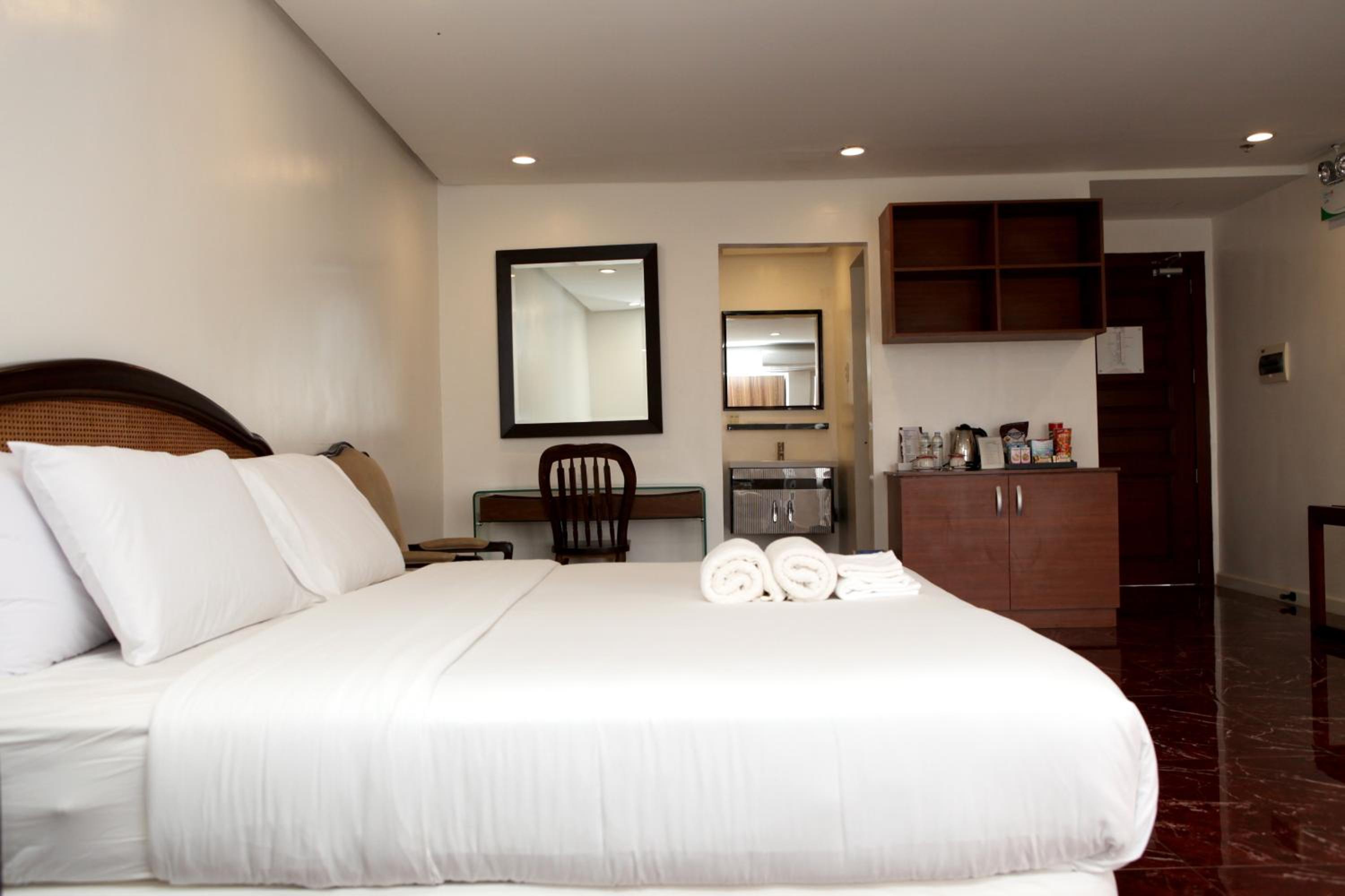 Big room, 2 beds: 1 queen (king?) and 1 twin, separate toilet and bath, bath robes, slippers. SM Hypermart and Cafe Ella downstairs.
