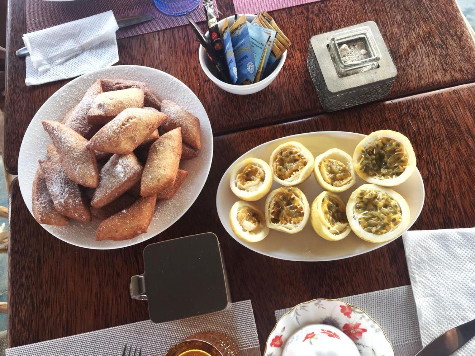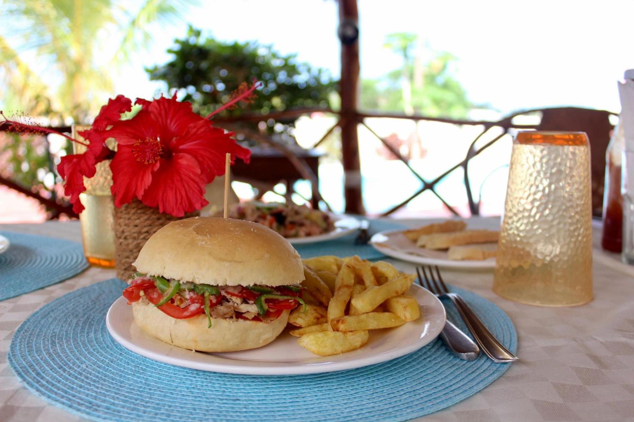 Le petit déjeuner était copieux. Il était composé que de produits locaux (jus de fruit frais, fruits de l'île, des chapatis, pancake, pain grillé avec confiture, petit beignet, etc.). Il était servi à l'heure que l'on souhaitait. Il en est de même pour le diner. A chaque repas, on découvrait des produits locaux. Tout est "fait maison" et sur place (même le pain de l'hamburger et la glace sont "fait maison").