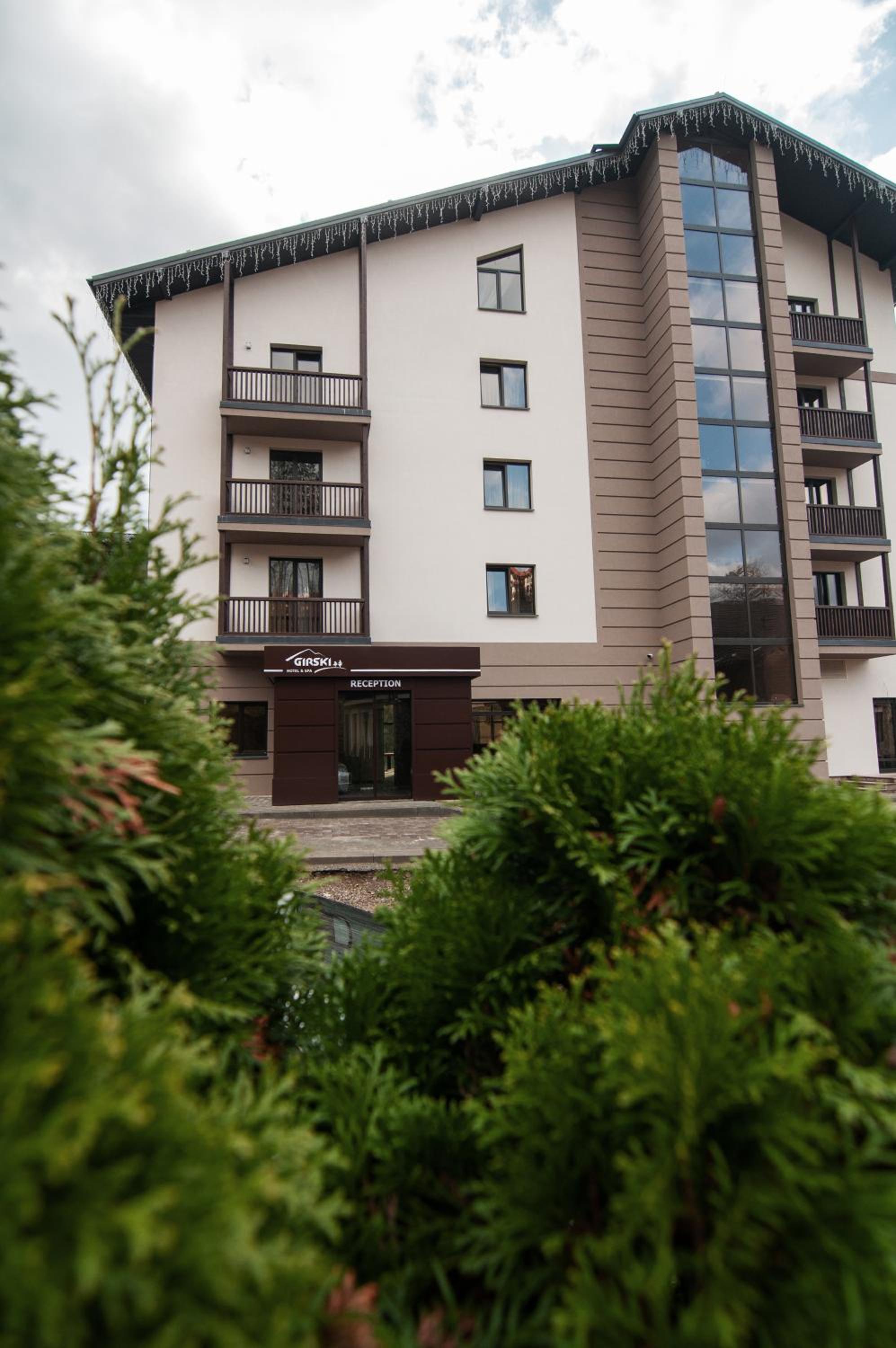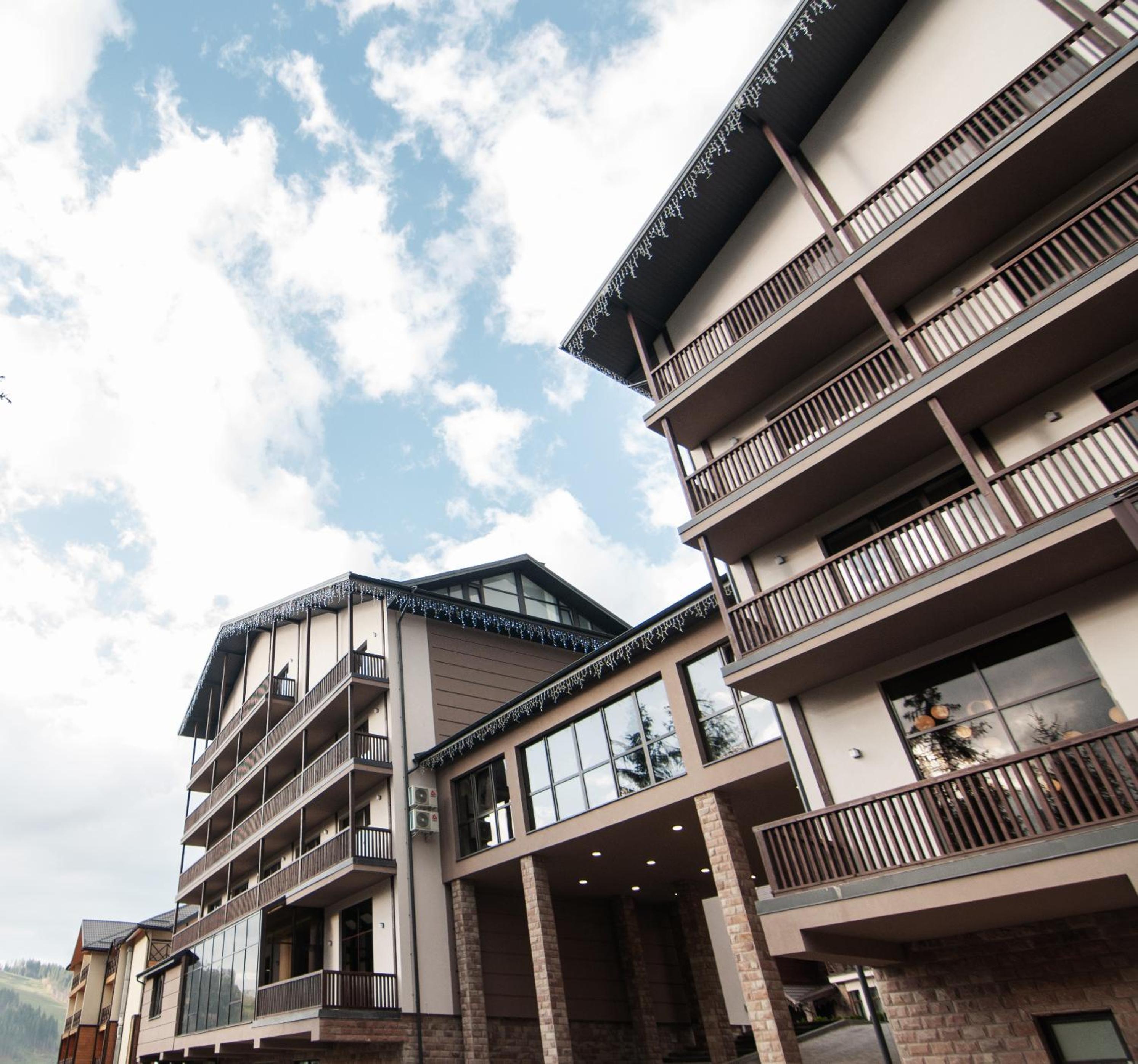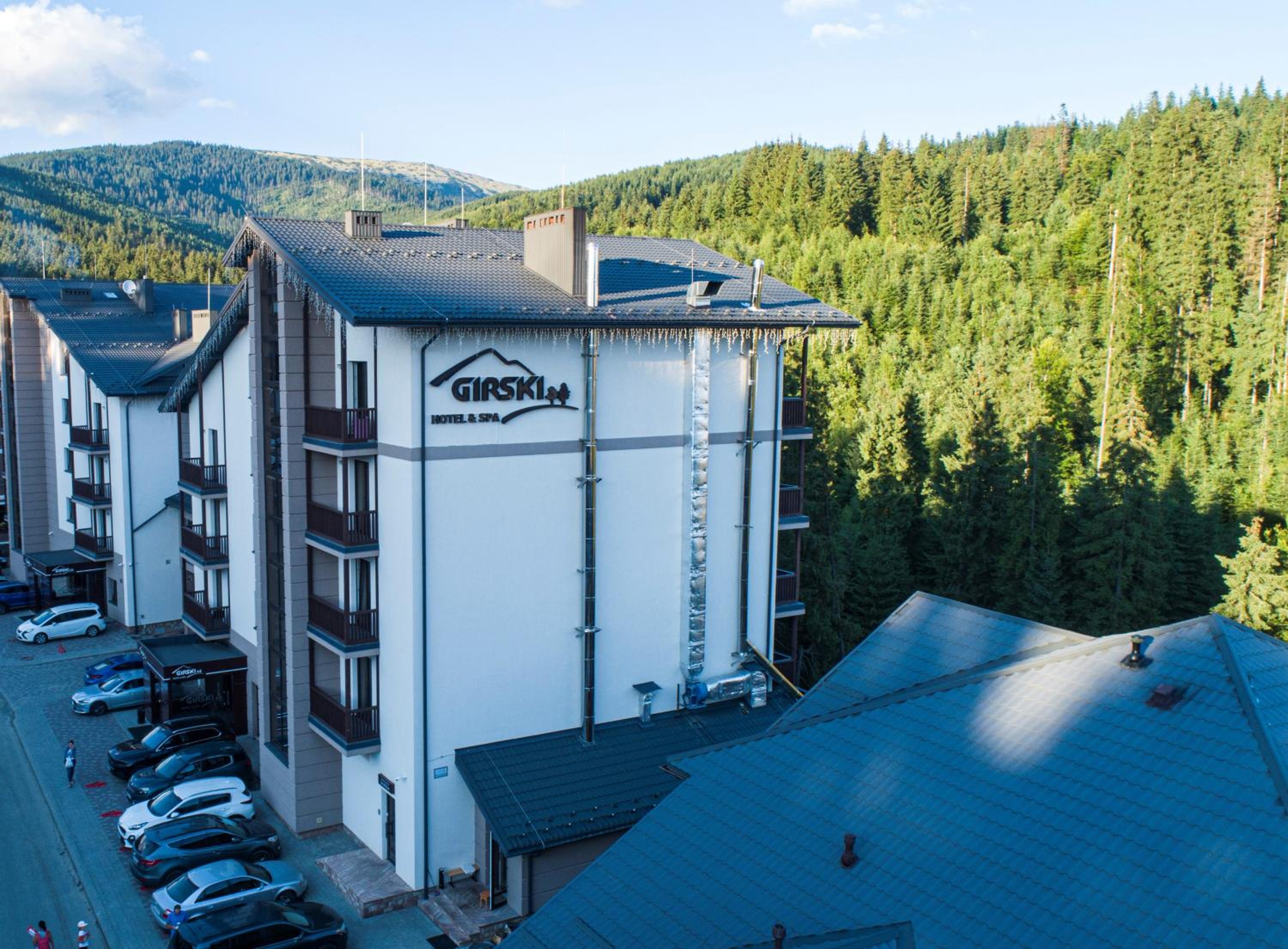 Girski Hotel&Spa in Bukovel offers elegant rooms with stunning mountain views, private balconies, and modern amenities like flat-screen TVs and plush bedding. Safety deposit boxes are provided for your peace of mind.