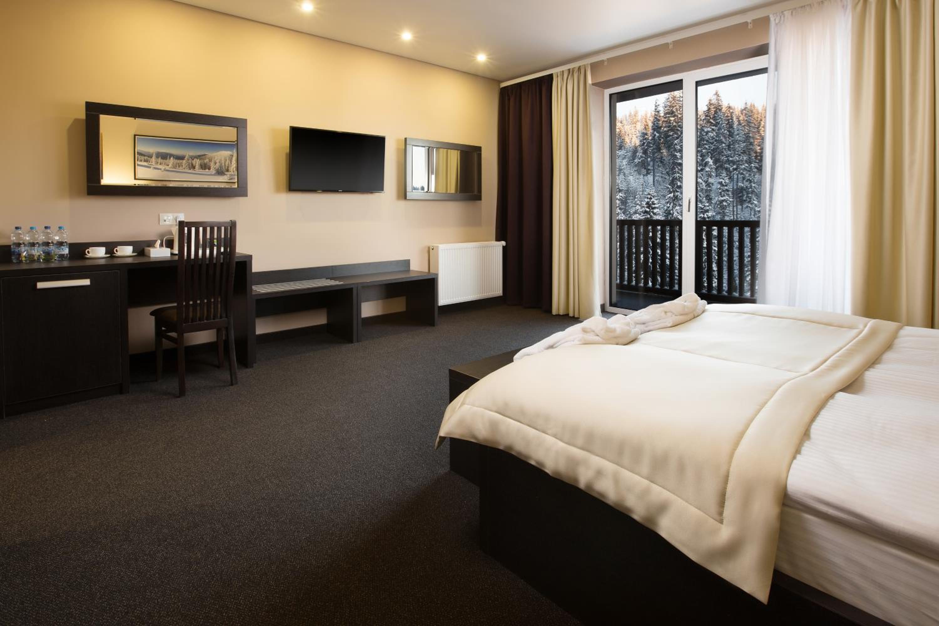Проживали в номері стандарт з видом на ліс, номер просторий, світлий. Кожного дня прибирання, приносили воду, чай/кава, замінювали рушники.
