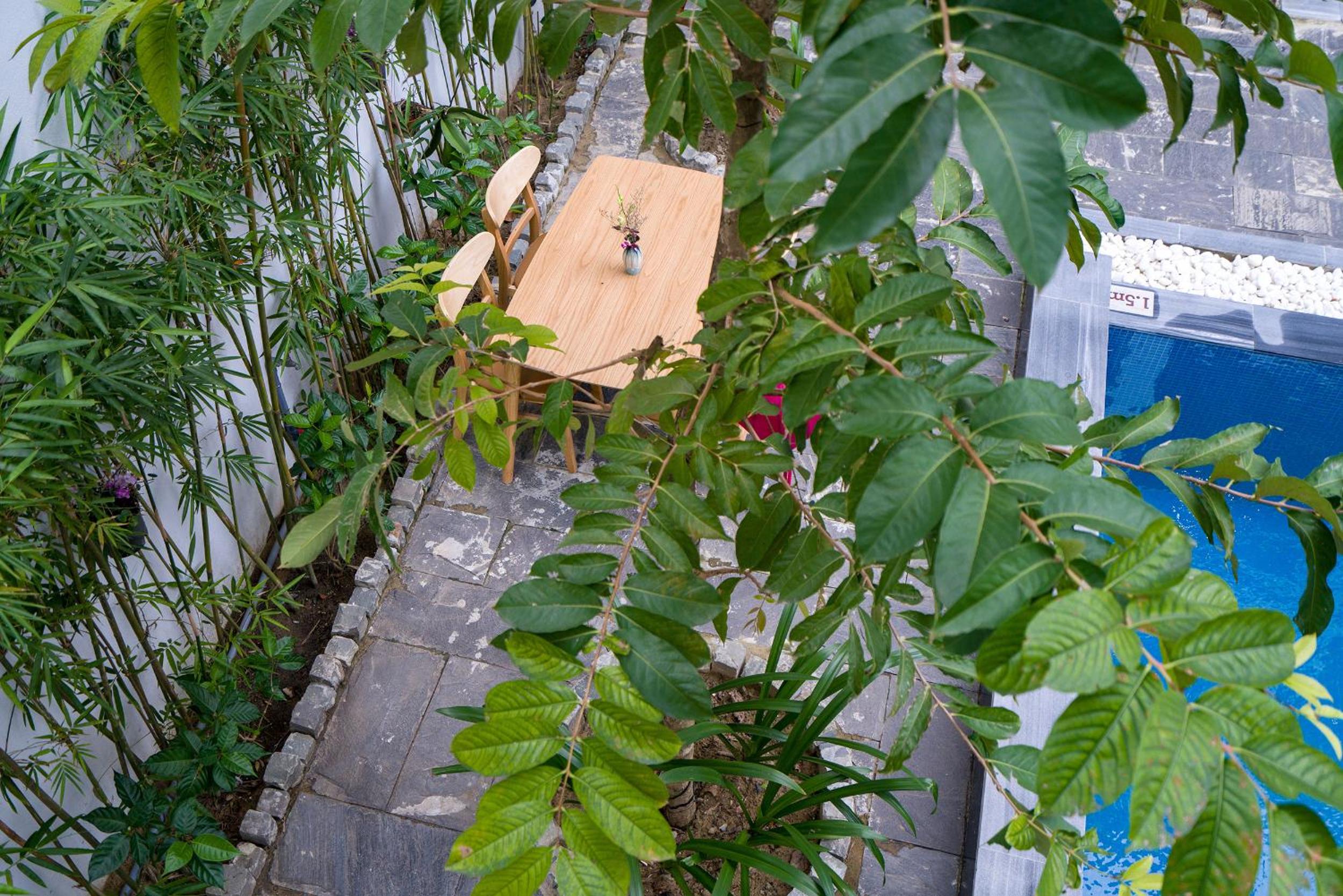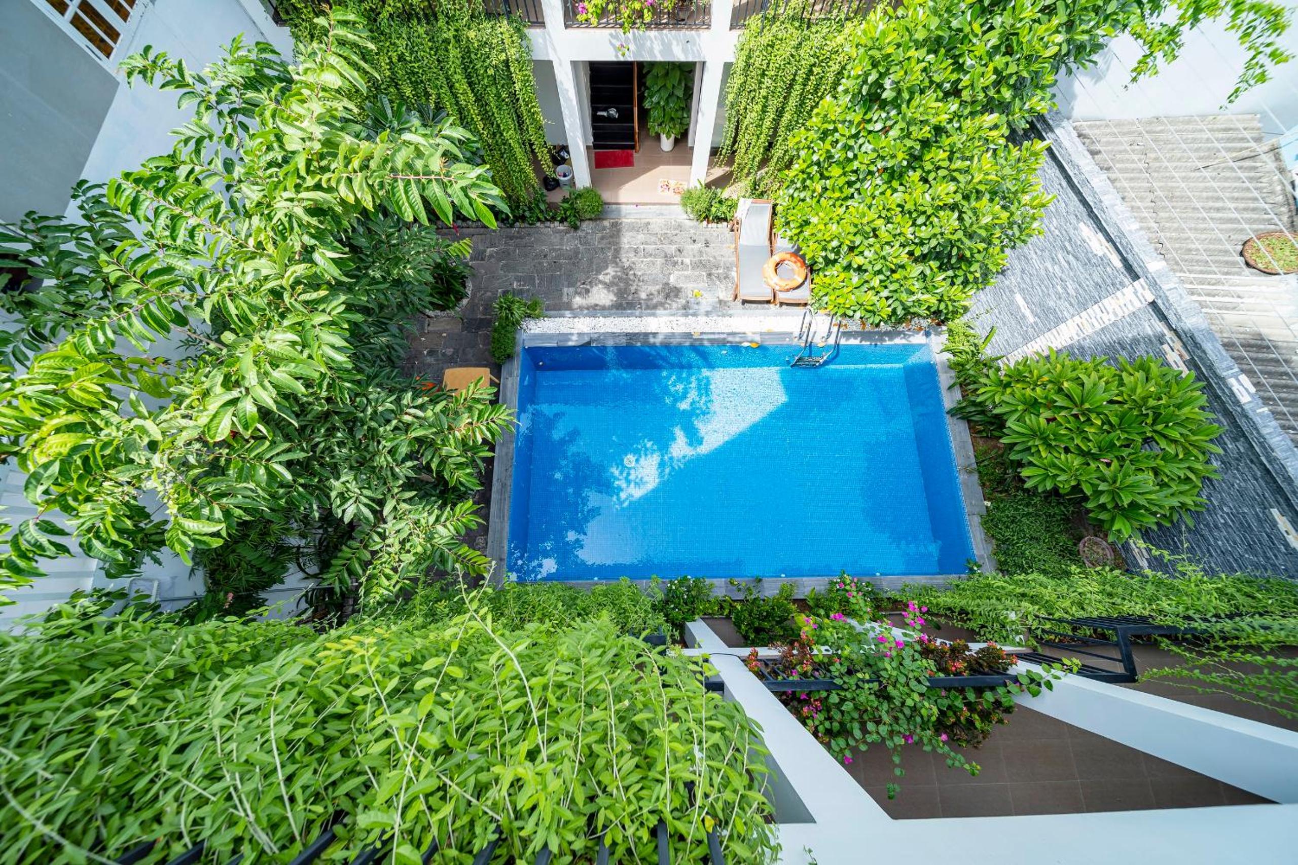 Hồ bơi thì rất trong xanh, sạch sẽ, có không gian cây xanh thư giãn xung quanh rất chill.