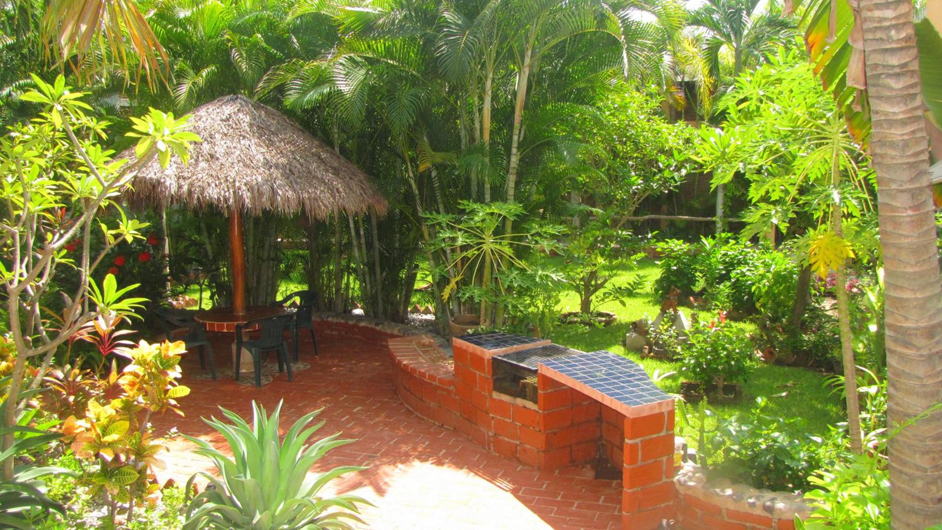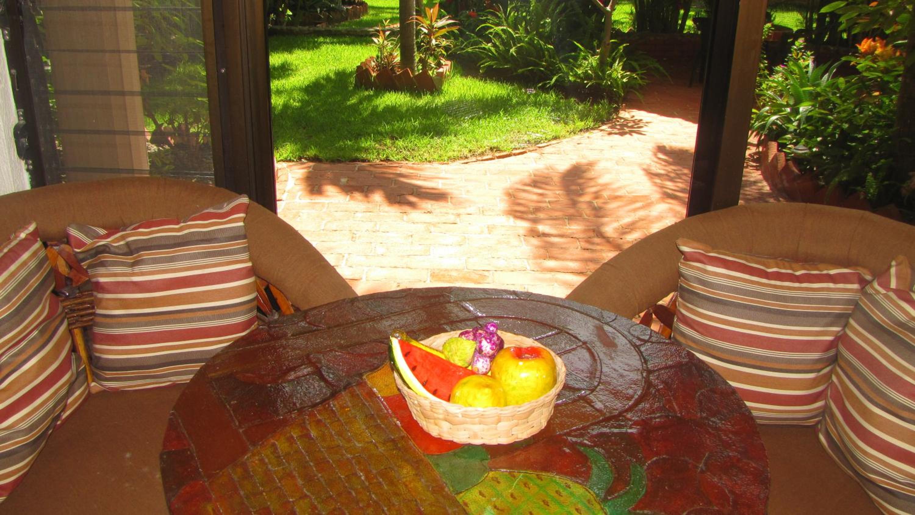 The hotel grounds are tropically lush and secure. The design makes socializing with other guests at the communal breakfast tables easy. A continental breakfast is provided in the room rate. More substantial breakfasts can be cooked to order. In the late afternoons guests gather to watch the sunset The hotel bar is open in the afternoons and early evenings