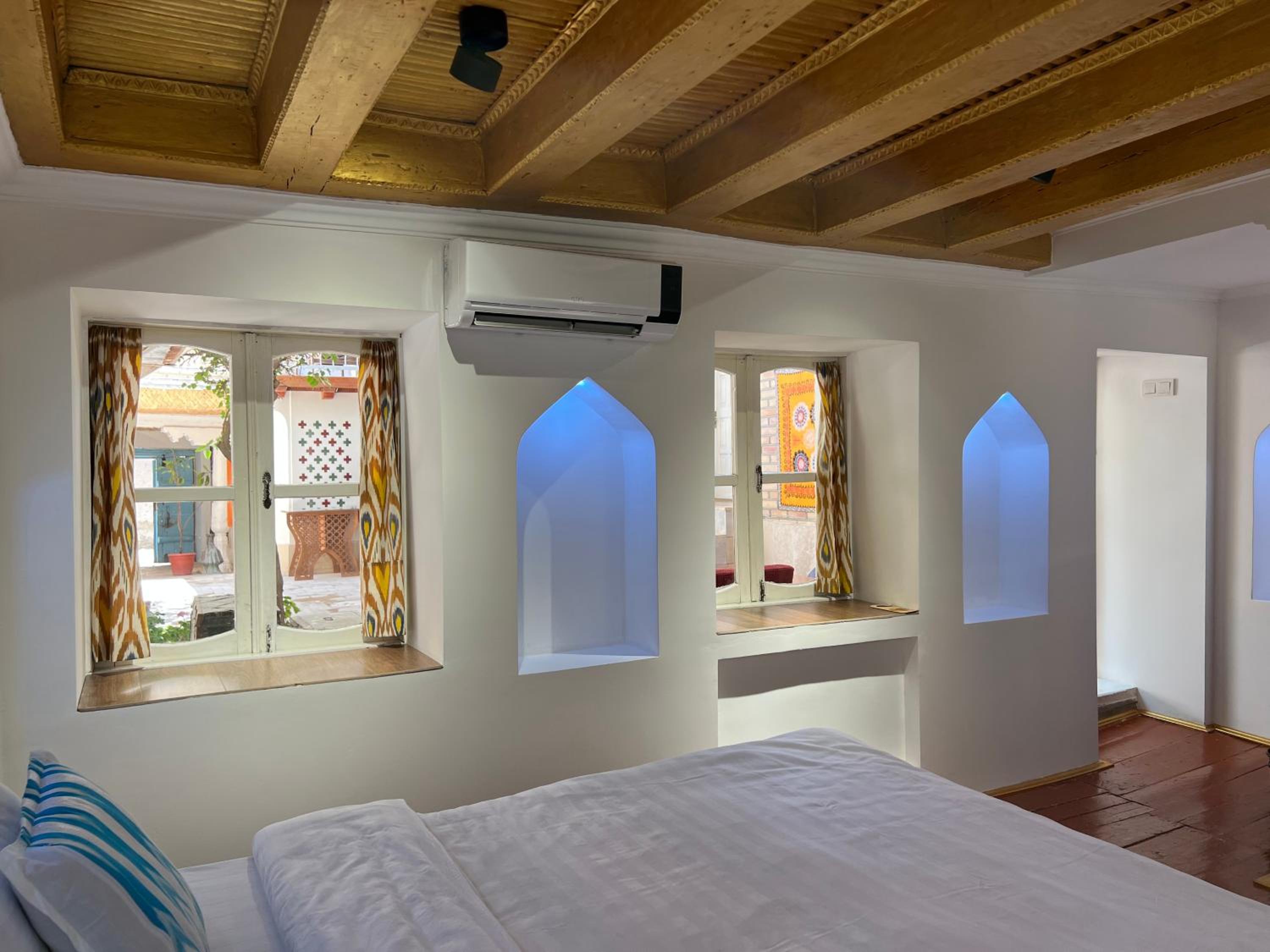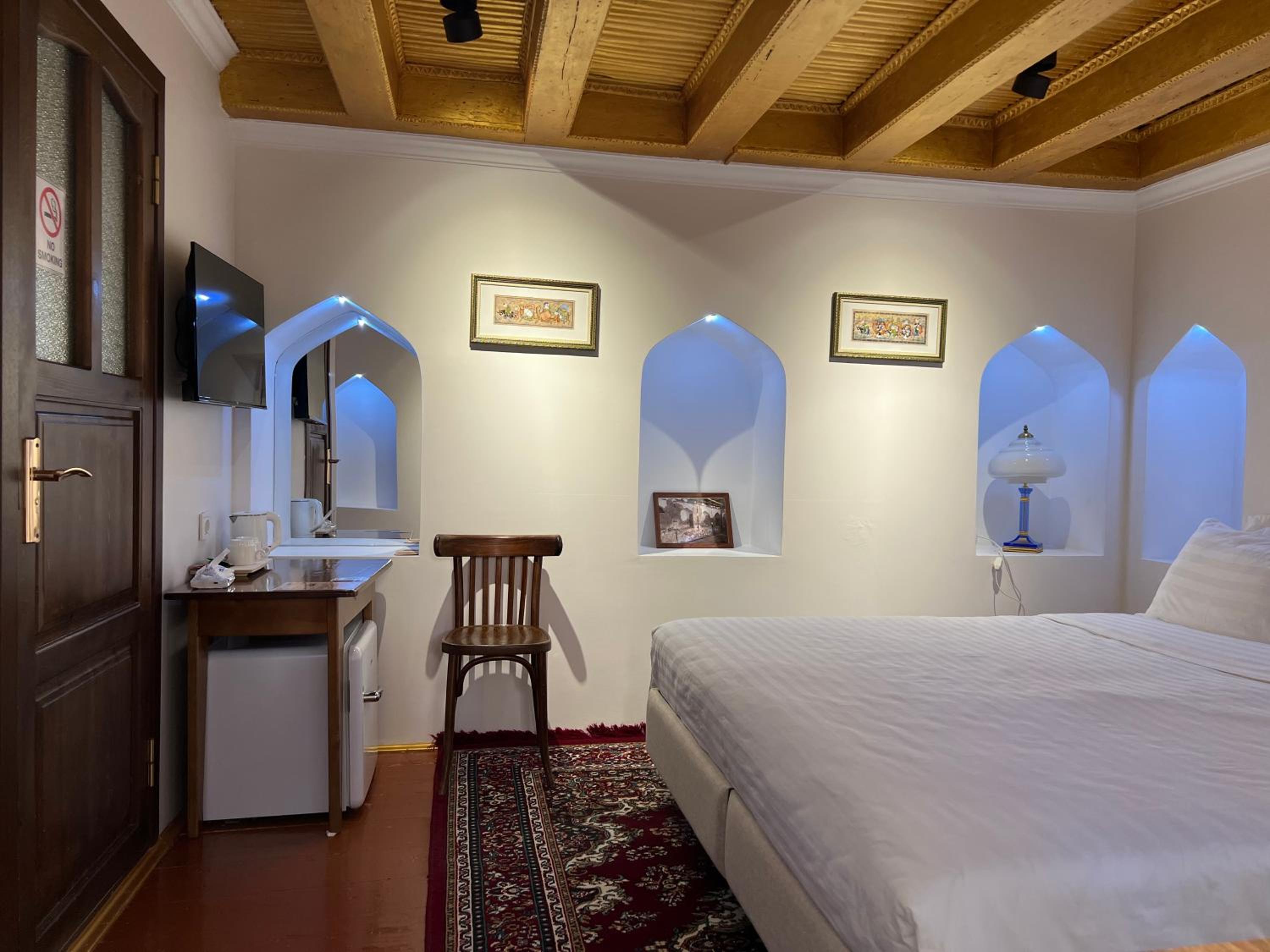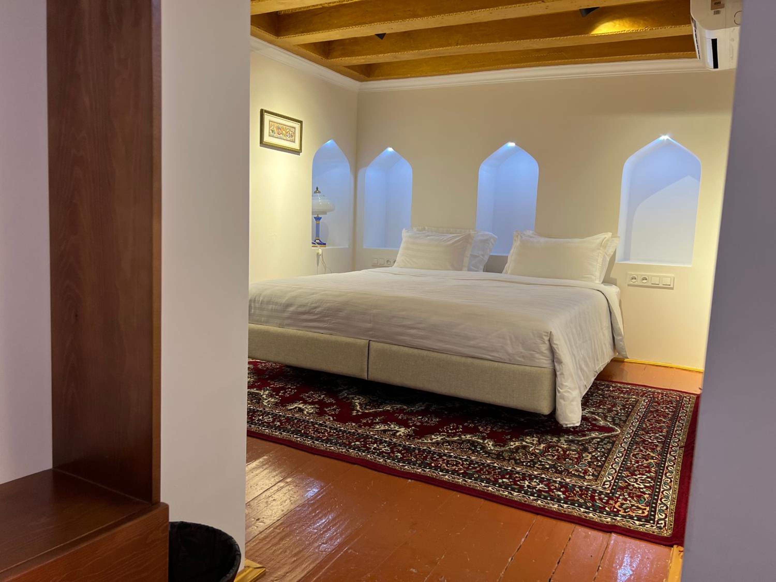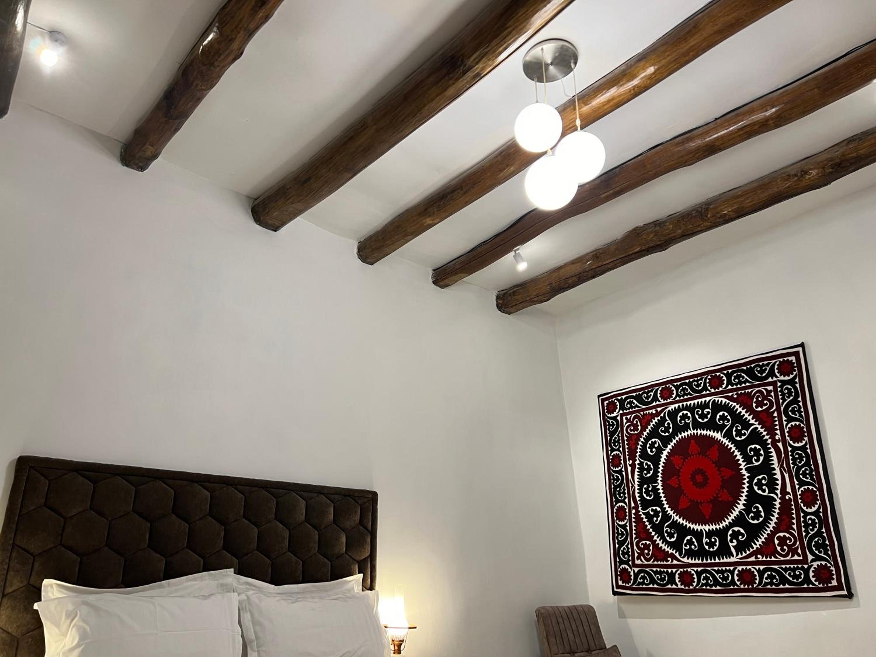 Beautifully preserved family property. Retained age old feel but with modern facilities ( a/c, great shower). The breakfast room was such a beautiful space to enjoy the splendid and plentiful breakfast. Also a late night cop of tea made by Umid when I had to unexpectedly call my son. He and his wife were so kind throughout our stay and made a magical Bukhara yet more special