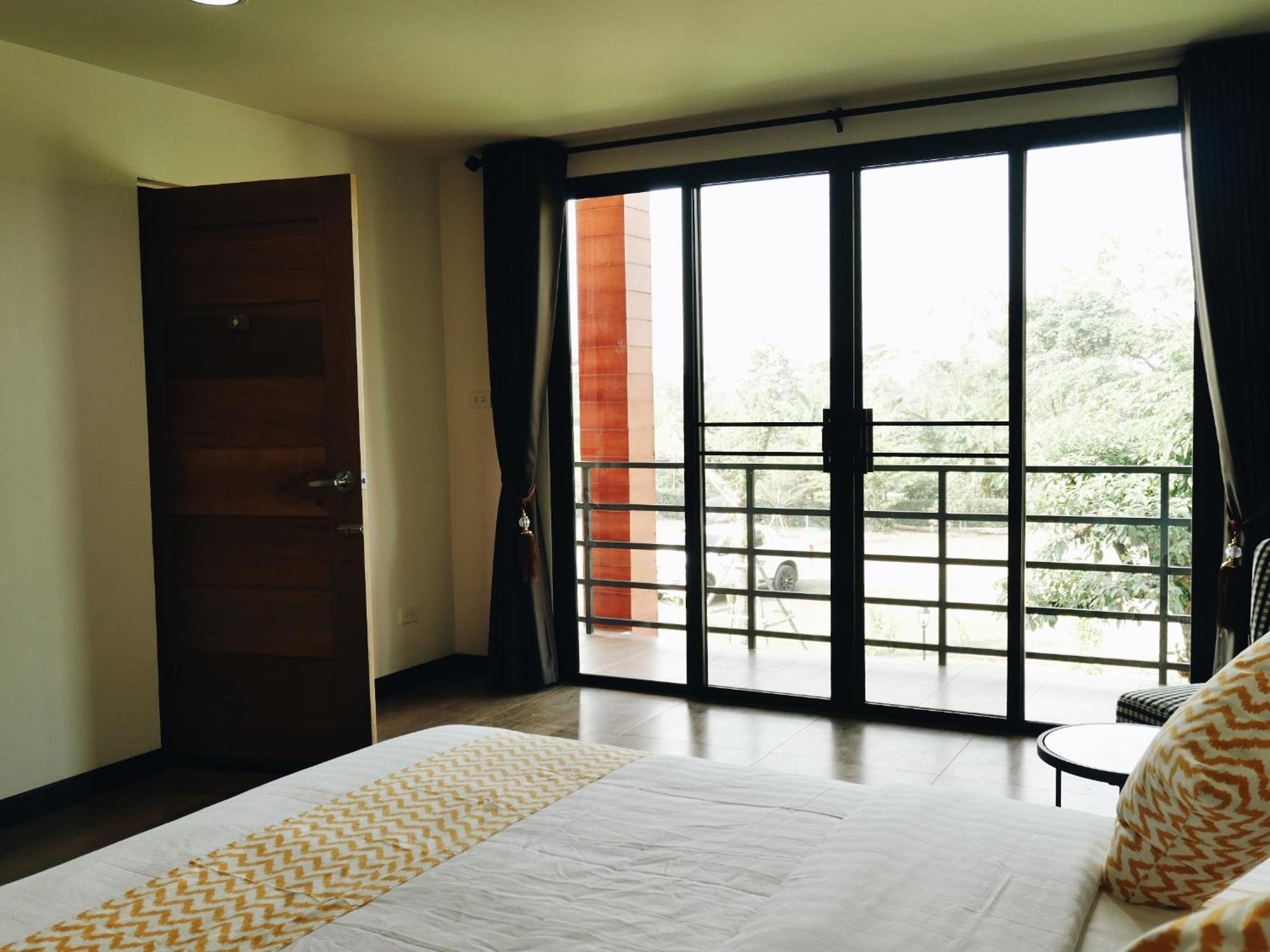 Luxurious Accommodations: Each room at บ้านเพลิน is thoughtfully designed with a desk, flat-screen TV, private bathroom, and a balcony offering stunning mountain views.