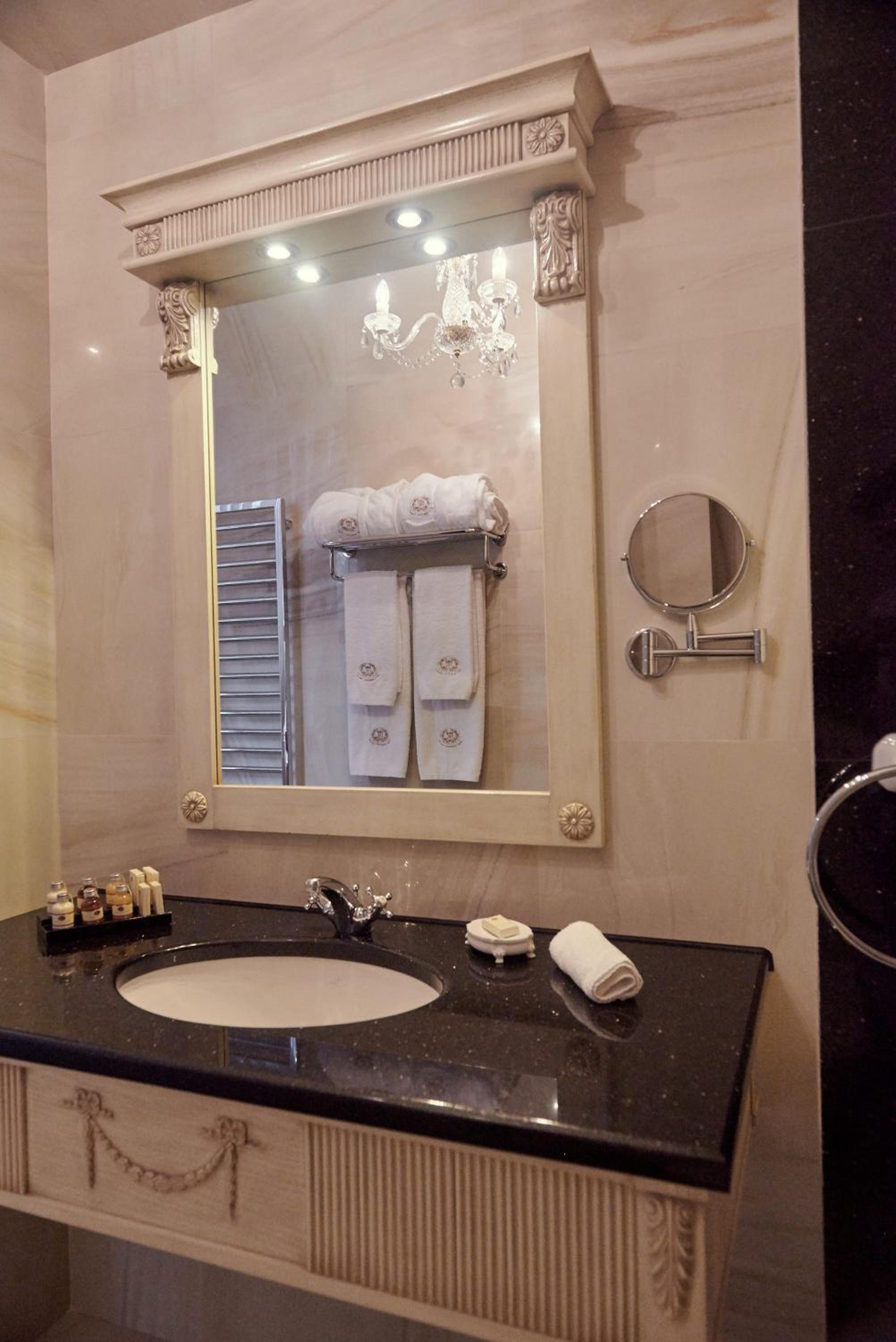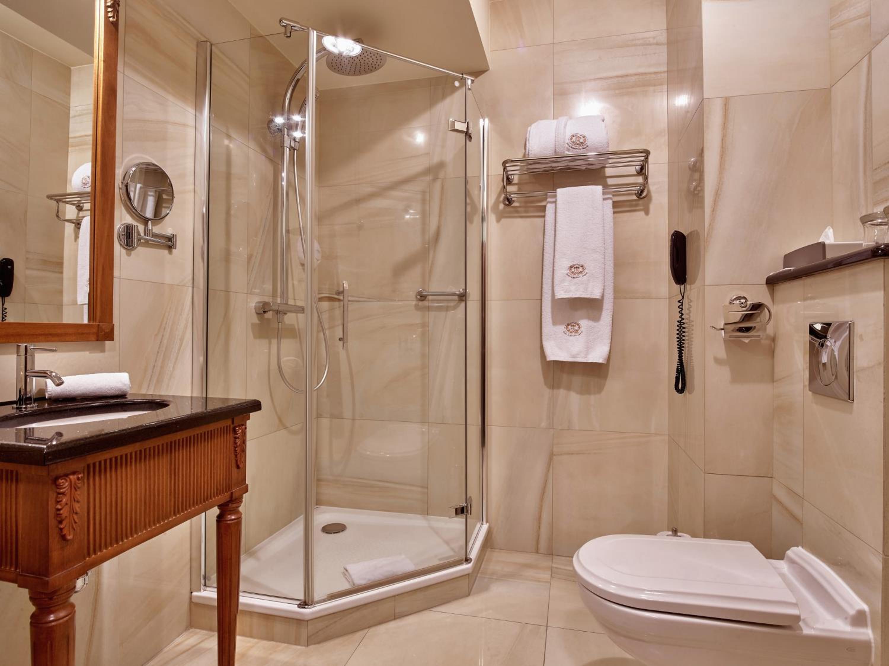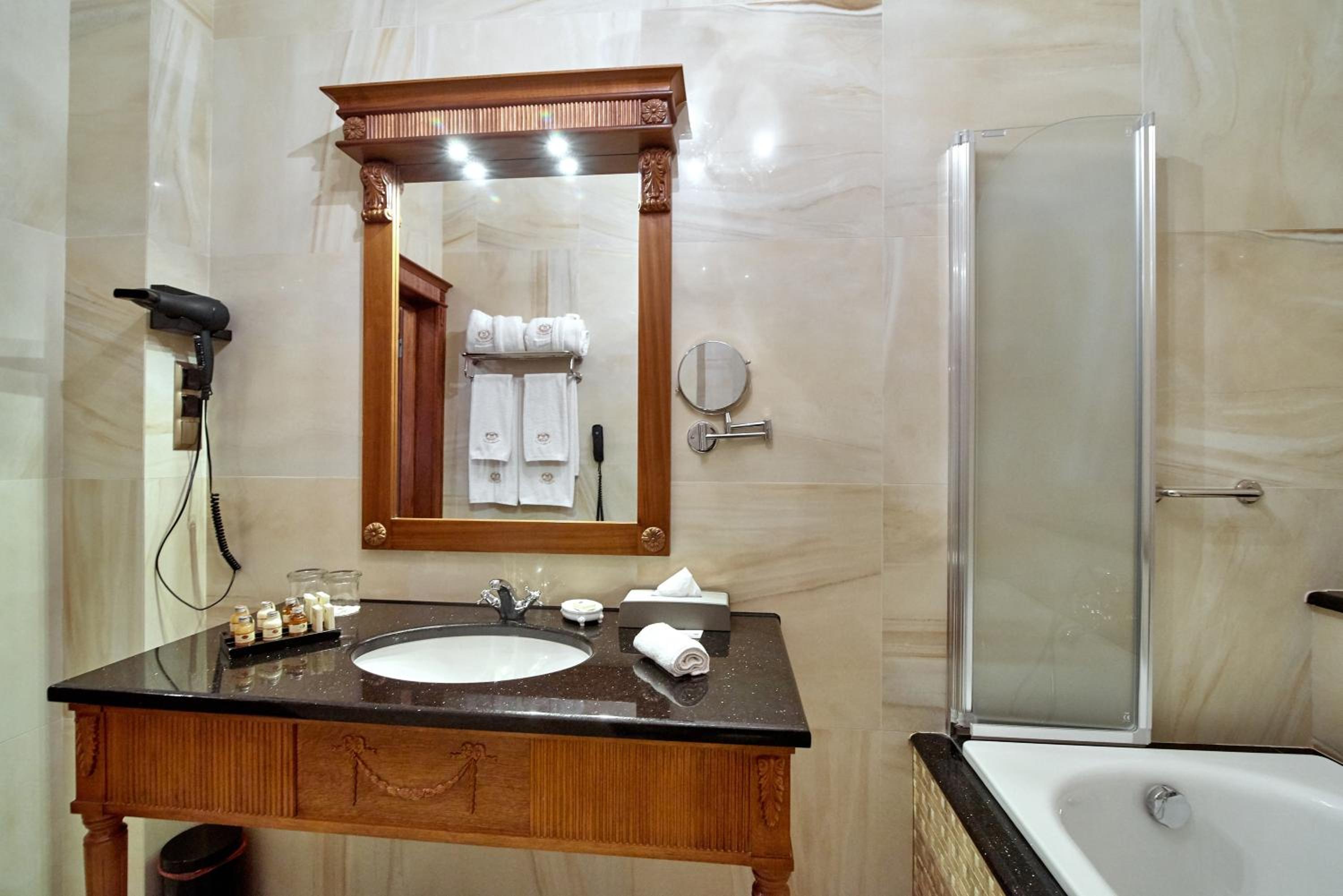 Each room is equipped with a flat-screen TV, laptop safe, and a complimentary mini-bar. The bathroom includes premium toiletries and a choice of shower or bath, ensuring a comfortable stay.