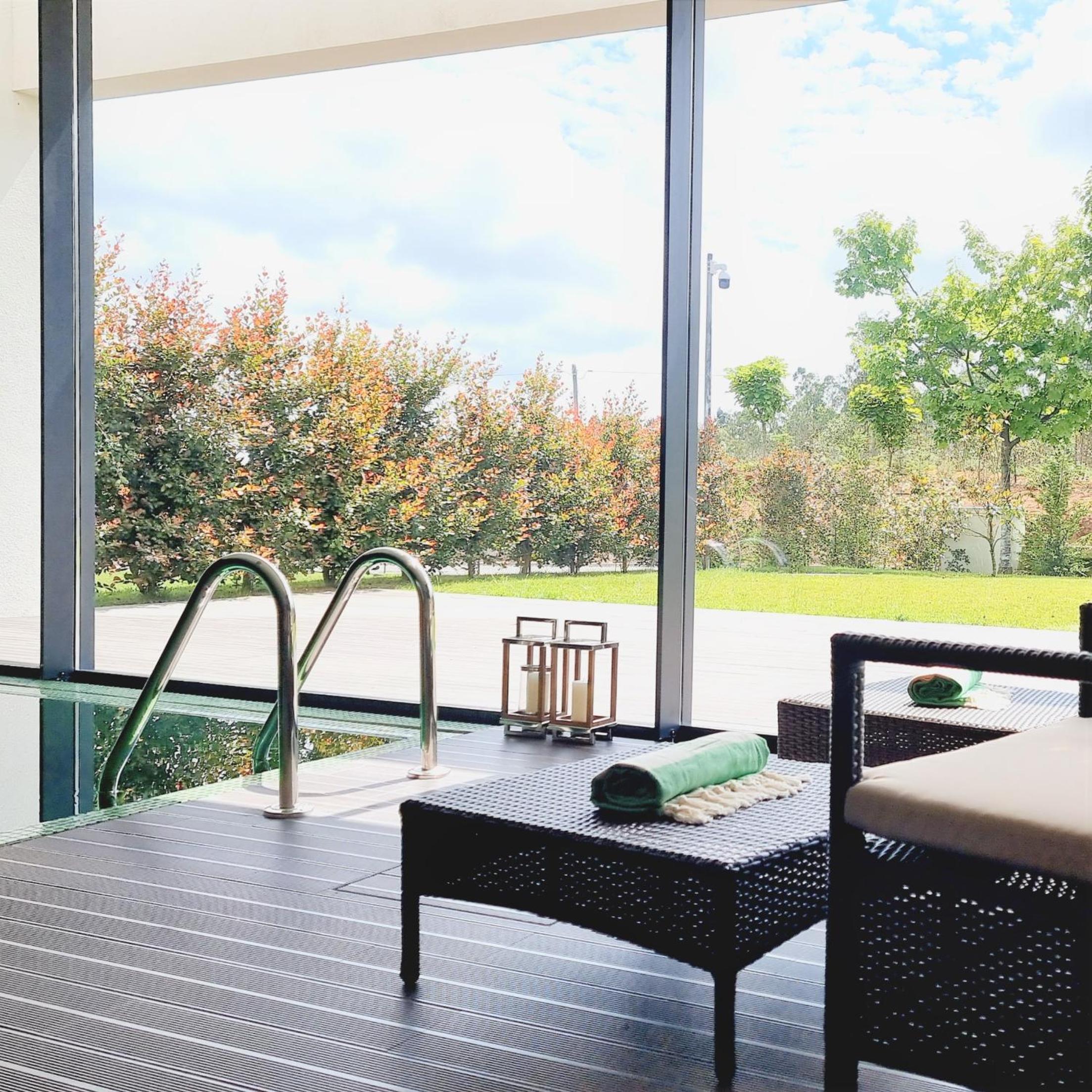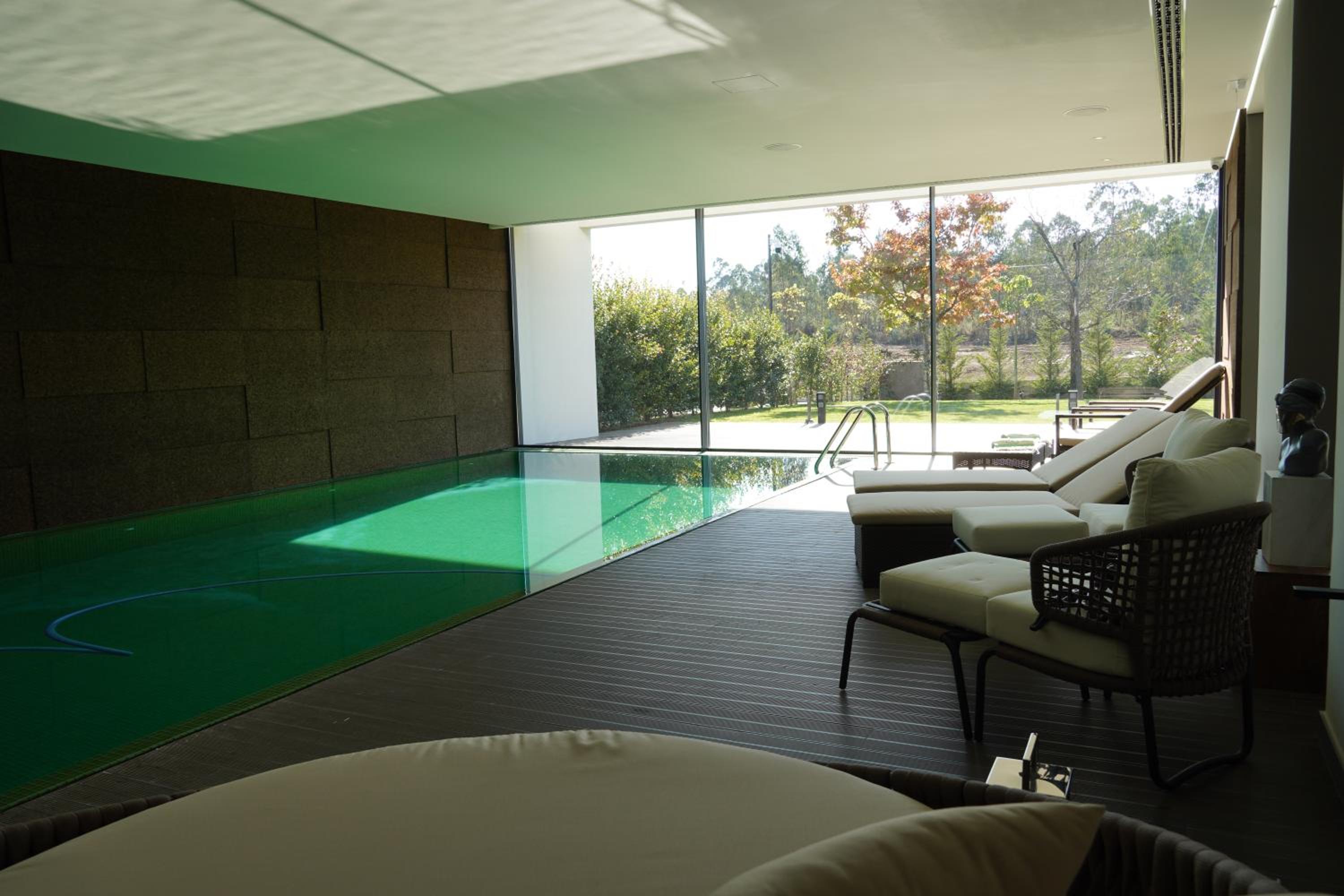 A piscina interior não tinha a água climatizada. Estava fria.