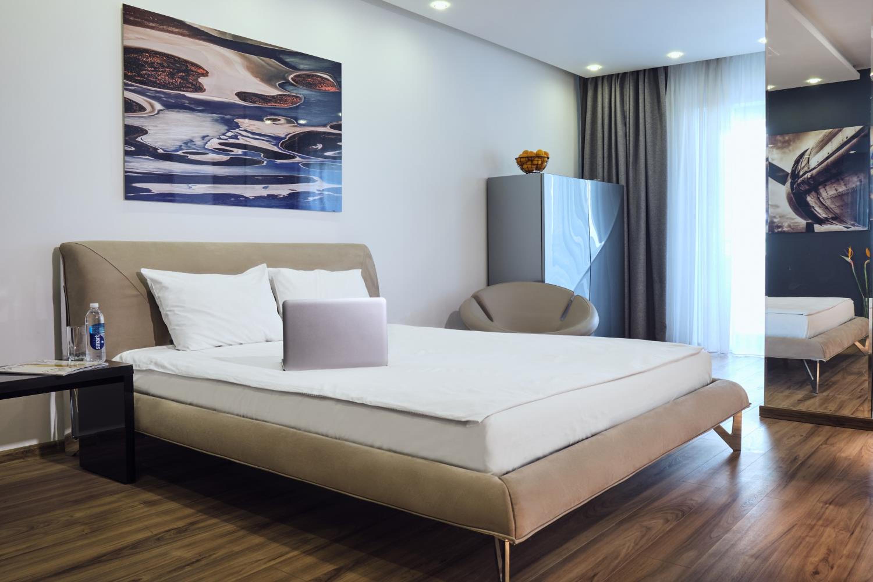 The hotel boasts rooms adorned with soothing pastel hues, featuring grey carpeted floors, private bathrooms with showers, TVs, minibars, and safety deposit boxes for a relaxing stay.