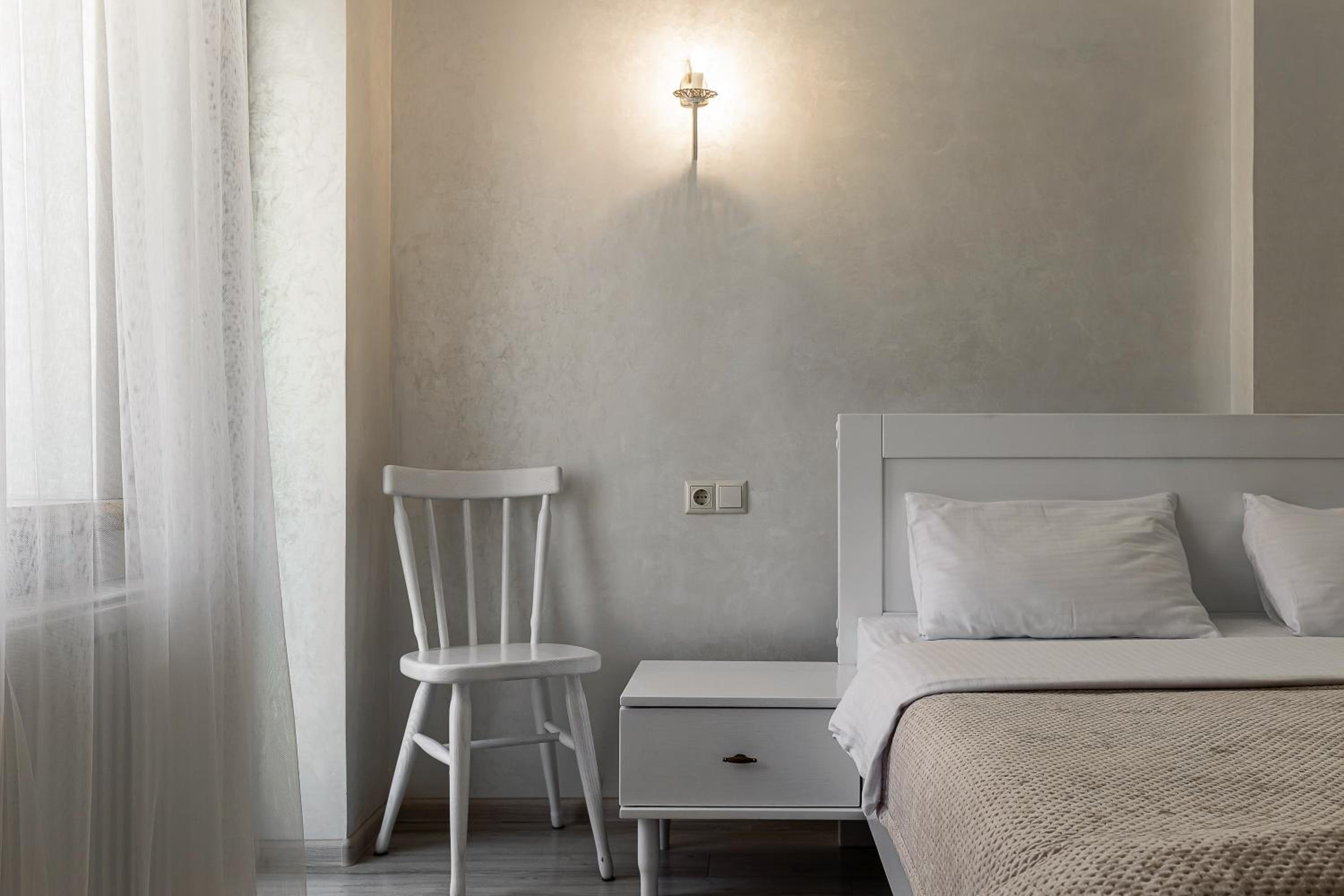 Room looks like old hospital. Old furniture brushed in white. Small space for three persons